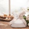 Questa bomboniera è un'elegante alzata bianca a piani perfetta per presentare confettate. La sua struttura è realizzata in cartoncino bianco perlato e comprende sacchettini portaconfetti che uniscono la rusticità della juta alla delicatezza dell'organza in rosa o celeste. È un'opzione affascinante per celebrare eventi speciali come nascite, battesimi o il...