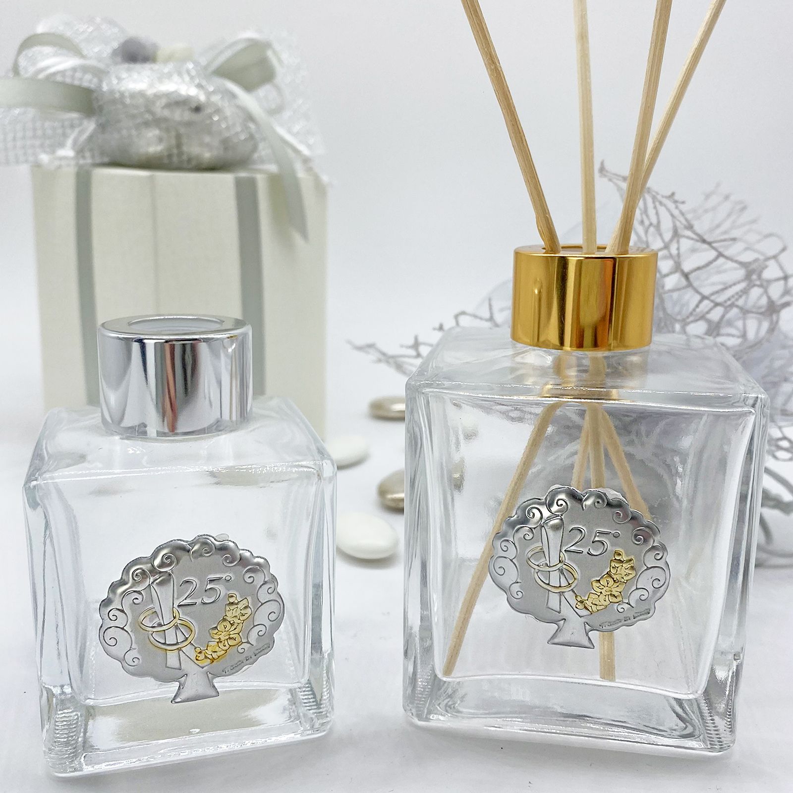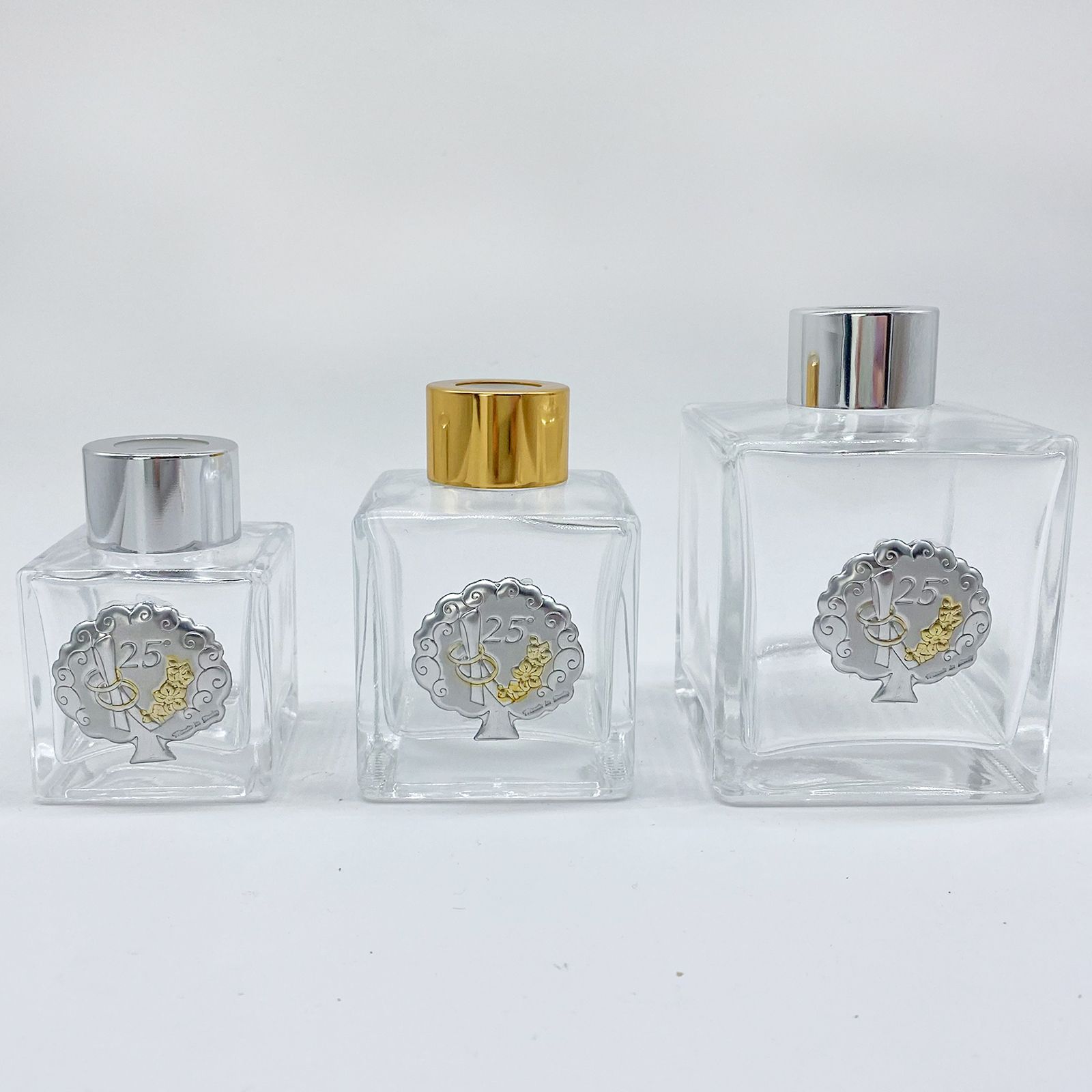 Acquista su ingrossoerisparmio.com queste bottiglie in vetro, a base cubica con un pratico tappo interno in silicone e una placchetta argentea a forma di albero della vita con la rappresentazione di due fedi incrociate (in tonalità oro) e del numero 25.