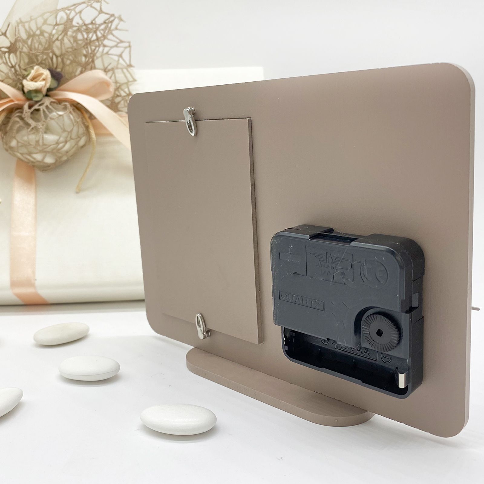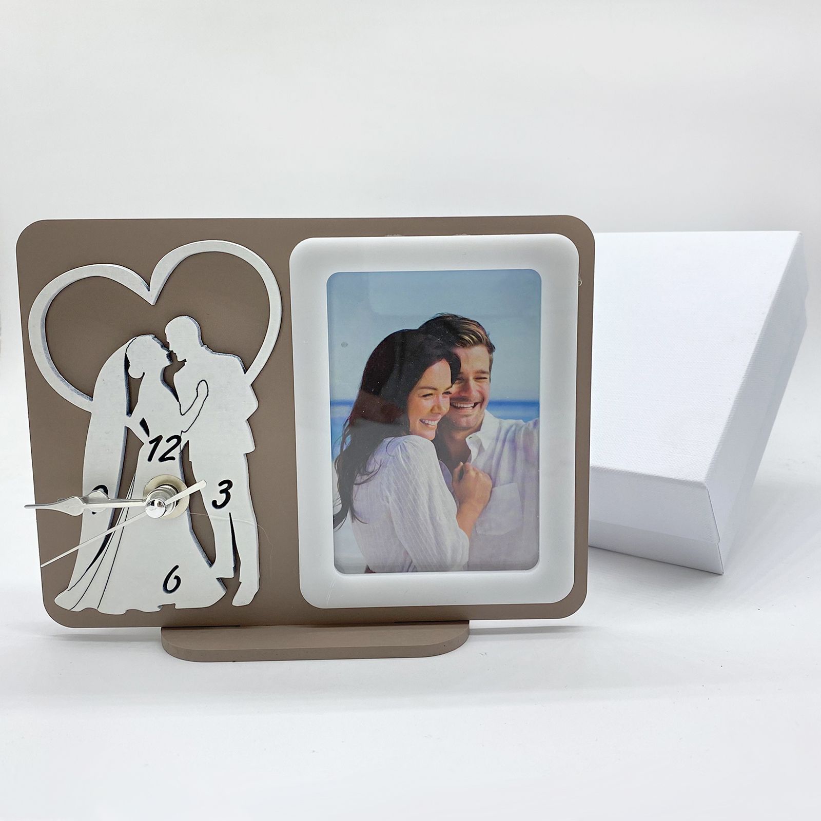 Per te disponibili questi orologi da tavolo con cornice portafoto incorporata in legno color tortora, con raffigurazione sul quadrante di due sposi incorniciati da un cuore in bianco. Le lancette dell'orologio sono in metallo argentato e il meccanismo è fissato sul retro dove va collocata anche la batteria AA da 1,5 volts necessaria per il funzionamento (non inclusa).
