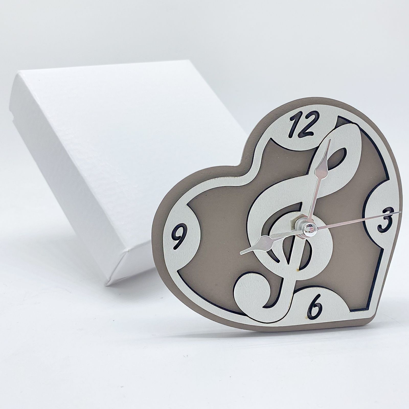 Disponibili per te questi splendidi orologi da tavolo a forma di cuore con struttura in legno doppiato in due colori, per fondo e base in tonalità tortora e per il quadrante in bianco. Il centro dell'orologio è decorato con una chiave di violino, con lancette in metallo color argento. L'orologio è alimentato da una batteria da 1,5 volts (AA - non inclusa).