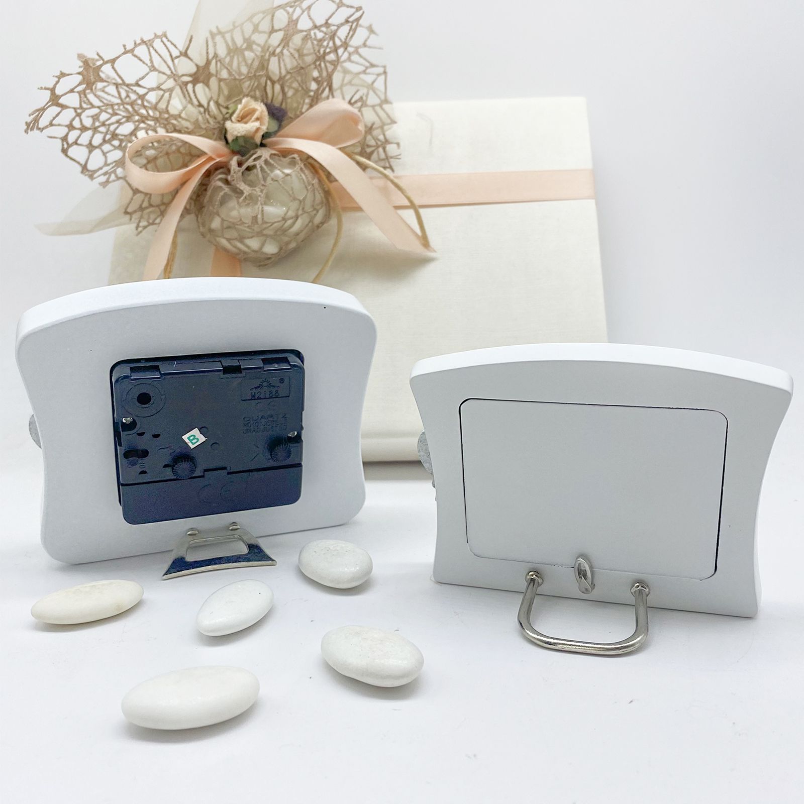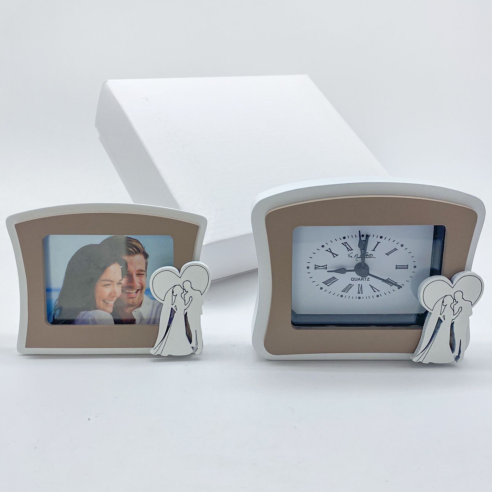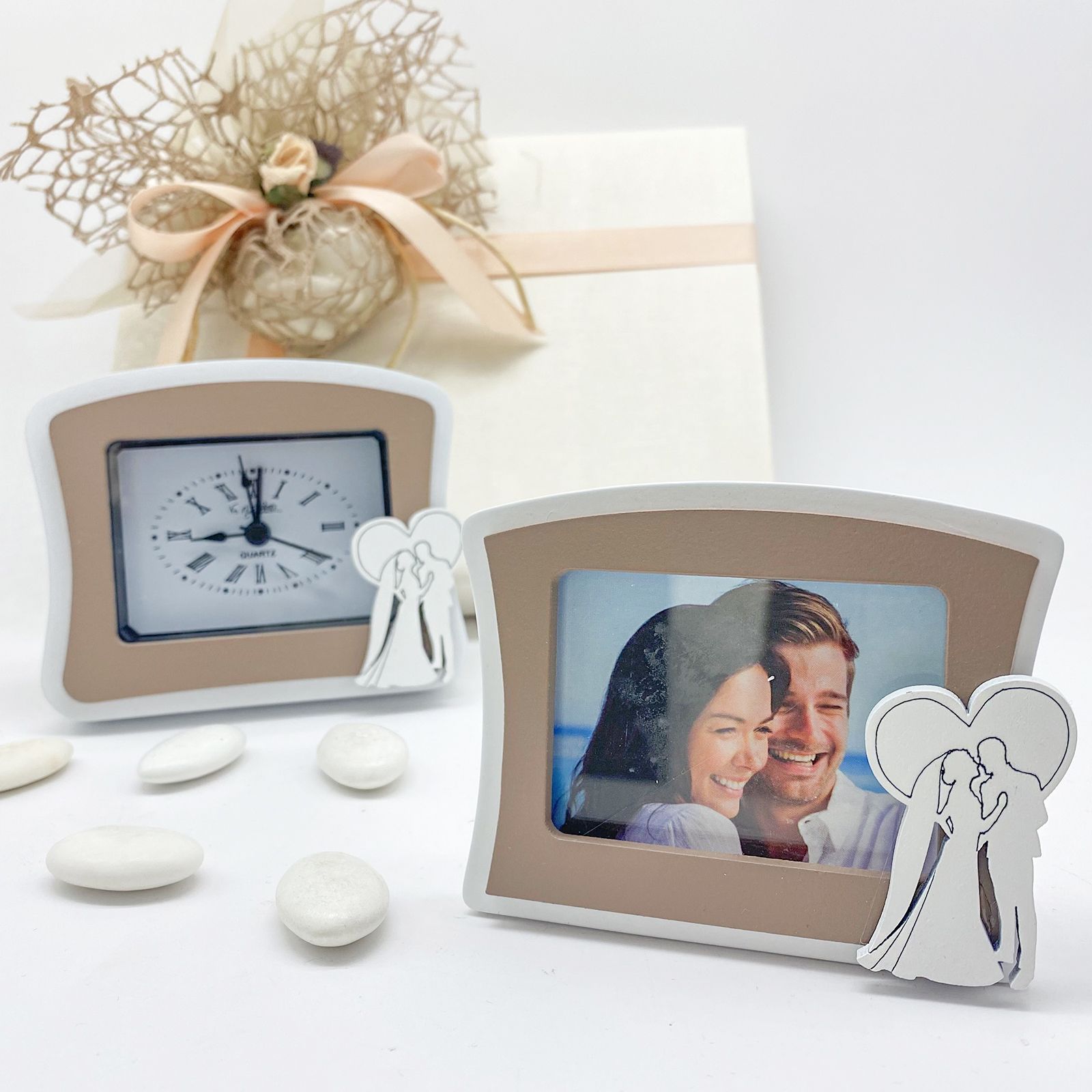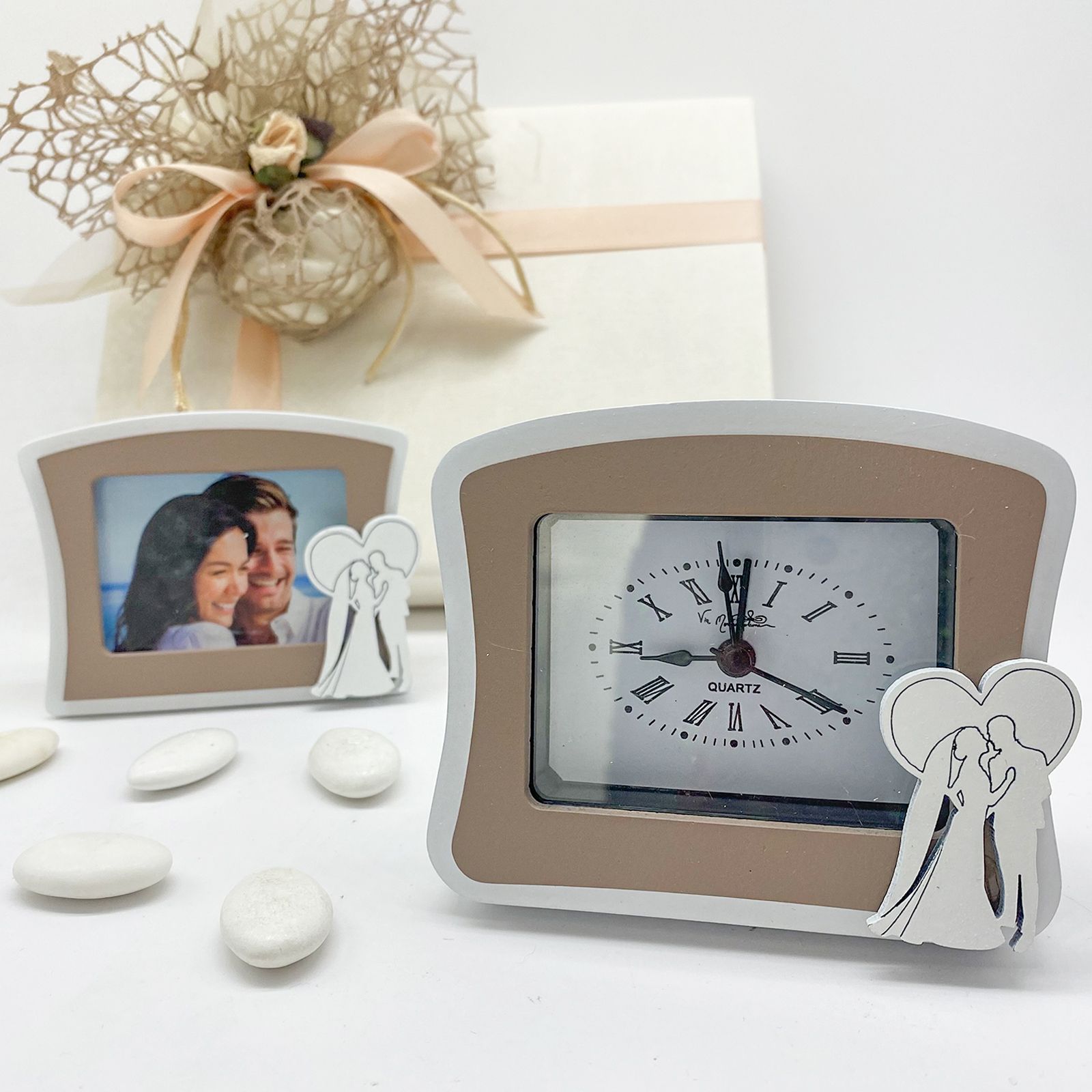 Scegli questo piccolo ma funzionale set contenente una cornice portafoto ed un orologio analogico da tavolo, entrambi in legno bianco con particolari color tortora e sulla base raffigurata una coppia di sposi incorniciati da un cuore.