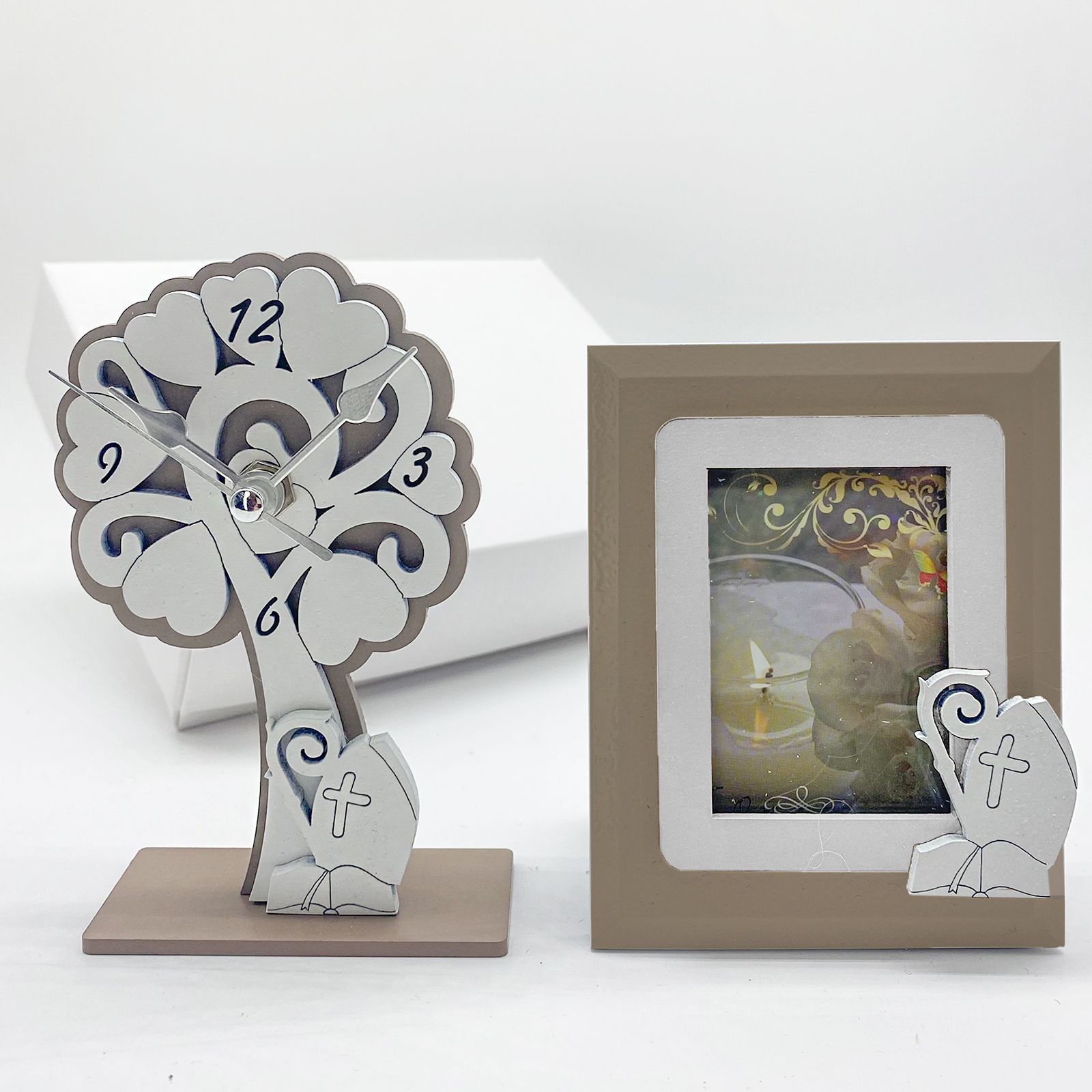 Disponibili per te questi set composti da orologio e cornice da tavolo, in doppio colore tortora e bianco.