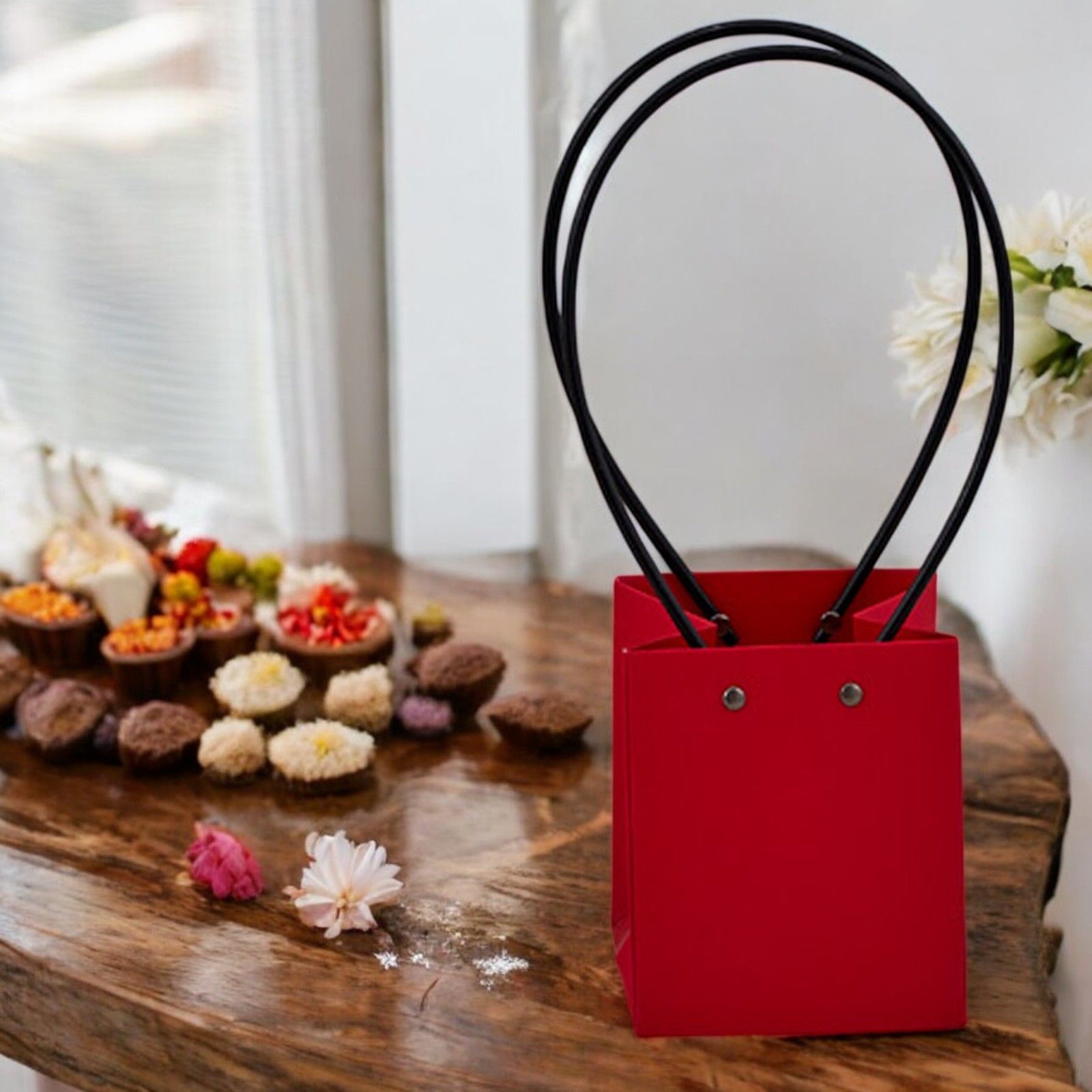 Le dimensioni di questa busta sono 13x12x10 cm, perfette per contenere dolci, confetti o piccoli oggetti da regalare ai tuoi invitati. Il colore rosso vibrante aggiunge un tocco di eleganza e raffinatezza, mentre i manici la rendono comoda da trasportare durante l'evento.