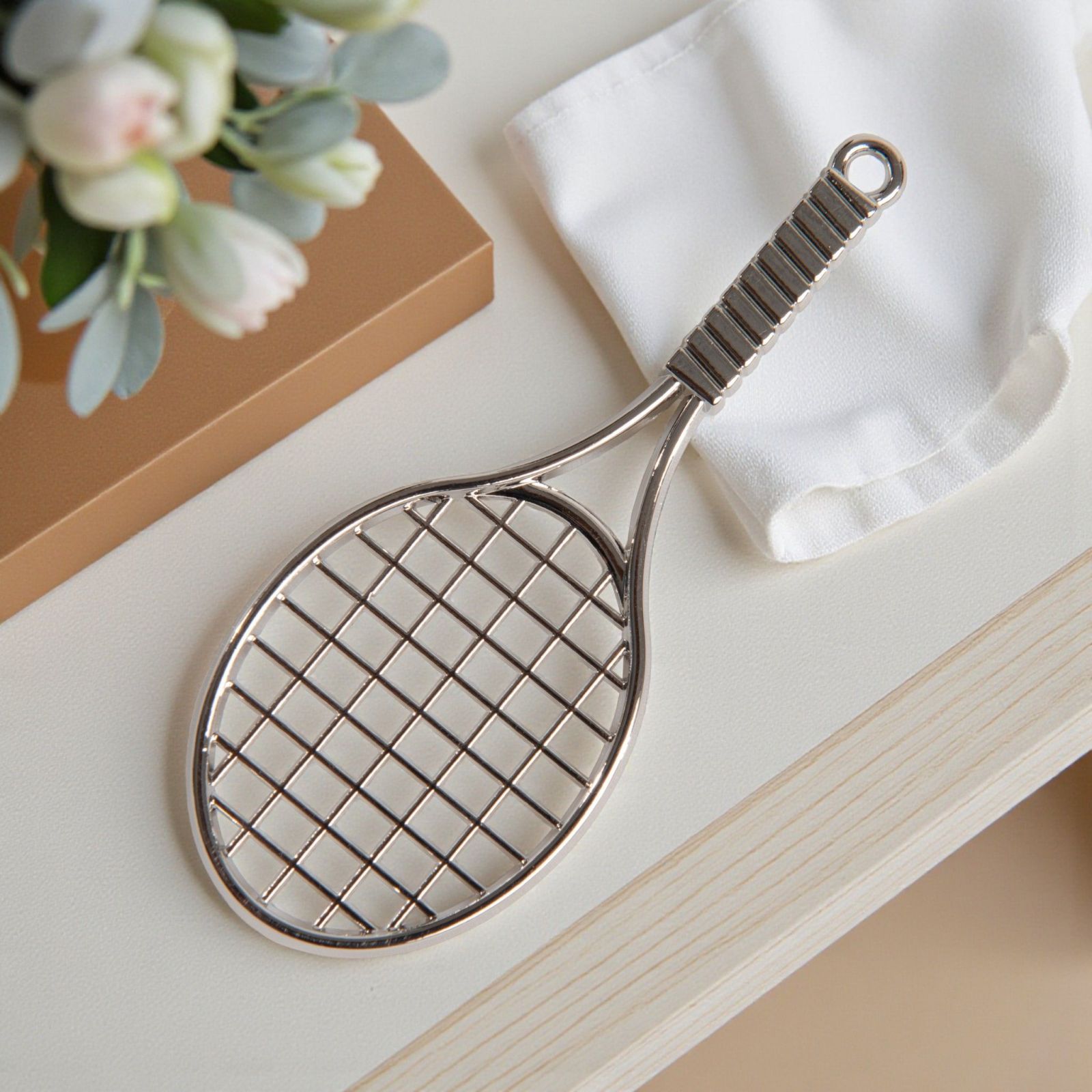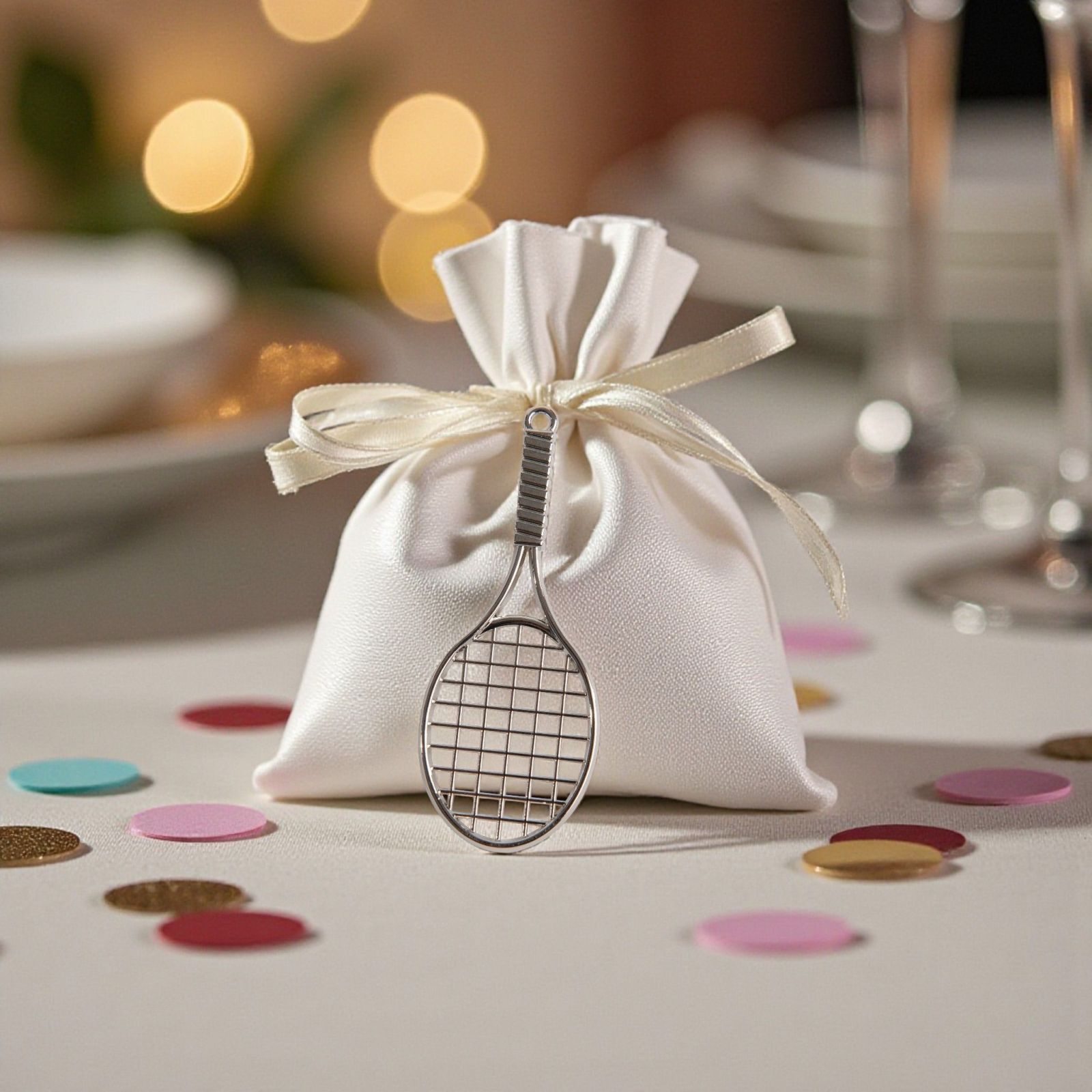 Non è solo un accessorio, ma un ricordo tangibile di una festa speciale. Scegliendo questa bomboniera, regalerai un pezzo di felicità che accompagnerà i tuoi cari nel loro viaggio, rendendo ogni occasione unica. Aggiungi un tocco di amore e stile ai tuoi eventi con questa adorabile racchetta argentata!
