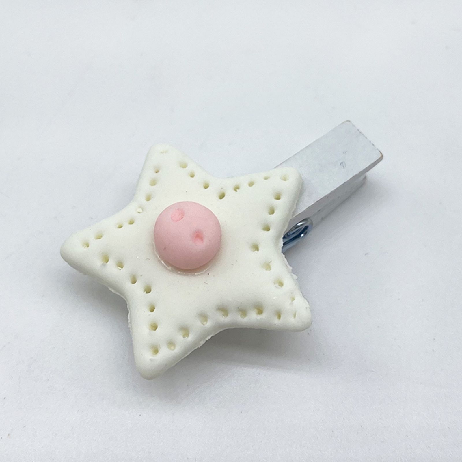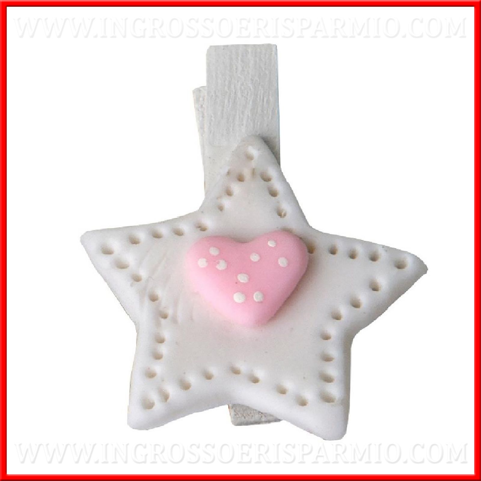Molletta in legno a forma di stella bianca con bottoncino rosa, ideale da applicare su sacchettini, confettate, pensierini, creazioni handmade, a fine decorativo ed utili per bloccare bigliettini e tag.