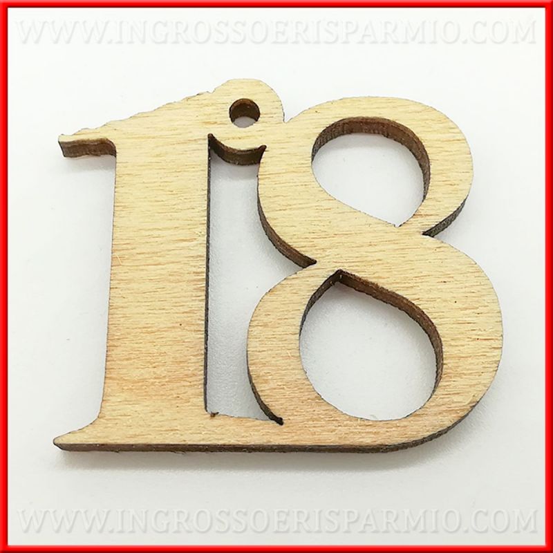 Decorazioni in legno a forma di numero 18, con occhiello superiore che consente l'utilizzo come charm e ciondolo da legare a sacchetti portaconfetti, scatoline e aprifesta di ogni genere!