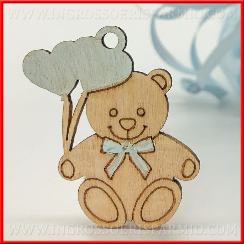 Legnetti decorativi a forma di tenero orsacchiotto, in color legno naturale con palloncini e fiocchetto al collo di colore azzurro.