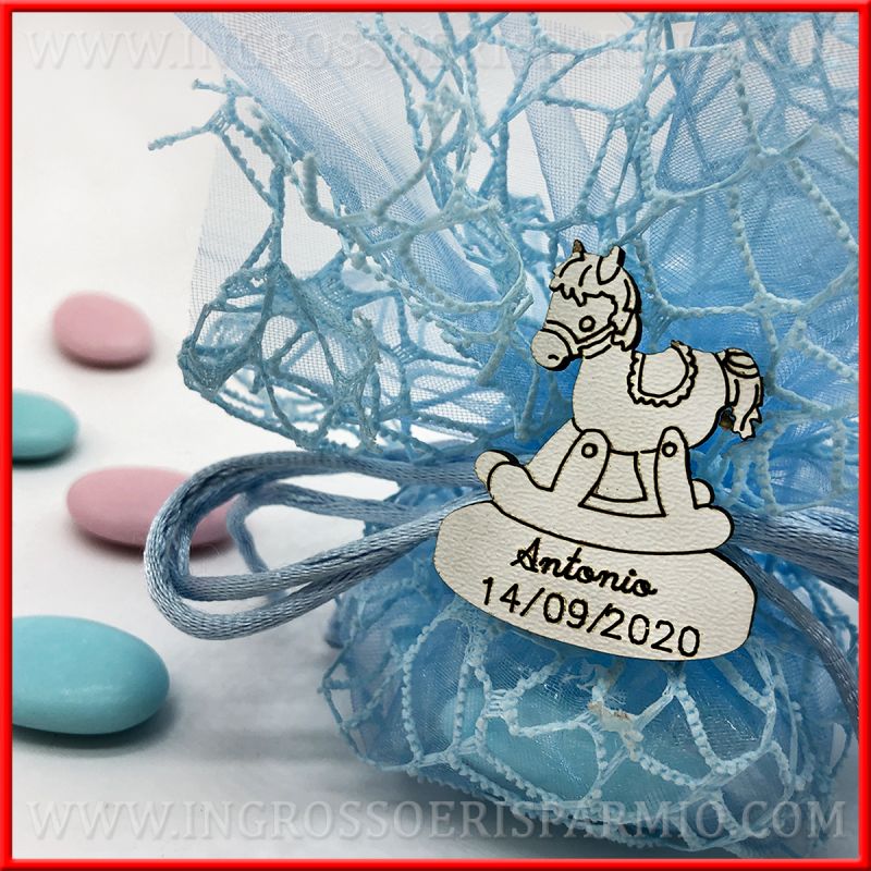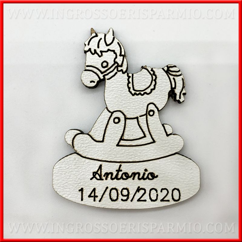 Applicazione in legno cavalluccio a dondolo con spazio per incisione nome e data: creare una confettata nascita originale sarà semplice ed economico!