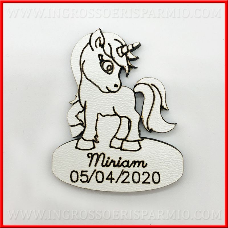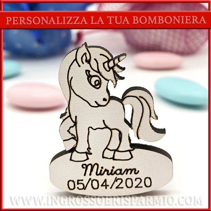 Legnetti per decorare bomboniere a forma di unicorno con superficie da PERSONALIZZARE CON INCISIONE NOME, DATA O BREVE TESTO TIPO "E' NATA", "LA MIA COMUNIONE", "BENVENUTA", ecc...