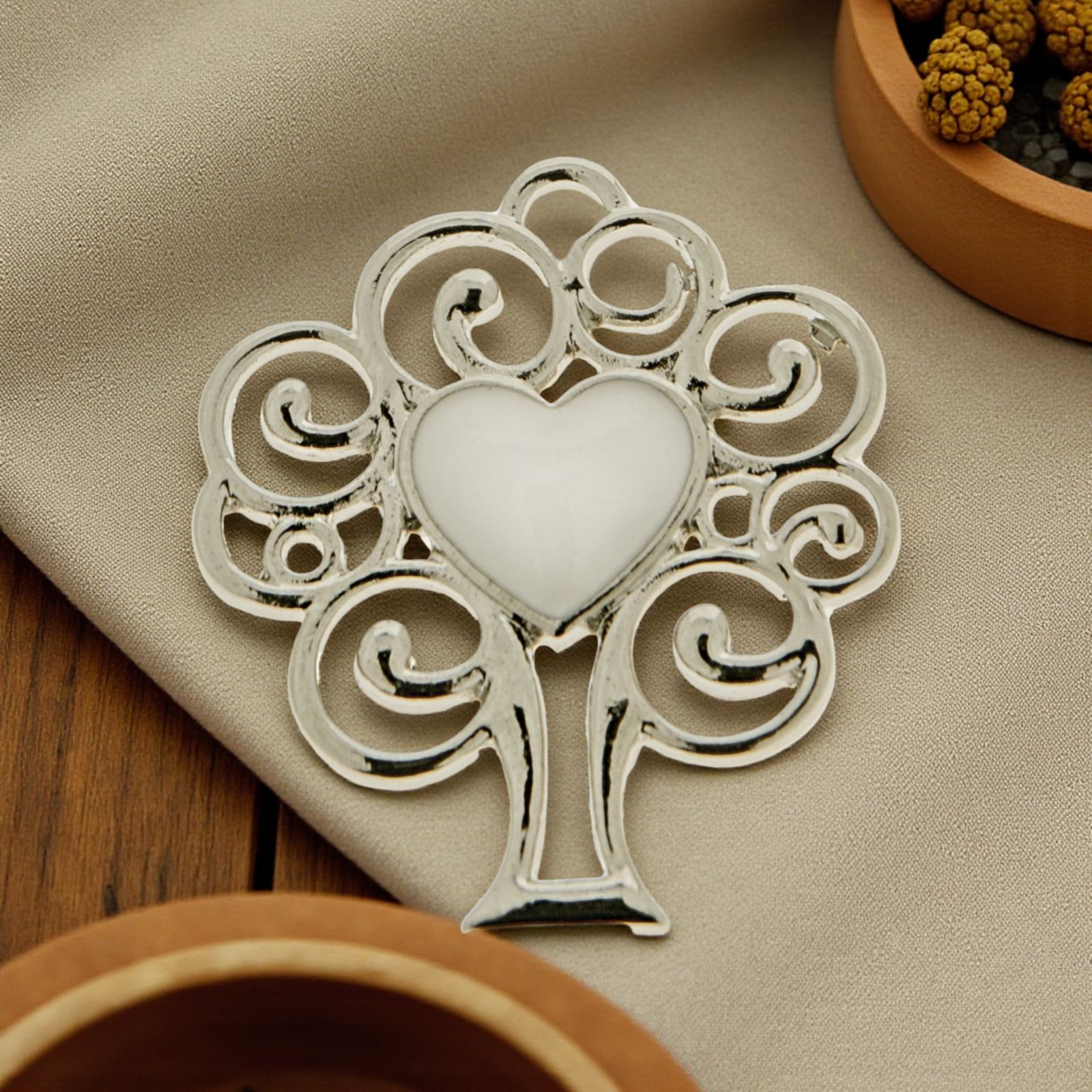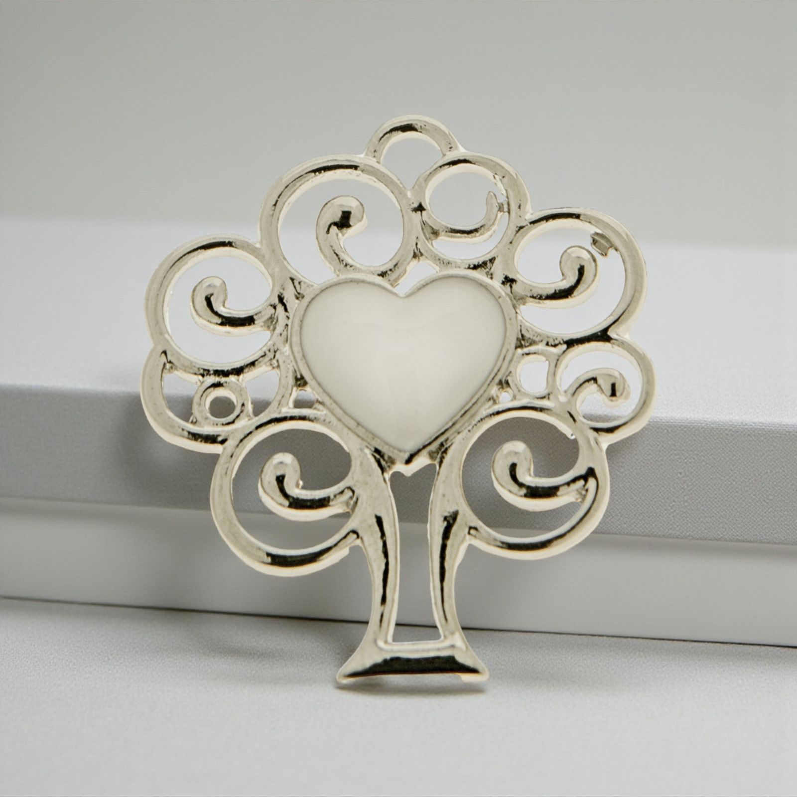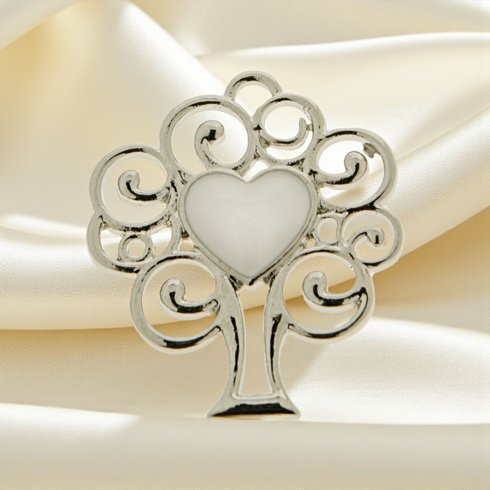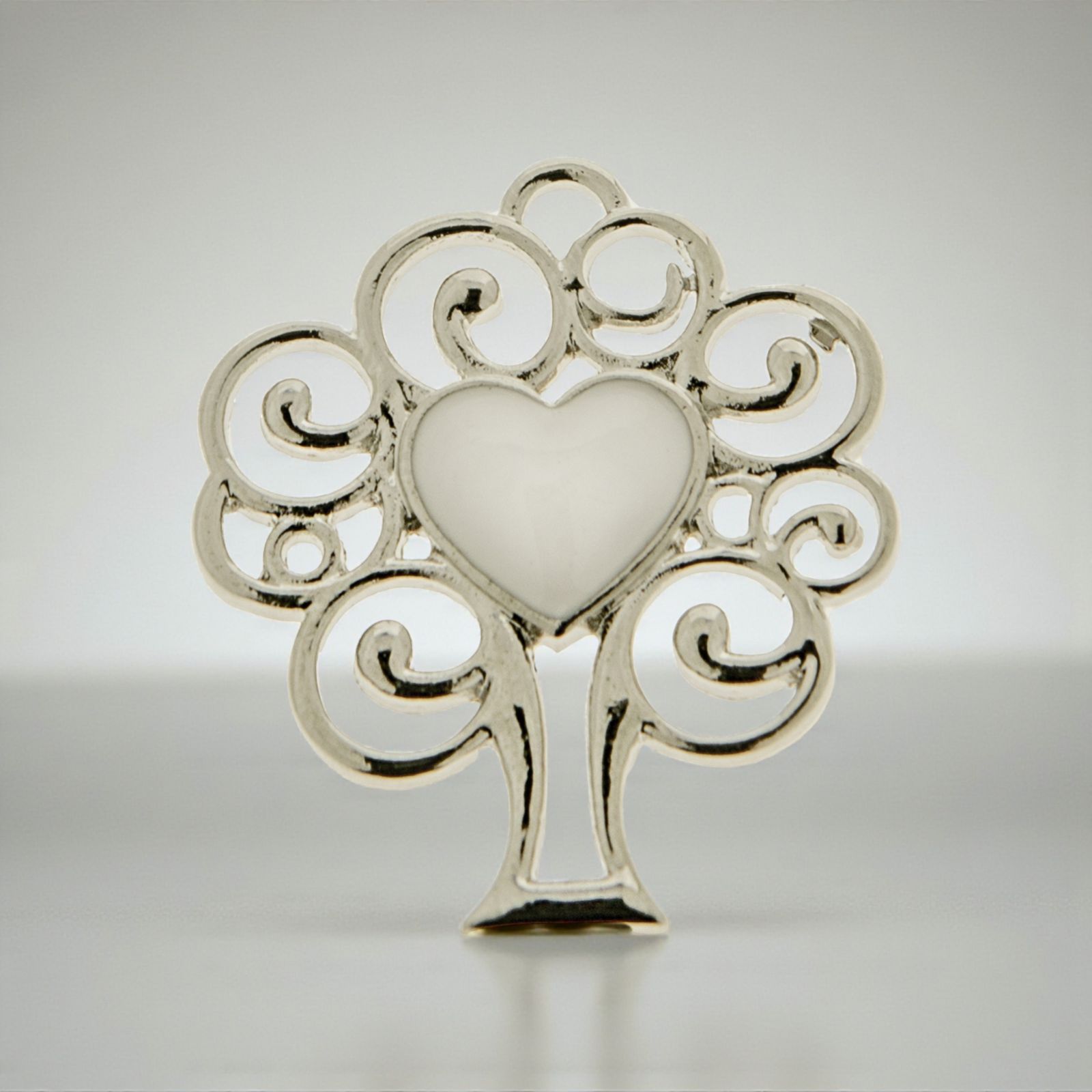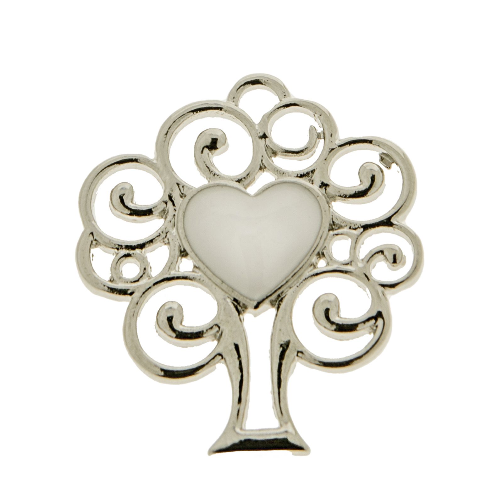 Ciondolo portafortuna a forma di albero della vita realizzato in zama con al centro un cuore in bianco perlato, con occhiello superiore che permette al ciondolo di essere appeso o utilizzato come charm per bracciali e collanine.