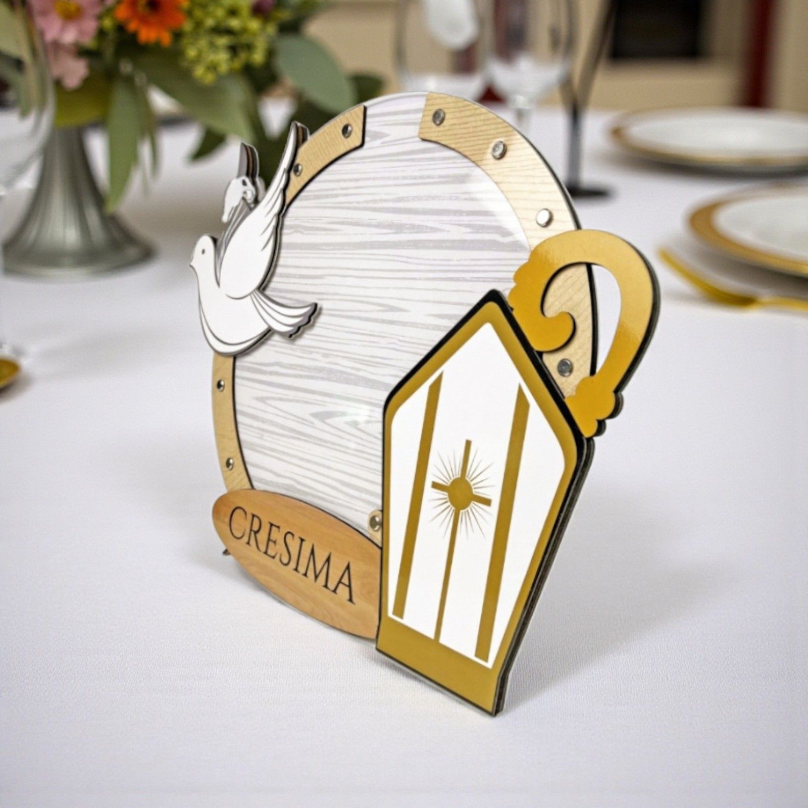 Realizzato in legno e colori pastello, questo porta auguri è perfetto come decorazione sweet table, aggiungendo eleganza e coinvolgimento agli invitati. Il design curato e i simboli sacri rendono il tuo allestimento raffinato e armonioso.