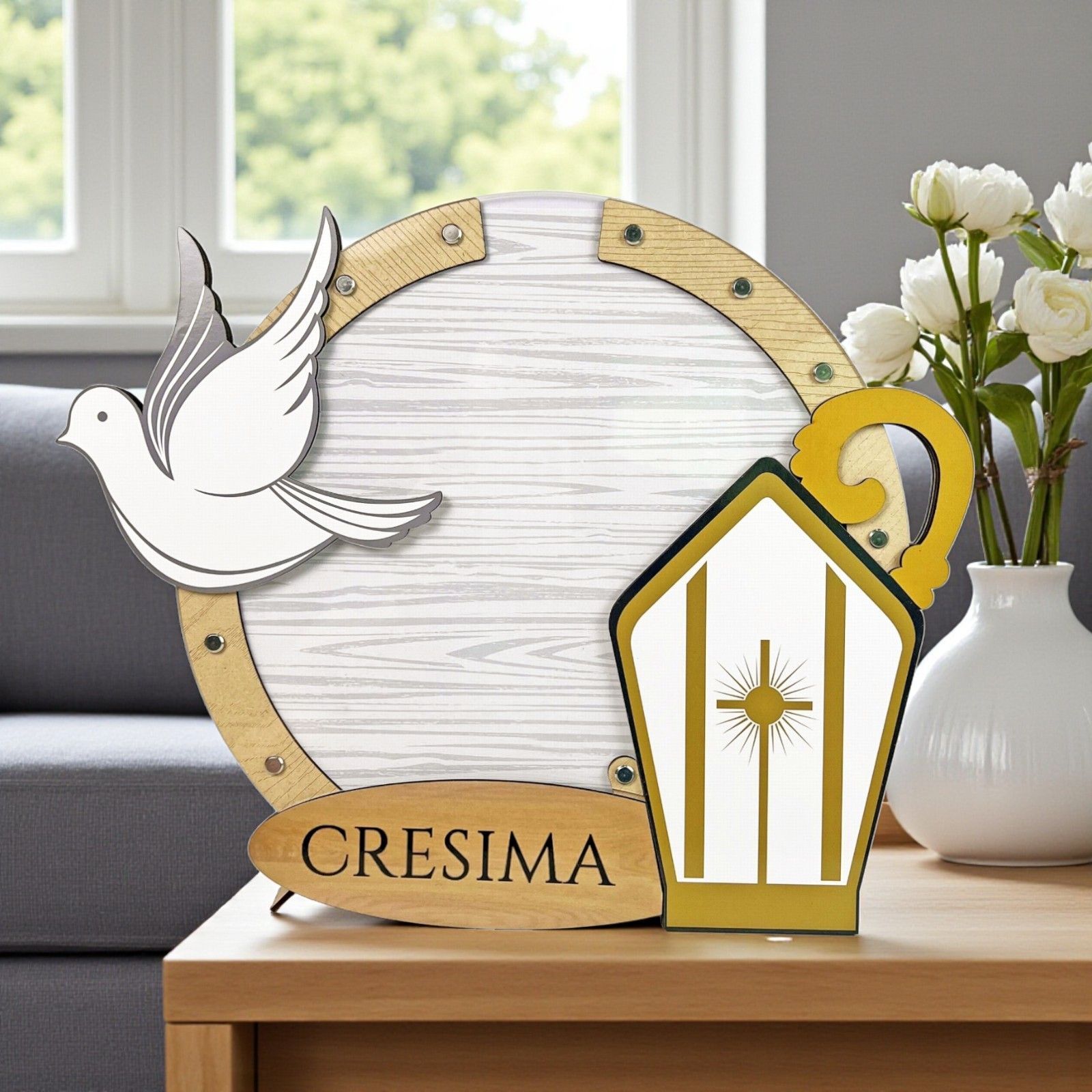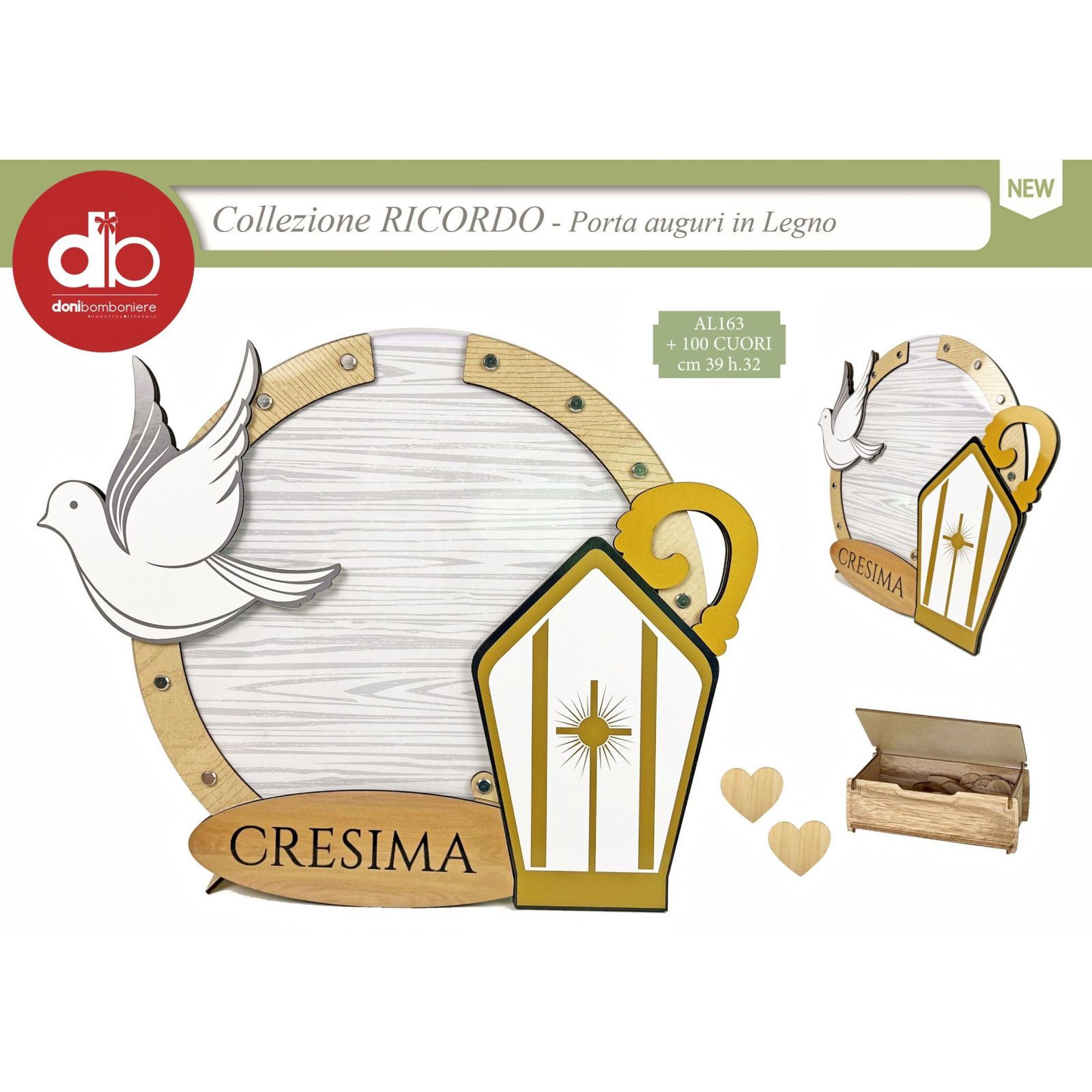 Rendi speciale il giorno della cresima con questo elegante porta auguri in legno, decorato con la scritta Cresima e simboli sacri come mitra, pastorale e colomba. Gli ospiti potranno inserire i loro messaggi nei 100 cuoricini contenuti in una box, collocandoli all'interno del porta auguri attraverso il pannello in plexiglass, creando un ricordo interattivo e memorabile.