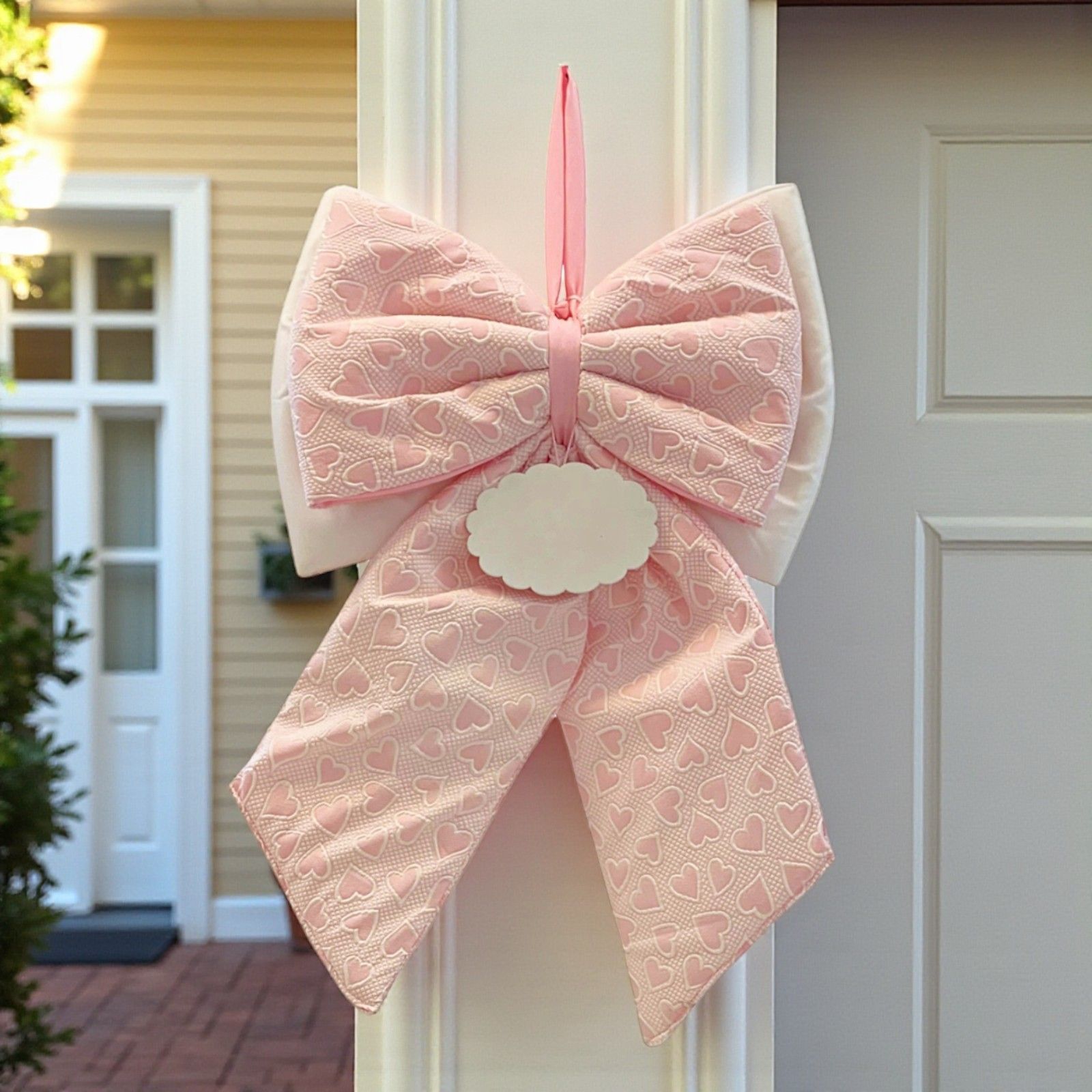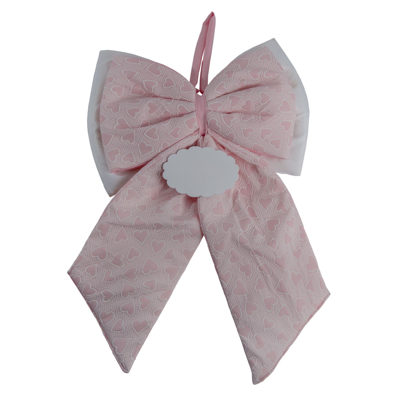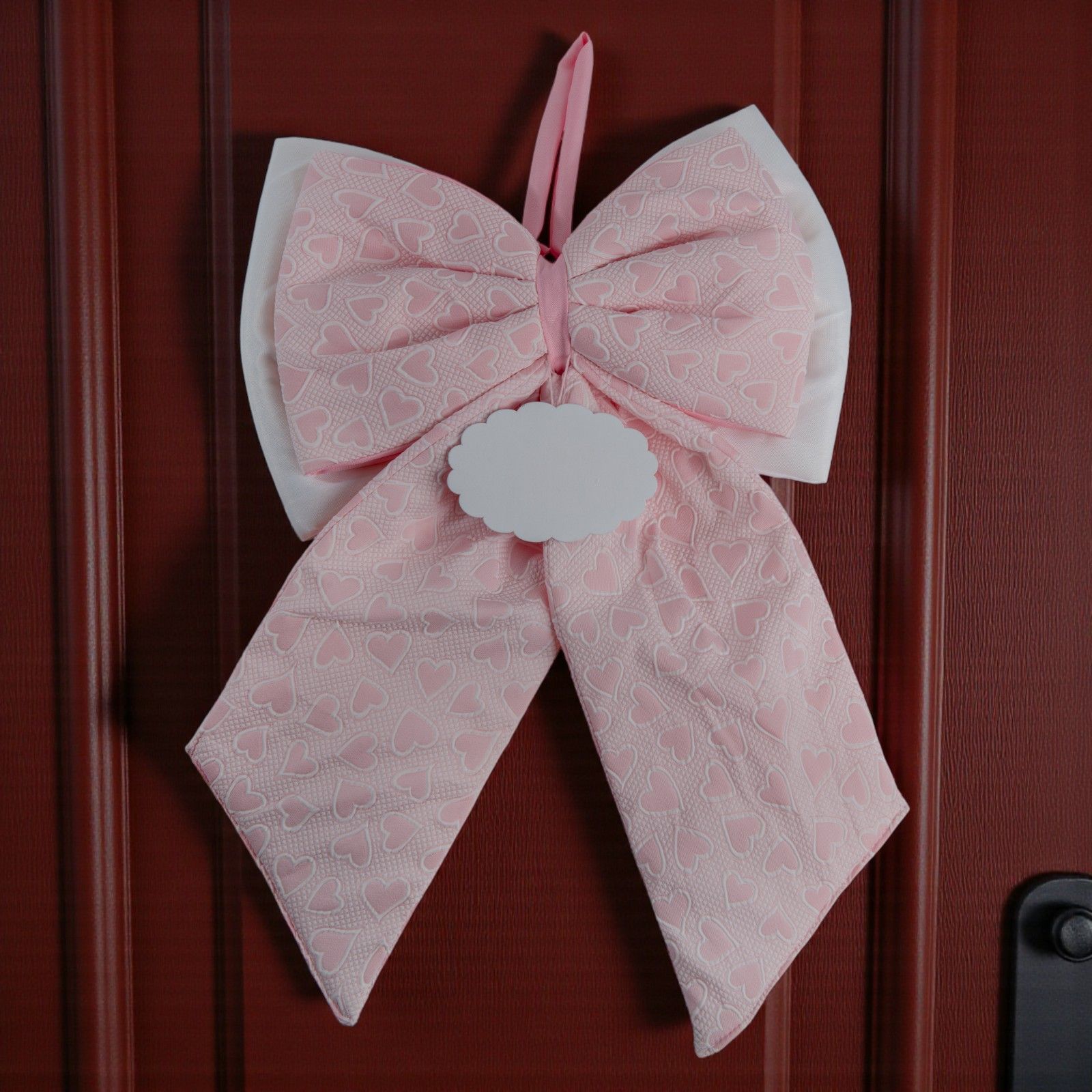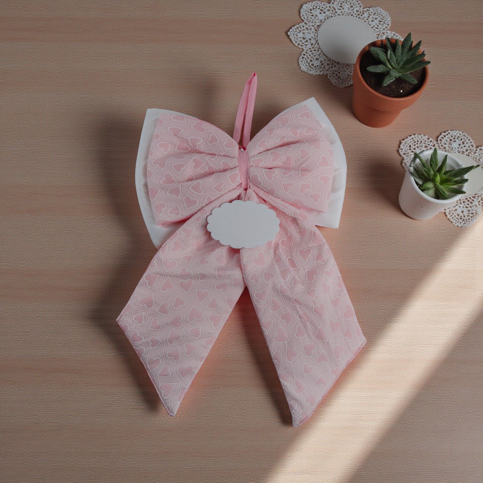 Realizzato in morbido tessuto nei delicati colori rosa e bianco, questo fiocco diventa un dettaglio unico e originale per arricchire il sweet table nascita bimba o semplicemente decorare l’ingresso della casa. Un tocco personale e dolce che farà sorridere tutti gli ospiti.