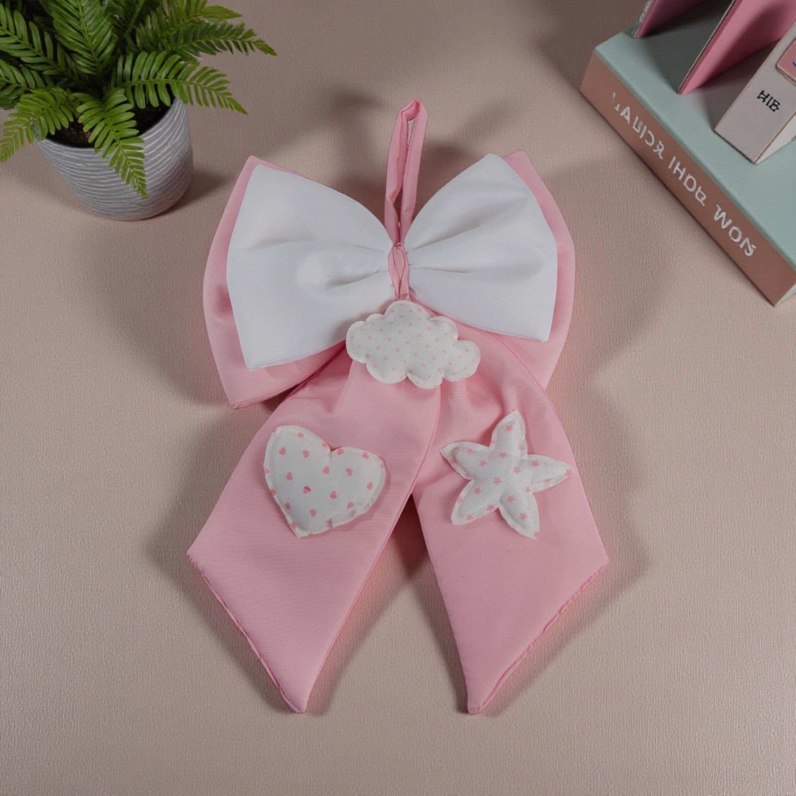 Realizzato in tessuto morbido e leggero nei delicati colori rosa e bianco, questo fiocco è perfetto anche come dettaglio del sweet table nascita bimba, portando un tocco personale e allegro alla festa.