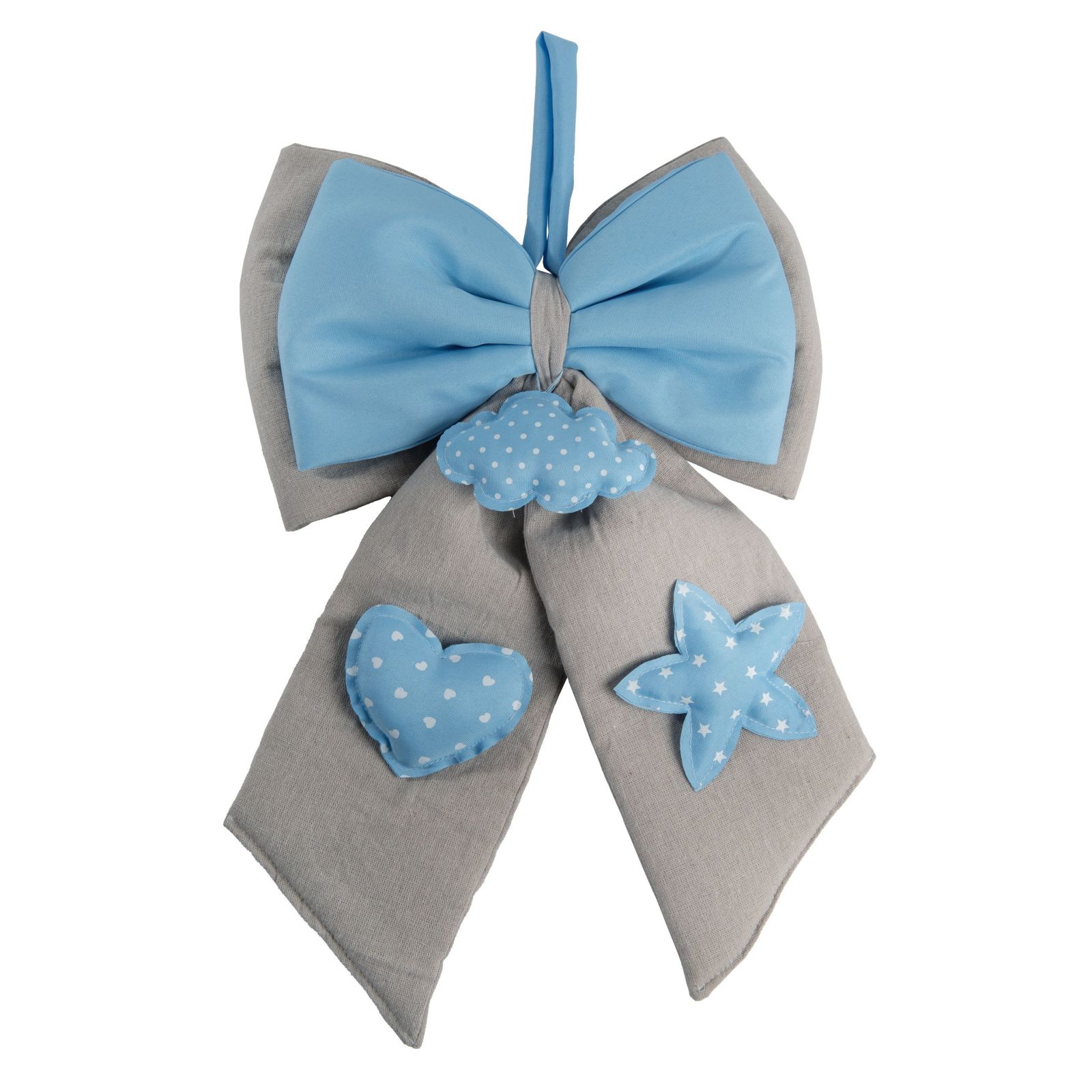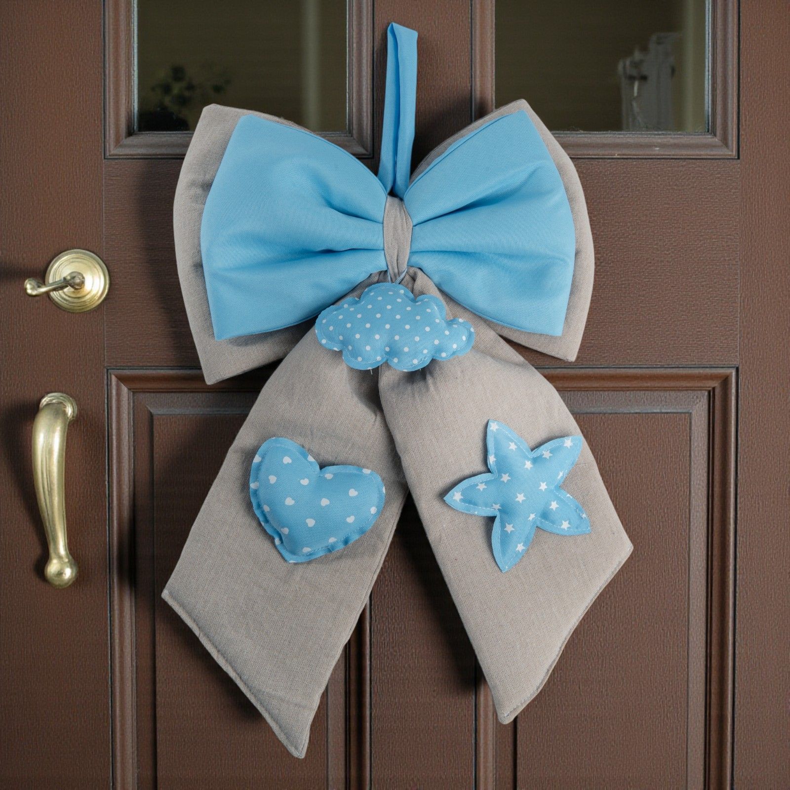 Pronti a festeggiare l’arrivo del piccolo? Questo fiocco nascita bimbo con doppio fiocco beige e celeste, una nuvoletta centrale a pois e sulle code un cuore e una stellina sempre a pois, è una decorazione nascita dolce e originale che conquisterà tutti gli invitati.