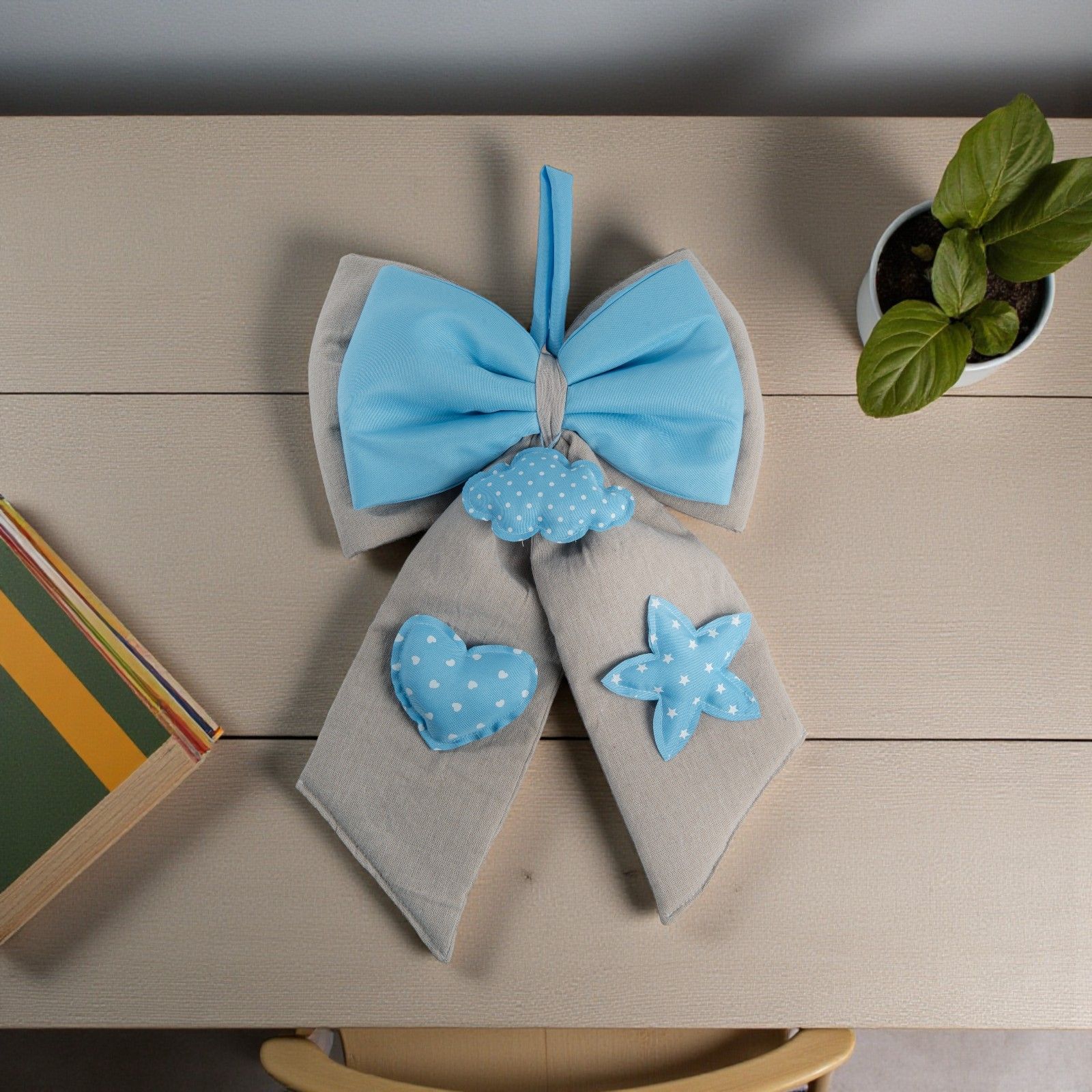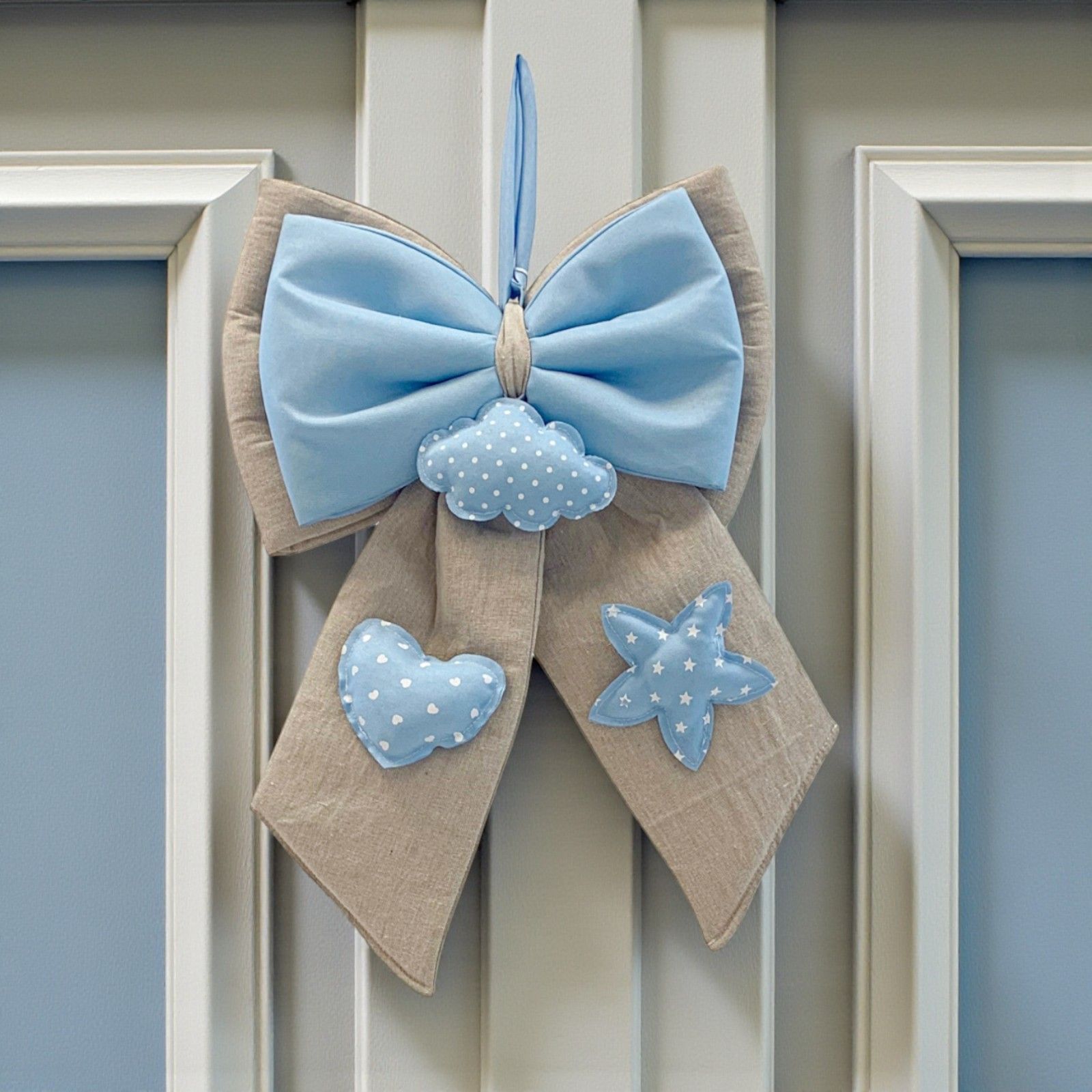 Realizzato in tessuto morbido nei delicati toni del beige e celeste, questo fiocco è perfetto anche come protagonista del sweet table nascita bimbo, aggiungendo un tocco elegante e personale alla festa.