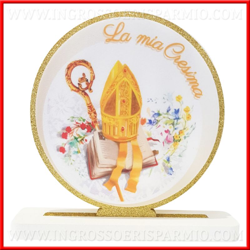 Polistirolo decorativo tondo, con disco posteriore oro glitter che incornicia l'immagine cresima stampata sul disco posto avanti. La stampa su polistirolo raffigura il Mitra (cappello vescovo) con bastone e Vangelo, incorniciato da decori floreali e scritta "La mia Cresima".