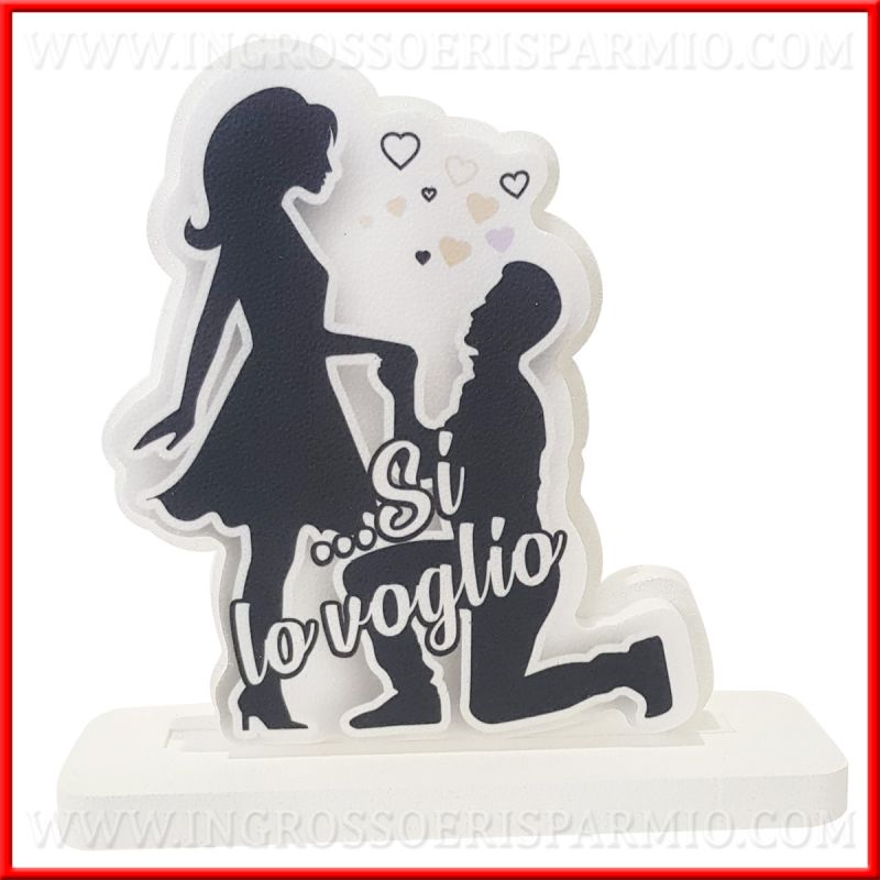 Sagoma in polistirolo stampato raffigurante una coppia di innamorati, con l'uomo in ginocchio davanti alla donna, mentre le chiede la mano. Le sagome dei due innamorati sono raffigurate in nero e davanti è posta una scritta bianca "Si lo voglio".