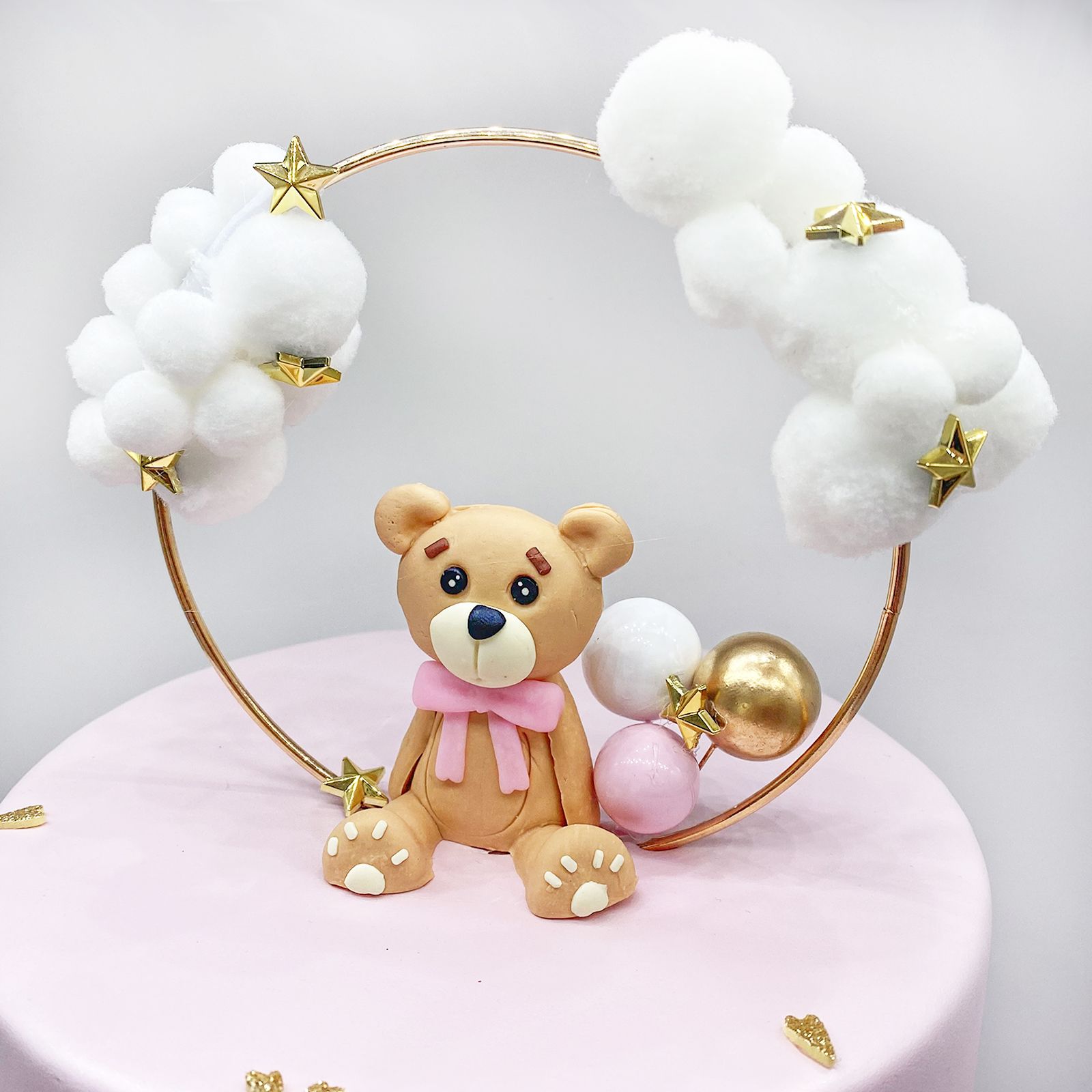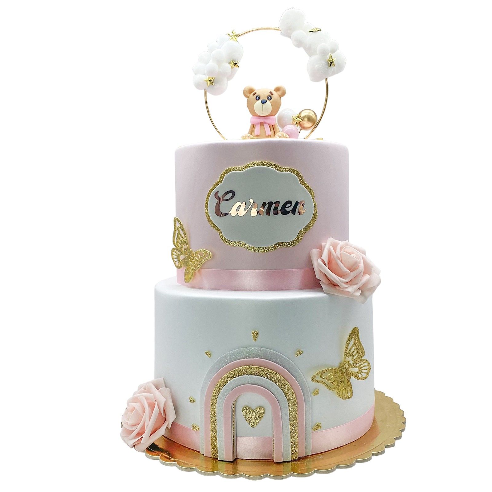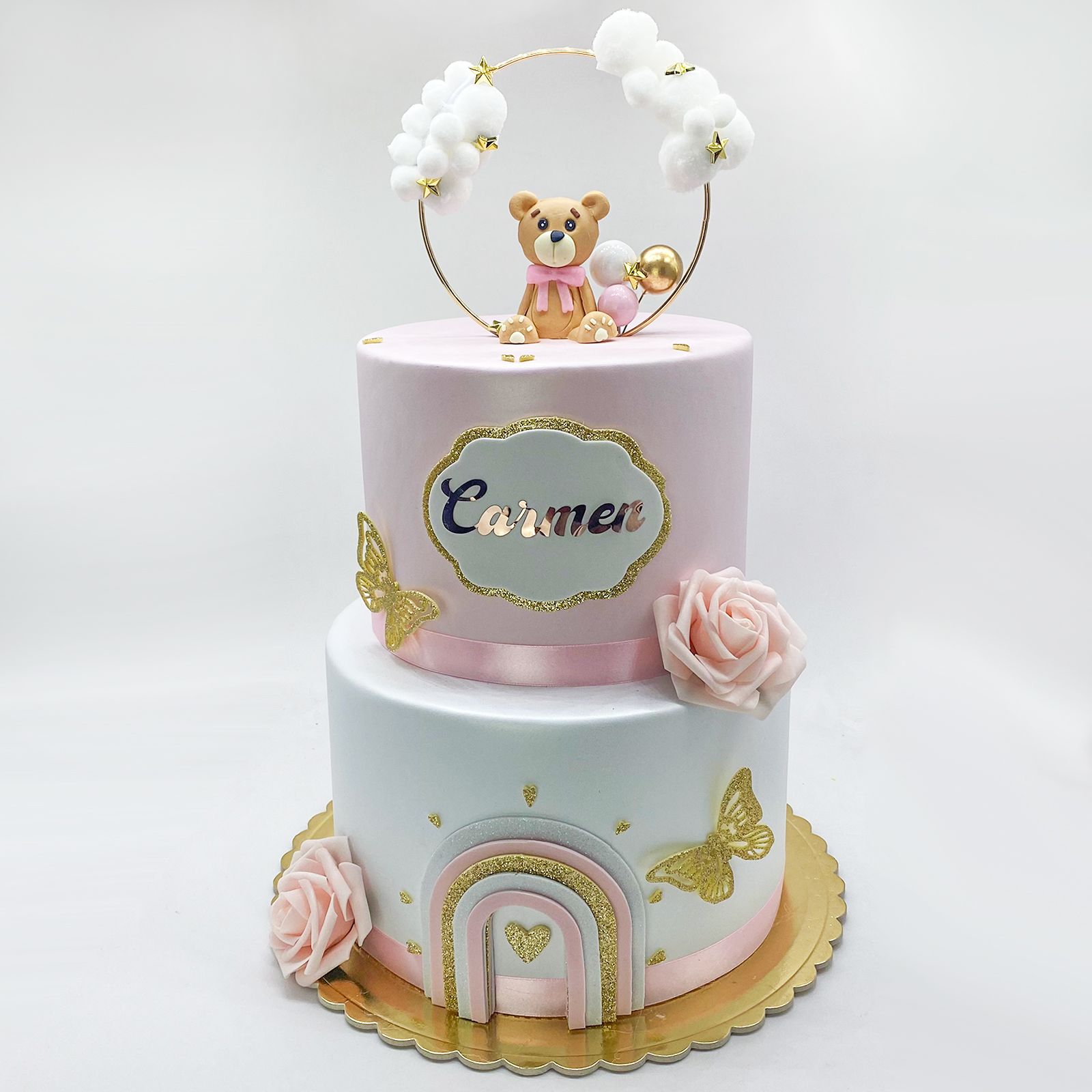 In cima, una nuvoletta accoglie il nome della tua bimba, rendendo la torta unica e incantata. L'adorabile orsetto con fiocco rosa e palloncino, racchiuso in un cerchio di nuvole e stelline, aggiunge un tocco di tenerezza e dolcezza.