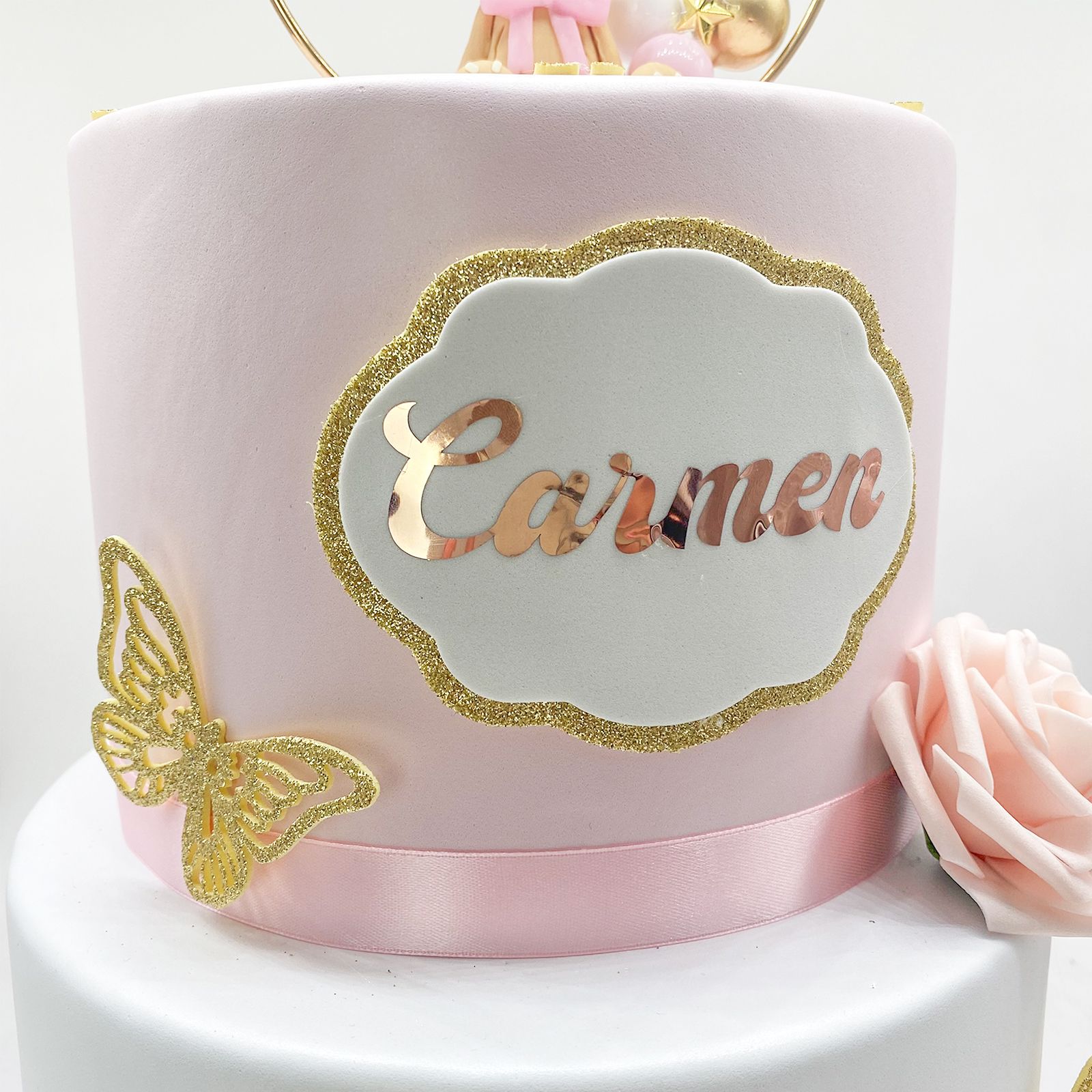 Scopri la nostra torta scenografia bianca e rosa, perfetta per celebrare momenti magici come la nascita o il battesimo della tua piccola principessa. Decorata con rose delicate, farfalle danzanti e dettagli dorati, questa torta crea un'atmosfera da sogno.