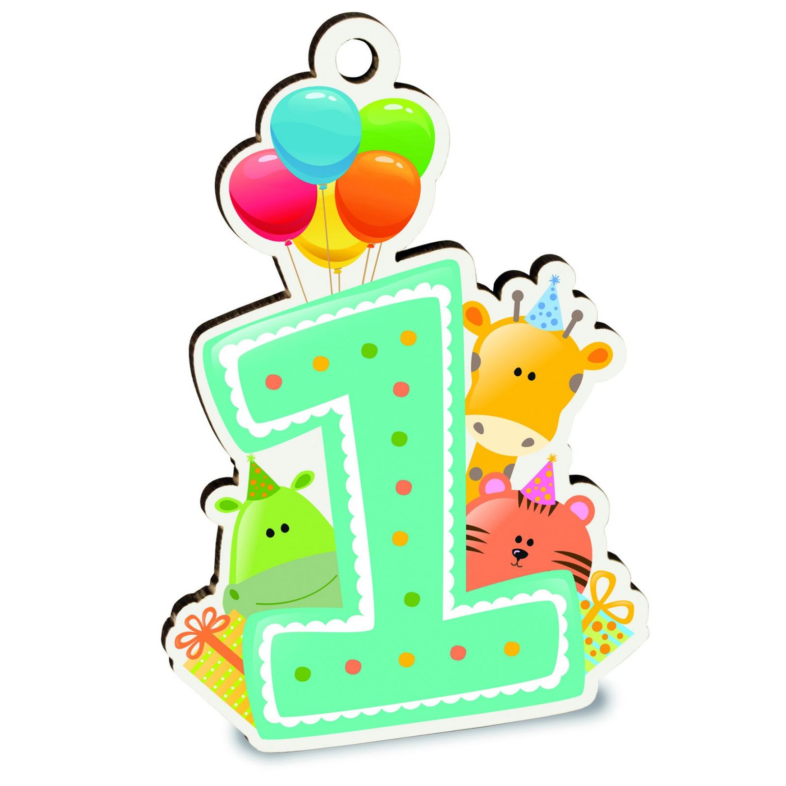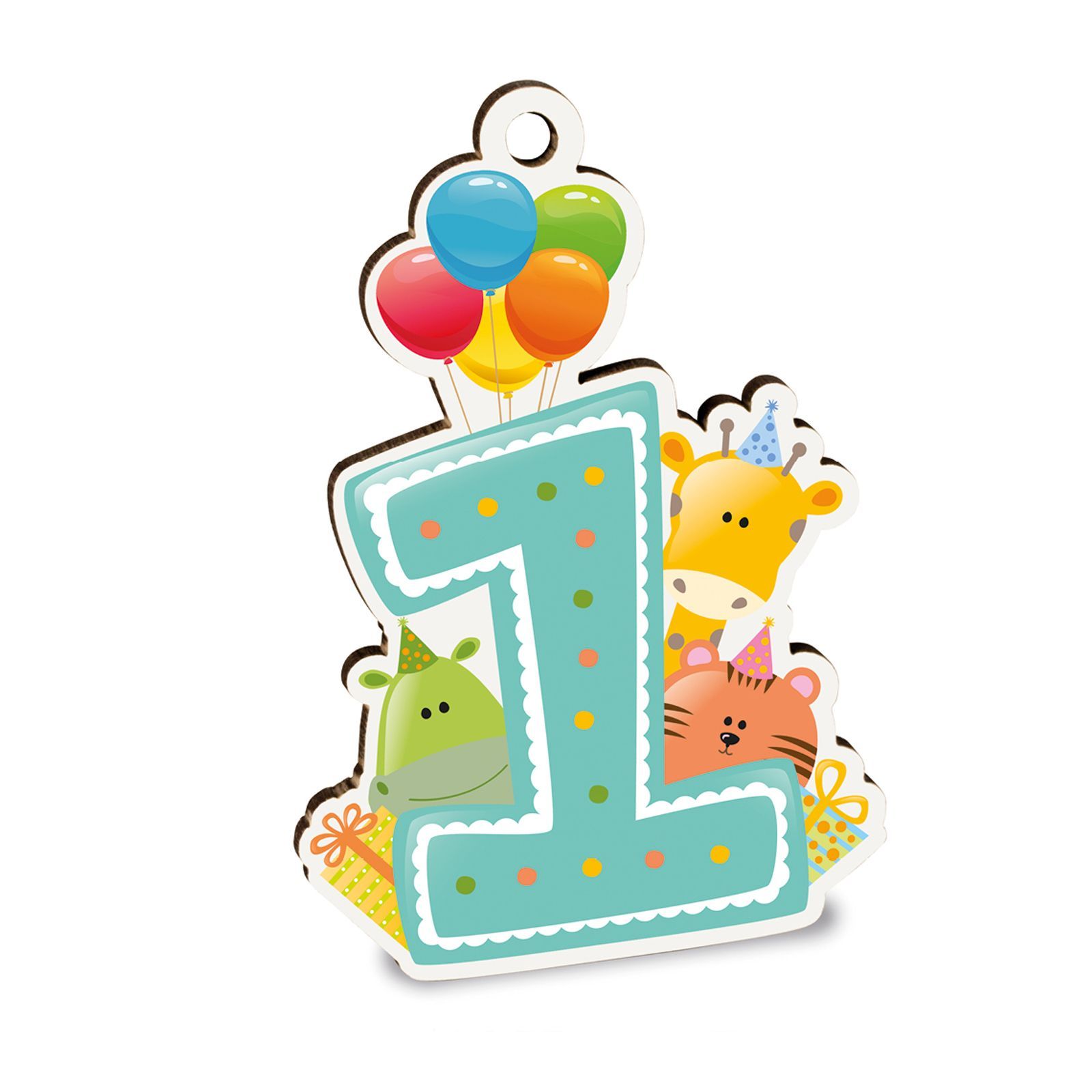 Questa meravigliosa decorazione con il numero uno e simpatici animaletti con palloncini è perfetta per festeggiare il primo compleanno di un maschietto o di una femminuccia. Realizzata in legno di alta qualità, misura circa 7 cm e presenta un forellino per appenderla facilmente, rendendola ideale come decorazione per la festa.