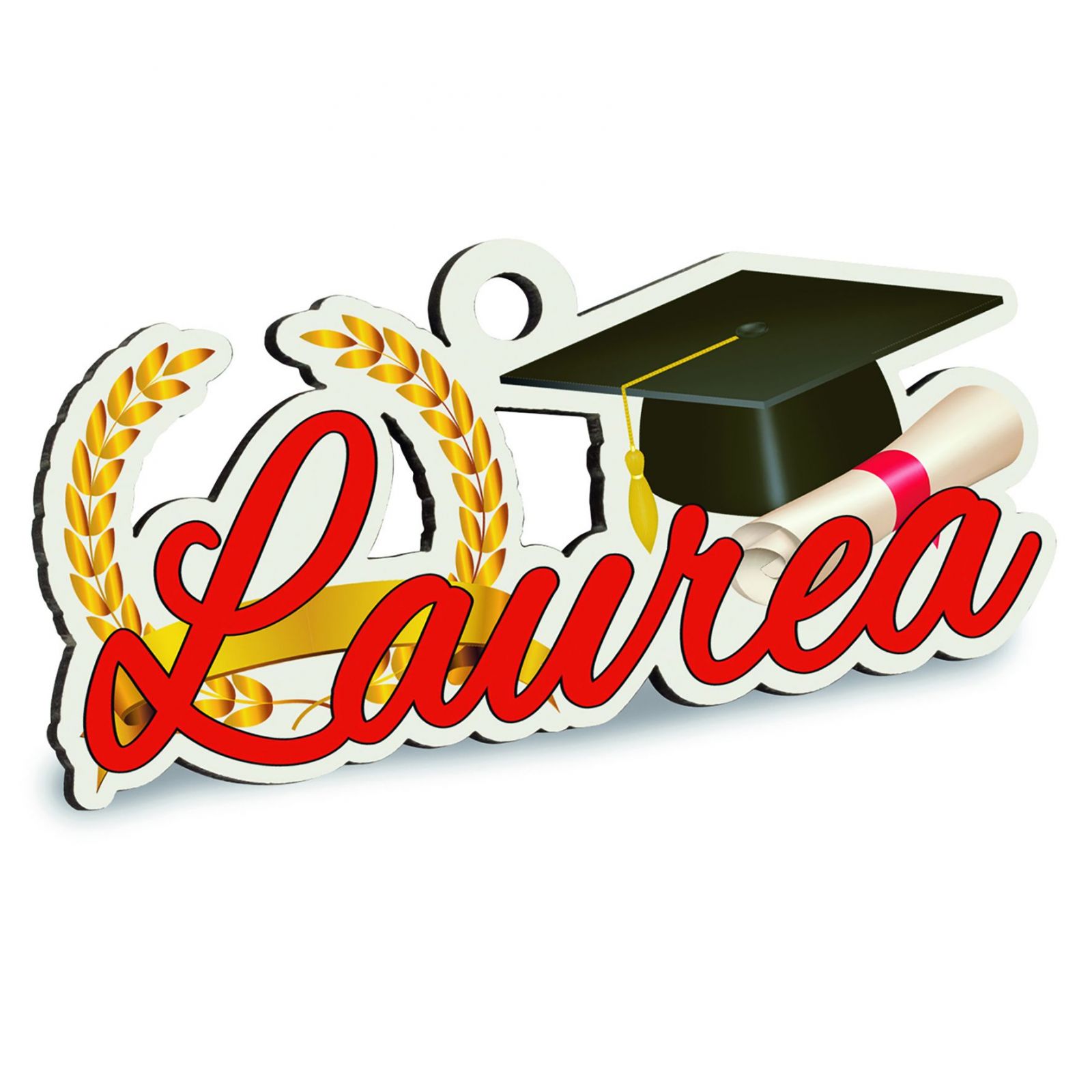 Questa decorazione da appendere con scritta Laura con corona alloro, tocco e pergamena è ideale per celebrare la laurea. Realizzata in legno di alta qualità, ha un design elegante che renderà unica la cerimonia.