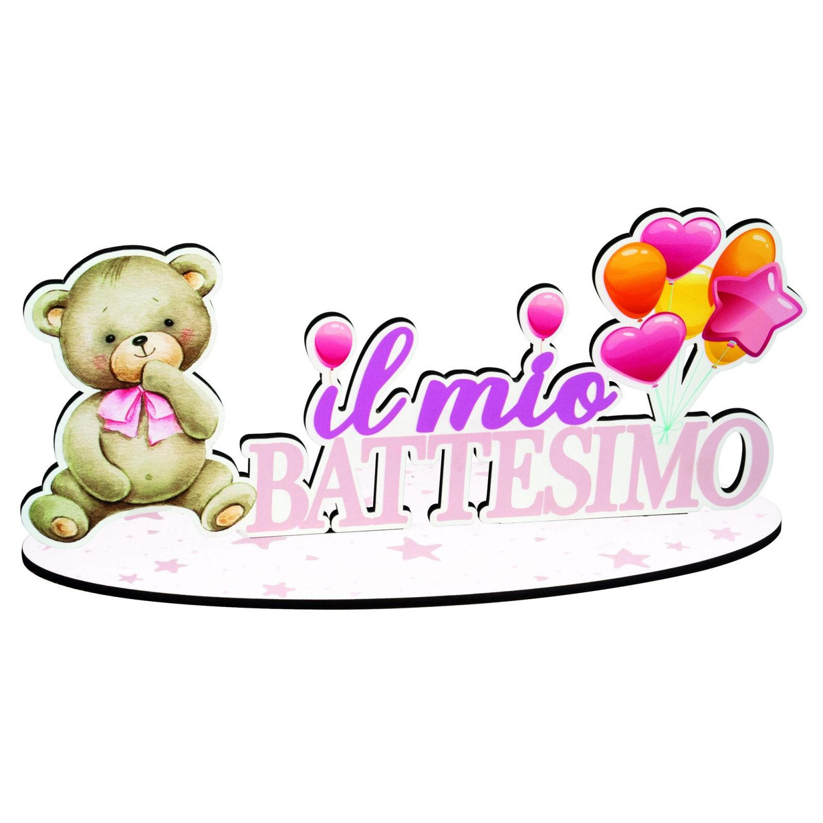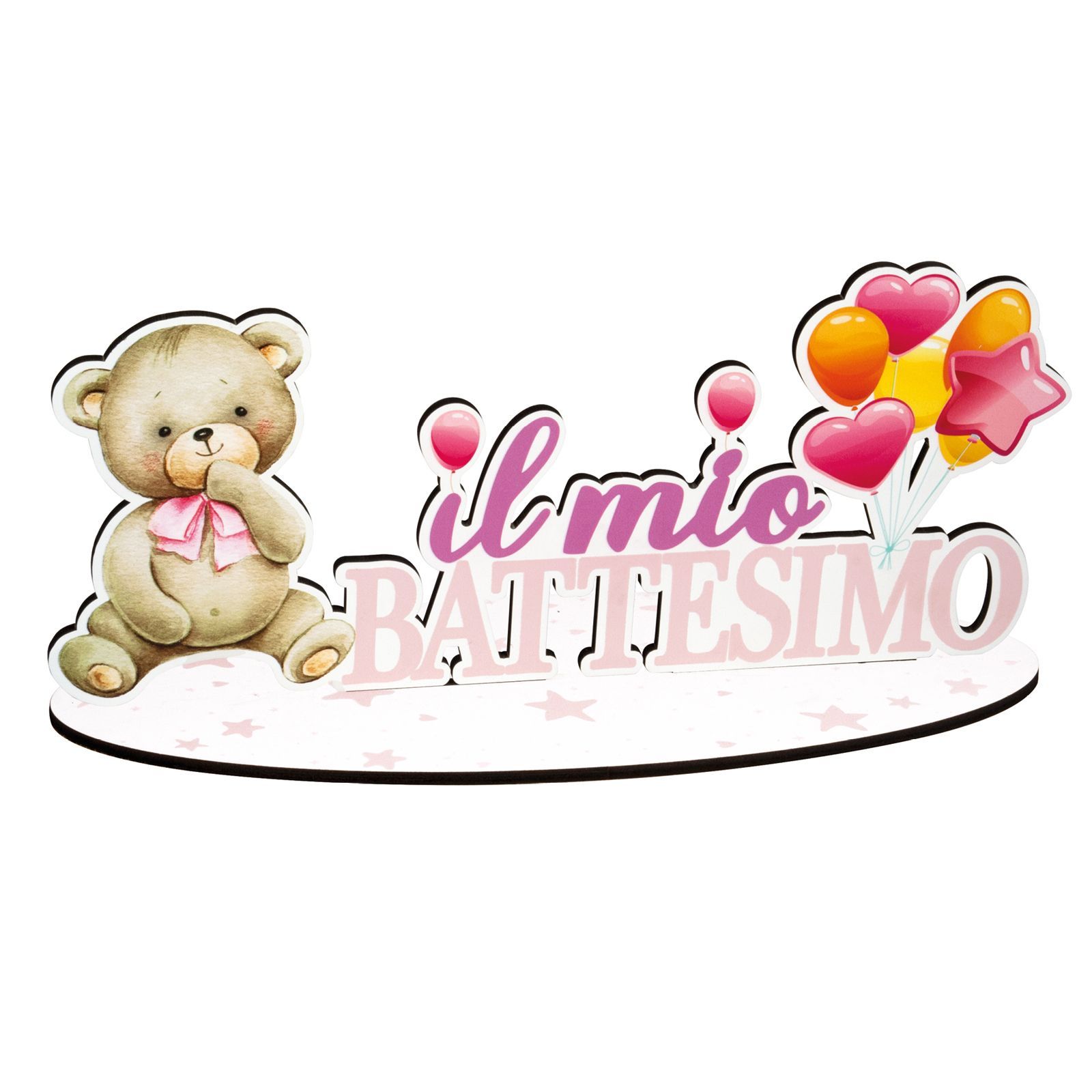 Questa dolce decorazione da appoggio con orsetto e fiocco rosa è perfetta per celebrare il battesimo di una bimba. Con dimensioni di circa 35 x 16 cm, aggiunge un tocco di dolcezza alla tua sweet table, realizzata in legno di alta qualità.