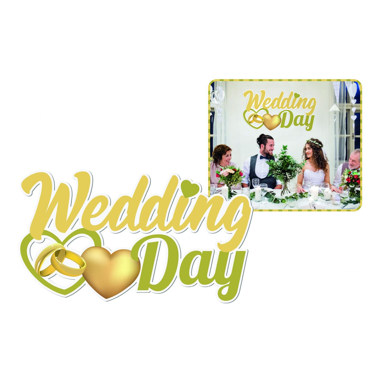 Per il giorno più importante della vostra vita, non c'è niente di più speciale che sorprendere i vostri ospiti con una decorazione unica e significativa. La scritta da parete "wedding day" accompagnata da fedi e cuore è l'elemento perfetto per celebrare il vostro matrimonio in modo indimenticabile.