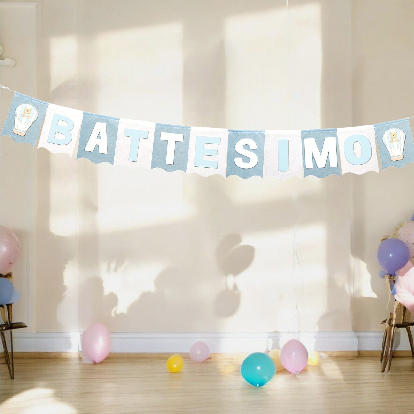 Questa decorazione simboleggia la condivisione di un momento speciale della vita del tuo bambino. La scritta "Battesimo" e i disegni di mongolfiera e orsetto trasmettono gioia e amore.