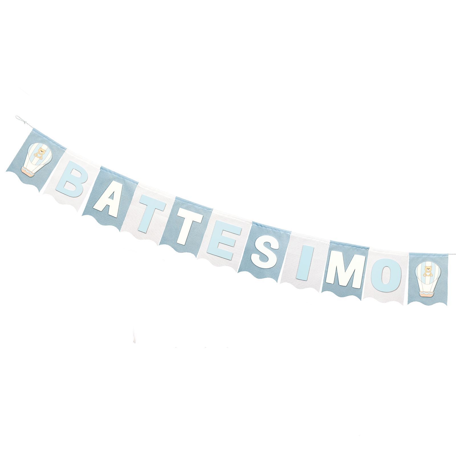 Decora il tuo evento con il Festone in tessuto "Battesimo", con mongolfiera e orsetto. Perfetto per il battesimo di un maschietto, grazie al colore celeste e al design delicato.