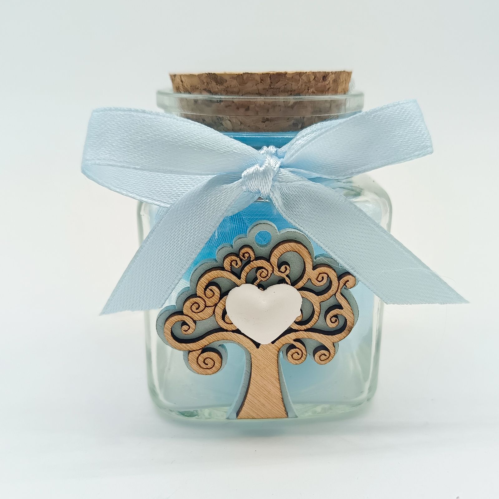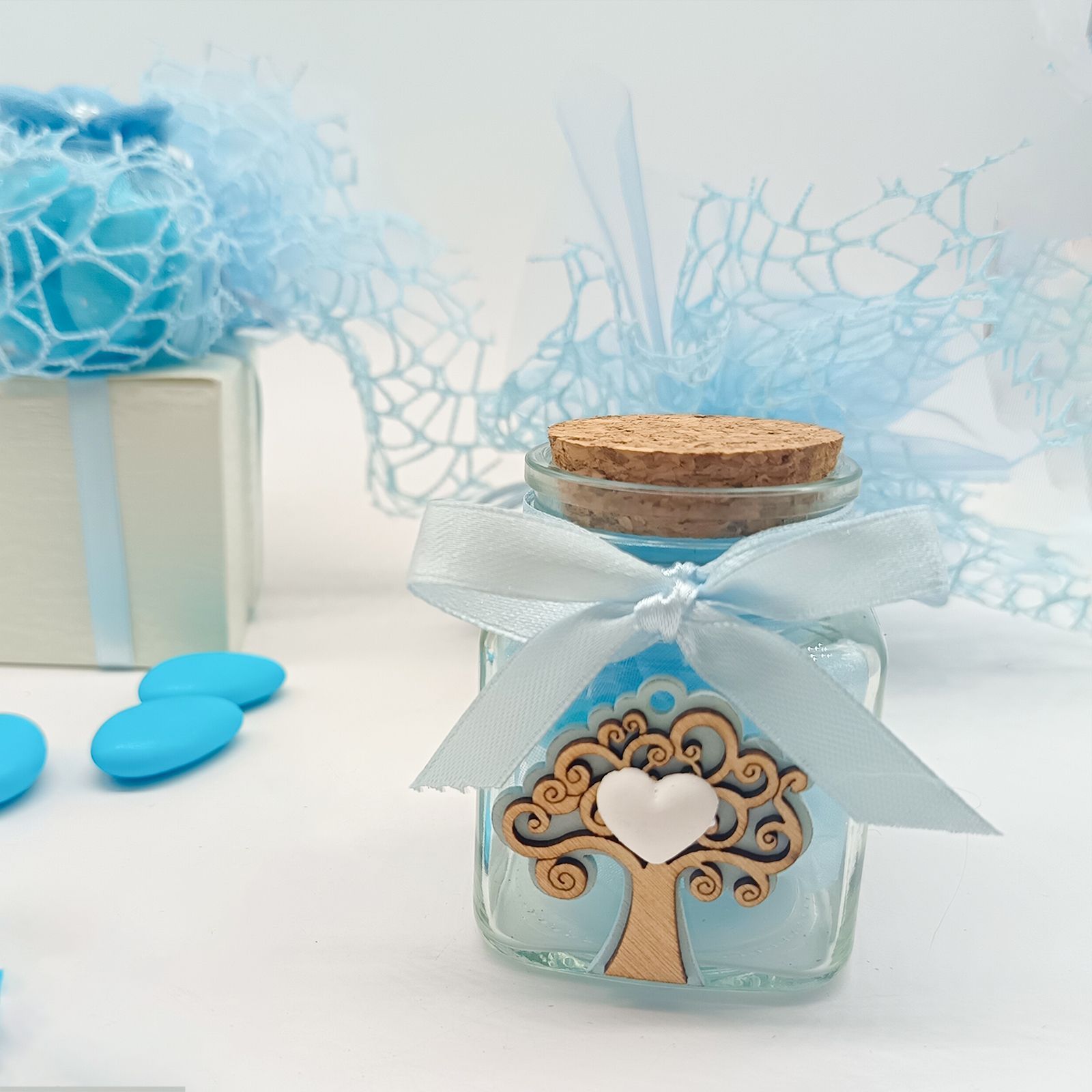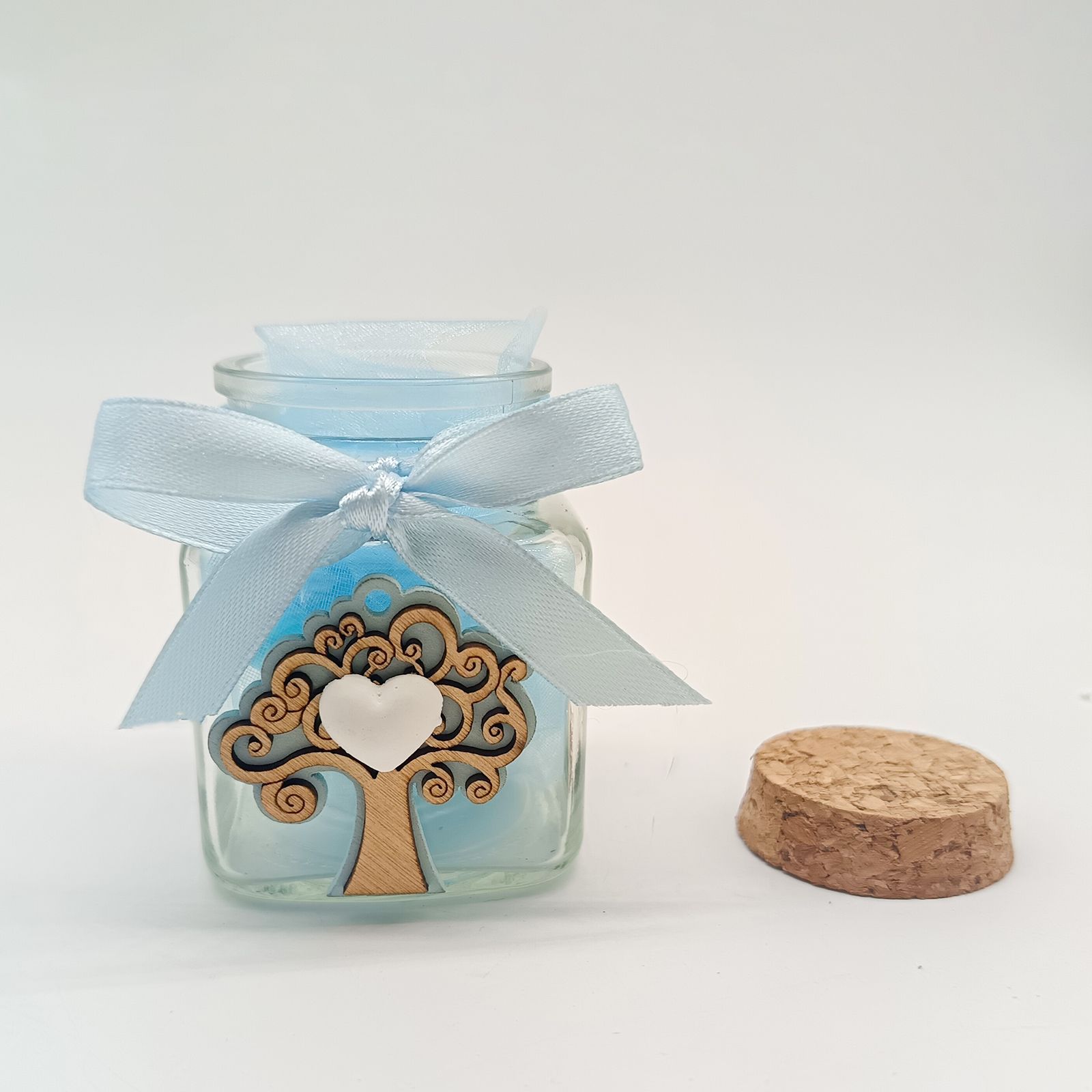 Barattolo ermetico in vetro con tappo in sughero e dolce applicazione in legno dell’albero della vita color celeste, arricchito da un cuoricino bianco centrale. Ideale come dono per battesimo, primo compleanno o comunione, è un pensiero originale che unisce estetica e funzionalità.