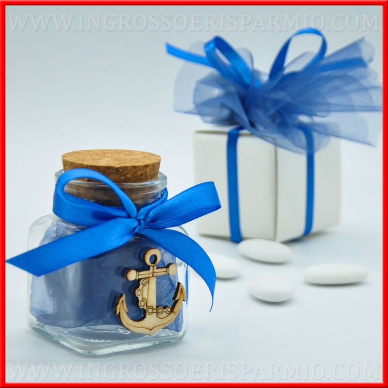 Barattoli decorati con ancora in legno e fiocco in raso. Il colore del nastro legato al collo del barattolo può essere selezionato tra quelli disponibili nel menù a destra, per realizzare portaconfetti personalizzati per ogni evento (es. nastro verde per 18 anni, rosa o celeste per battesimo, blu per compleanno uomo, bianco o panna per matrimonio, ecc..).