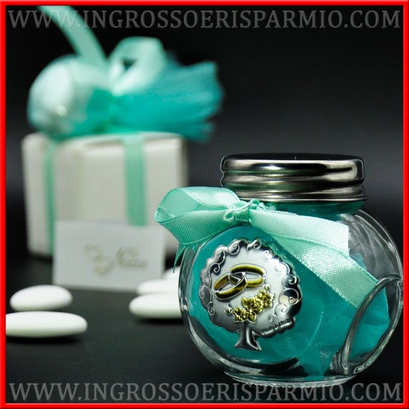 Bomboniere barattoli in vetro con tappo in latta a vite. Decorato con un fiocco in raso (che potrà essere realizzato del colore che preferisci) e da un'applicazione a forma di albero della vita argentata/silver, con la raffigurazione di fedi intrecciate e fiorellini color oro.