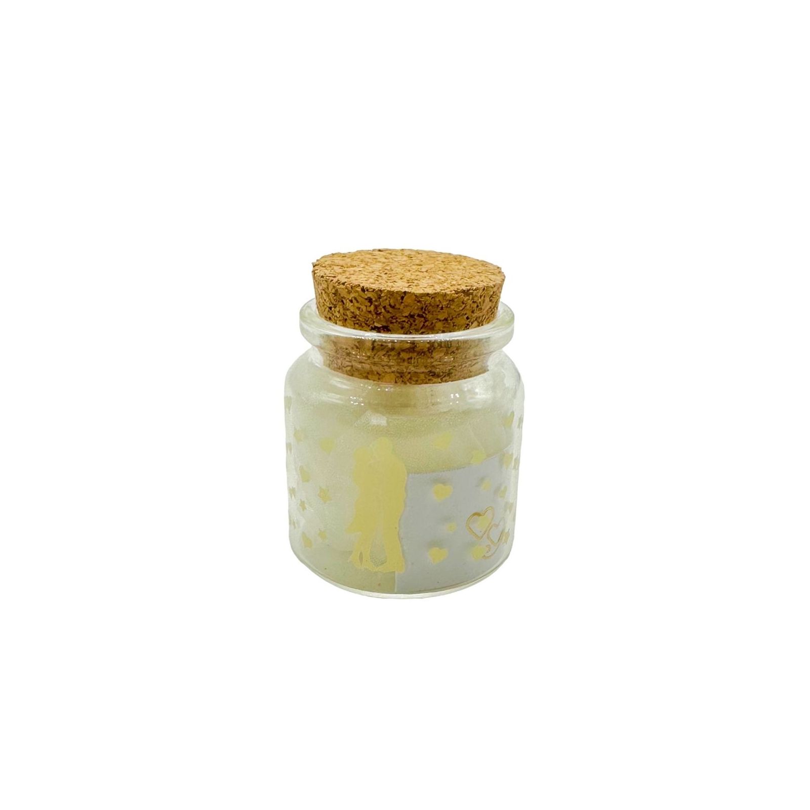 Vasetti decorati con cuori, stelle e sagoma innamorati mentre si scambiano un bacio. La stampa delle decorazioni è realizzata in bianco, direttamente sul vetro. Il barattolino ha una chiusura con tappo in sughero.
