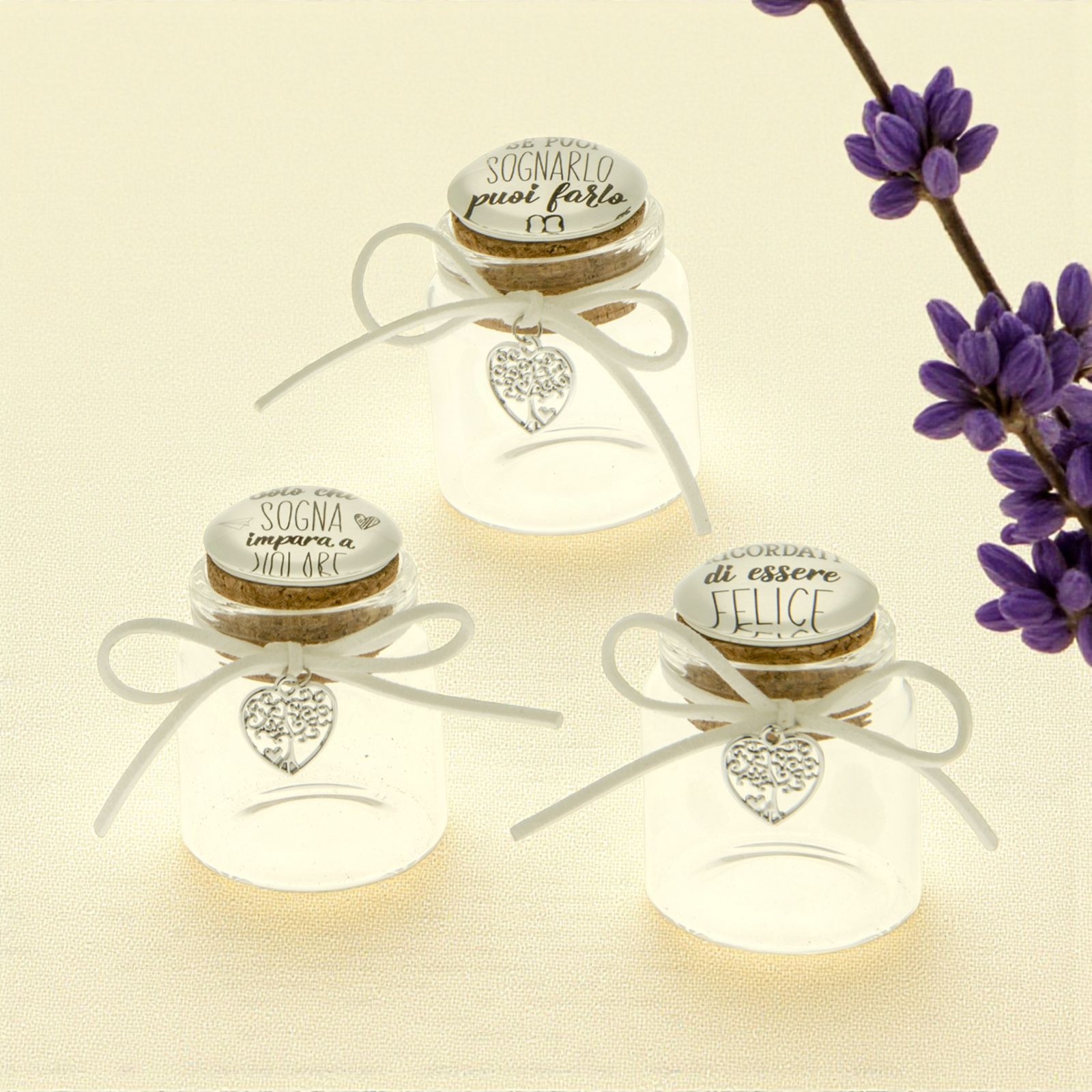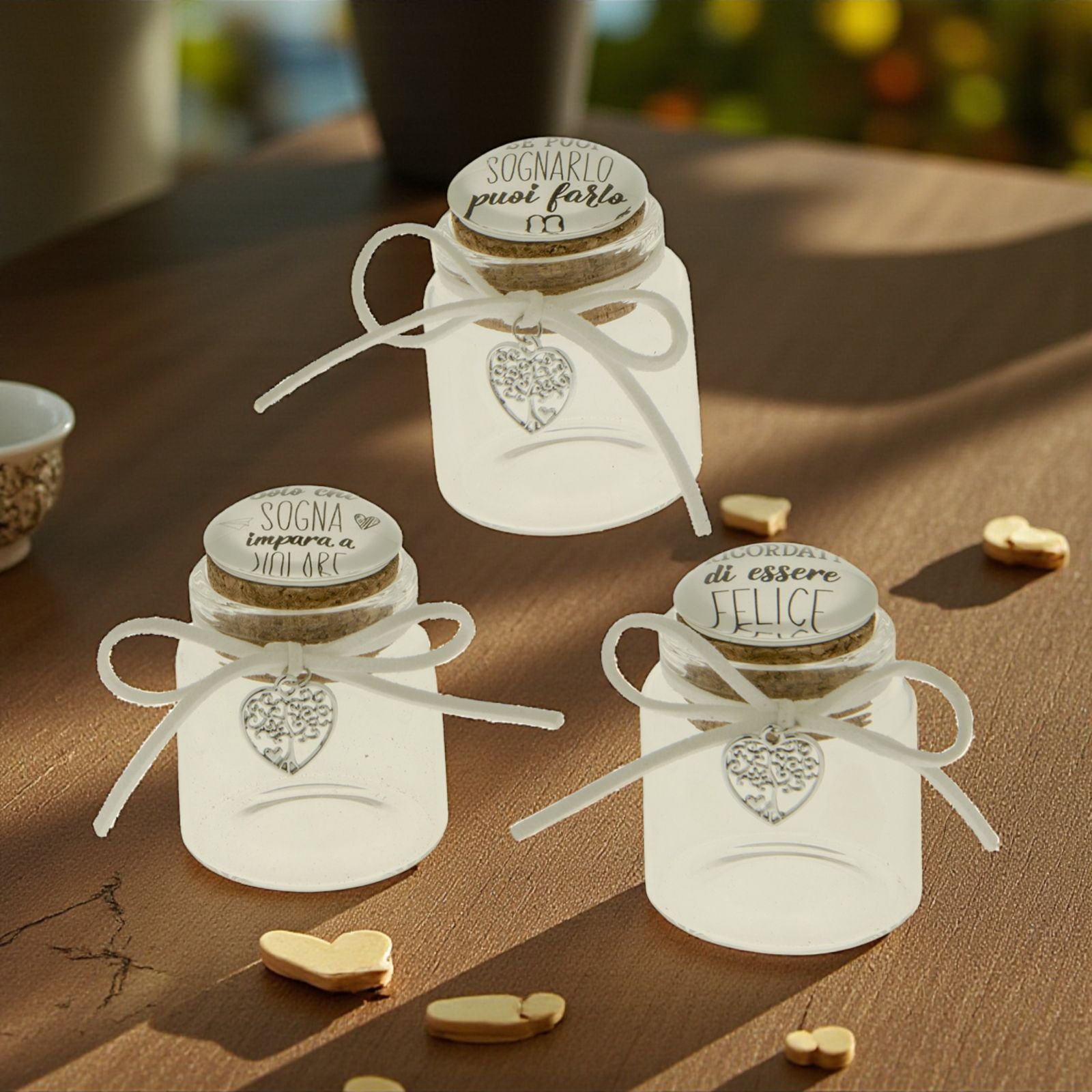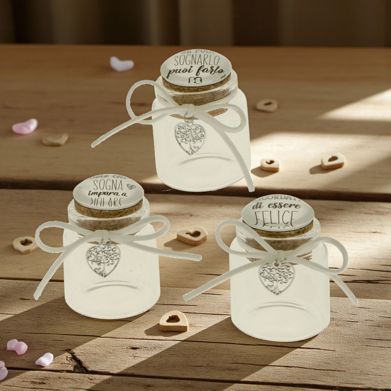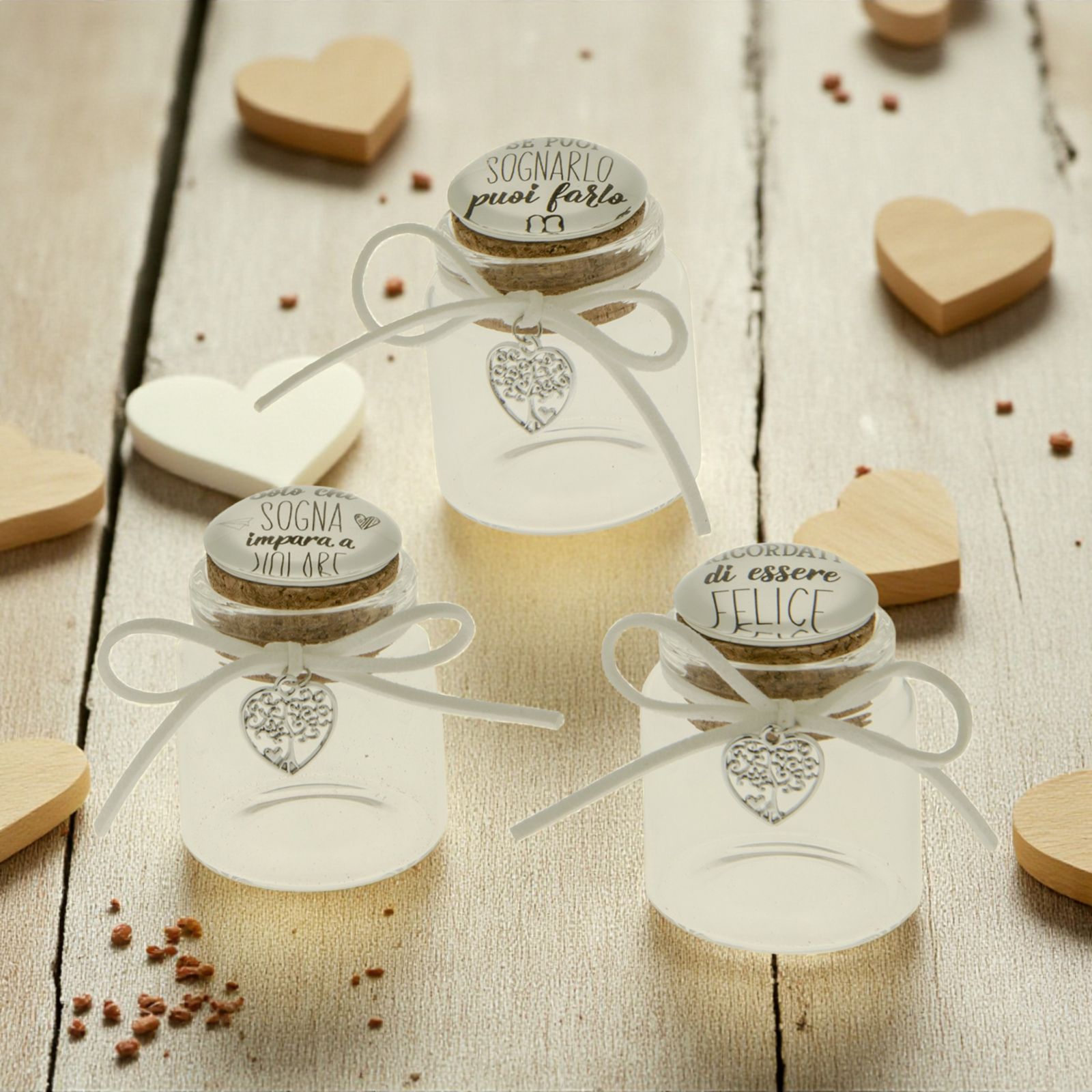 Per le tue confettate matrimonio scegli questi simpatici barattolini in vetro con coperchio in sughero che ha sulla superficie superiore tre frasi diverse: "Solo chi sogna impara a volare", "Ricordati di essere felice", "Se puoi sognarlo puoi farlo". AL collo del barattolino è legato un fiocco bianco con un charm a forma di cuore con all'interno un albero della vita.
