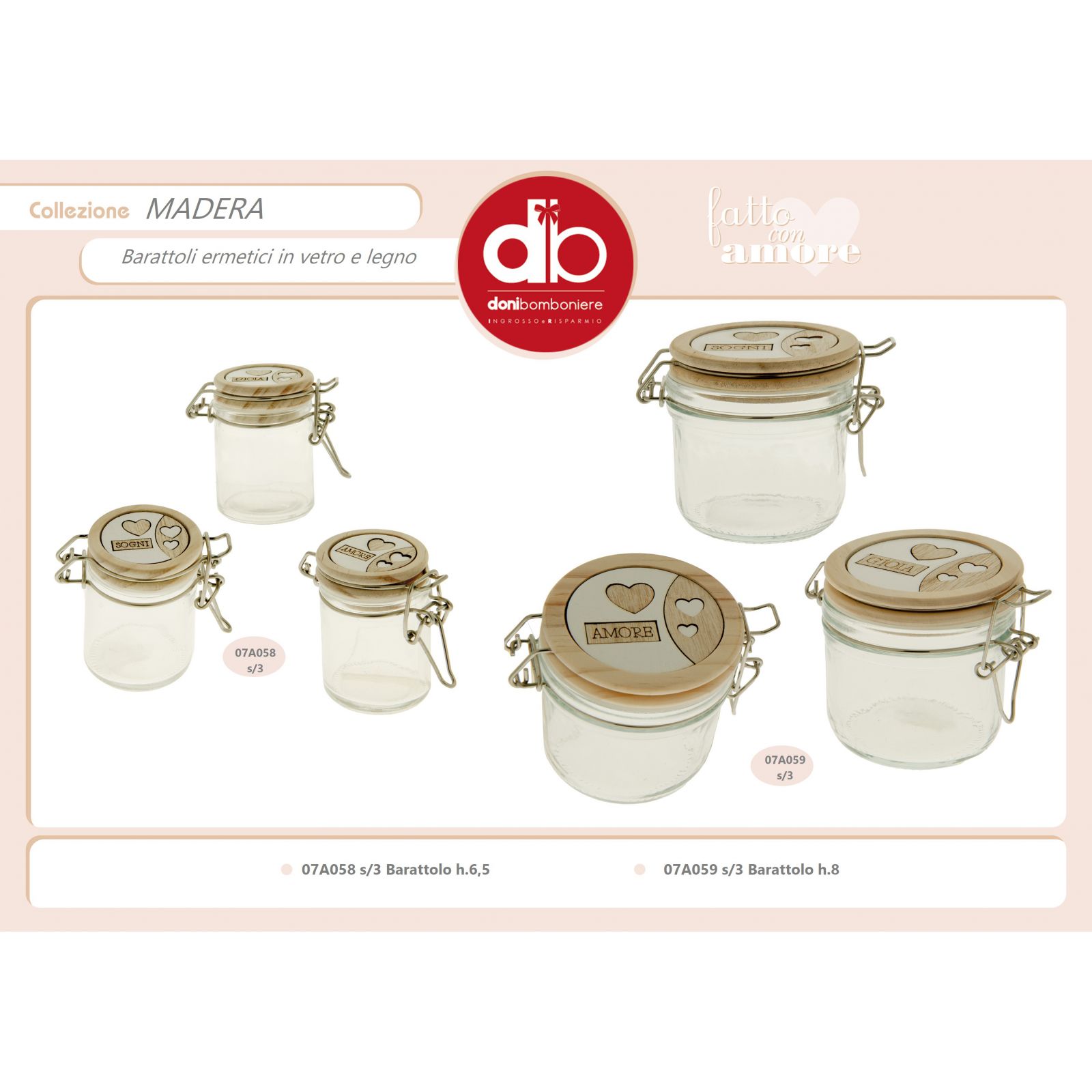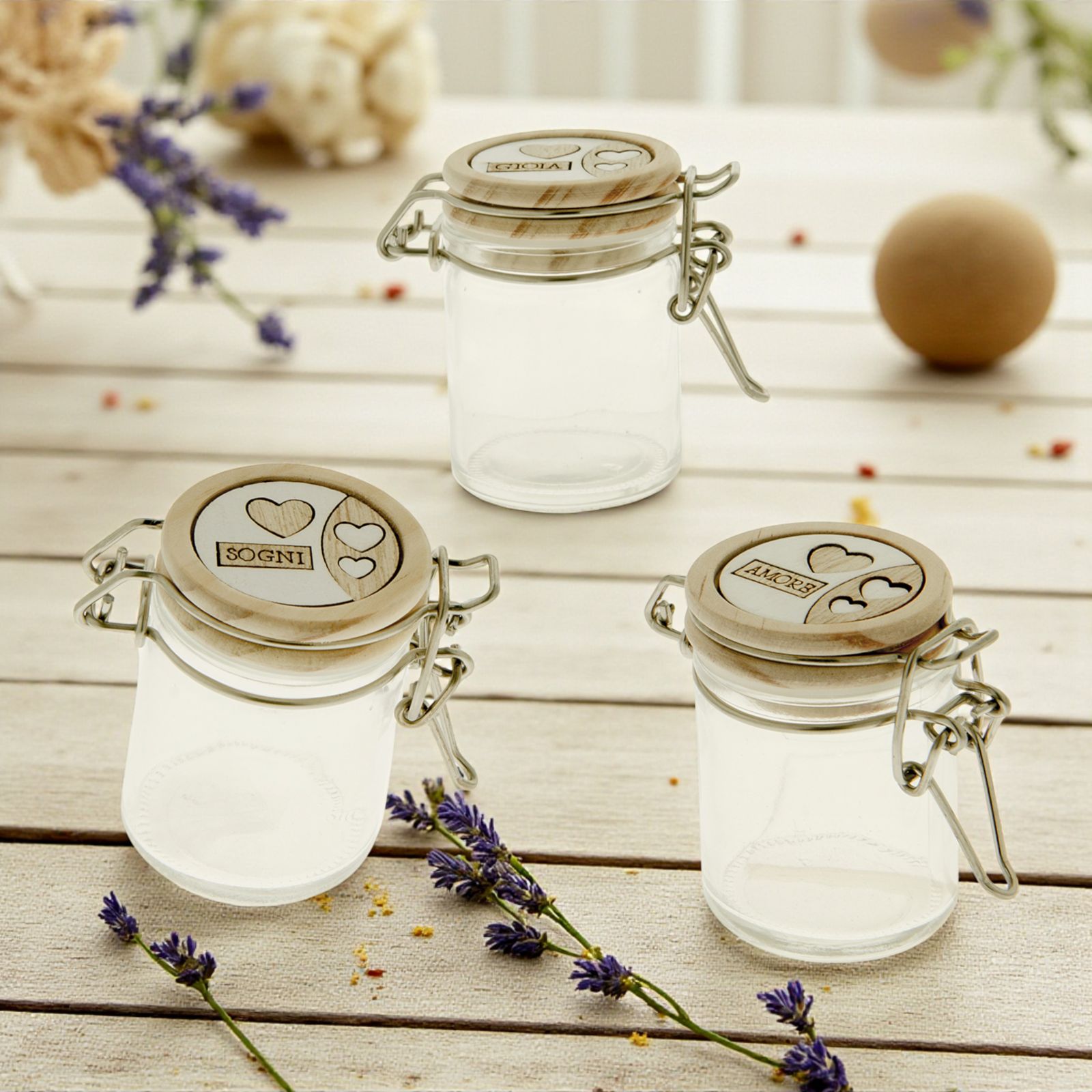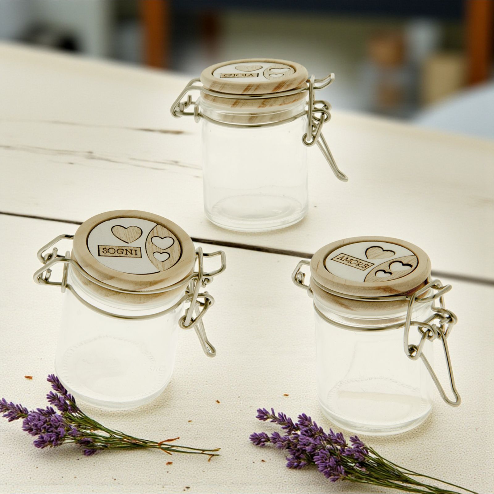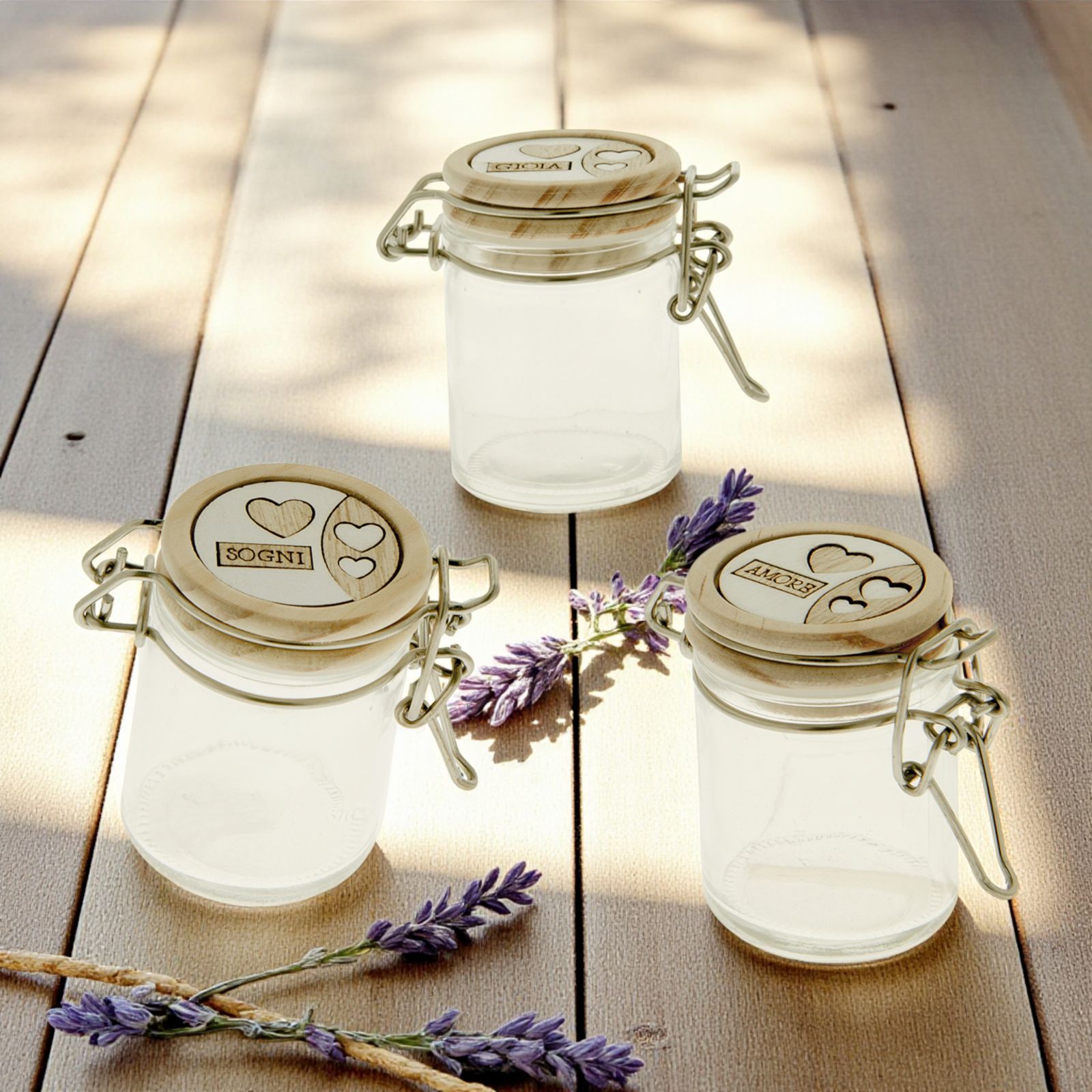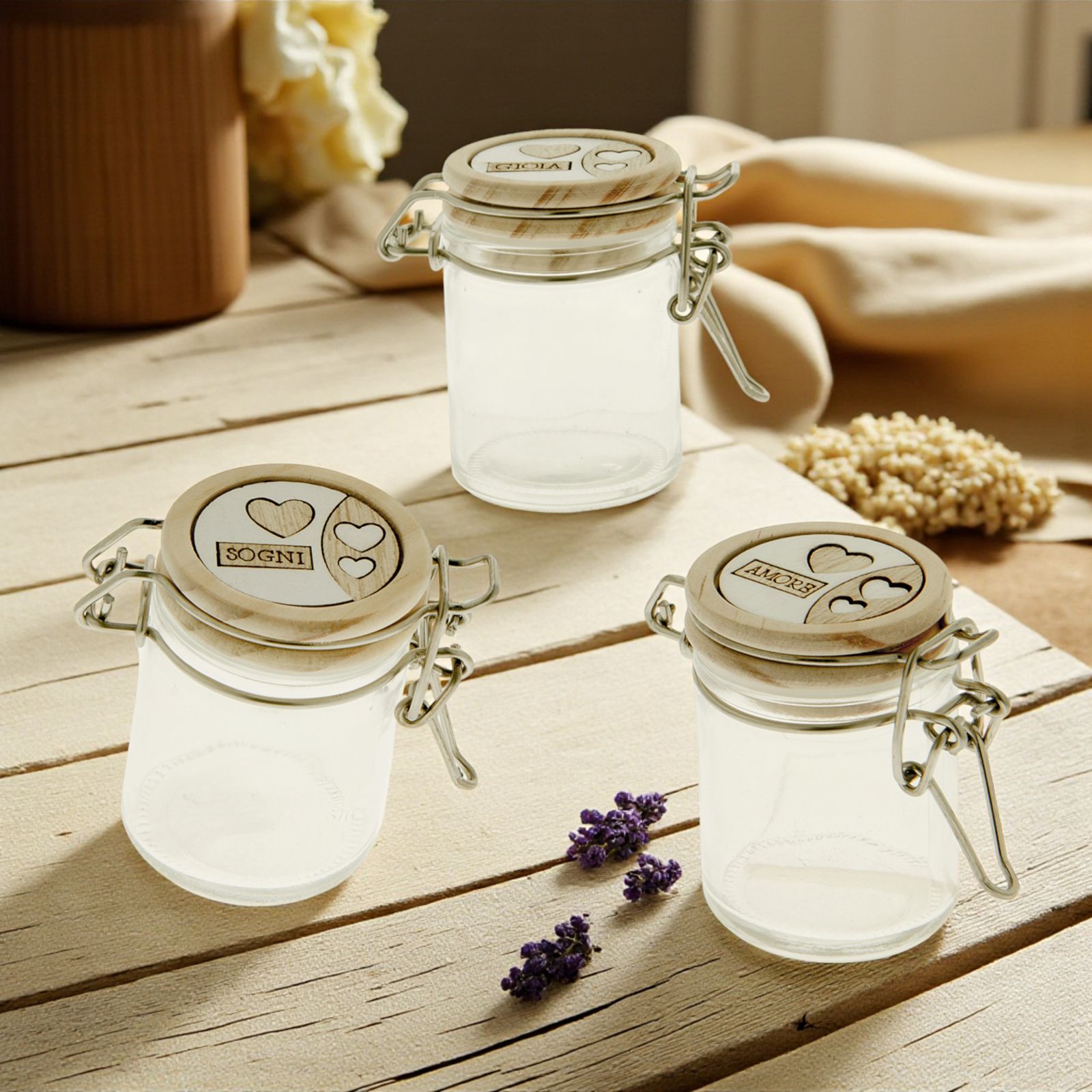 Splendidi barattolini in vetro con chiusura ermetica a leva in metallo, con base rotonda e forma cilindrica con tappo in legno naturale con piccole decorazioni incise a forma di cuore e 3 termini assortiti: "Gioia", "Sogni" e "Amore".