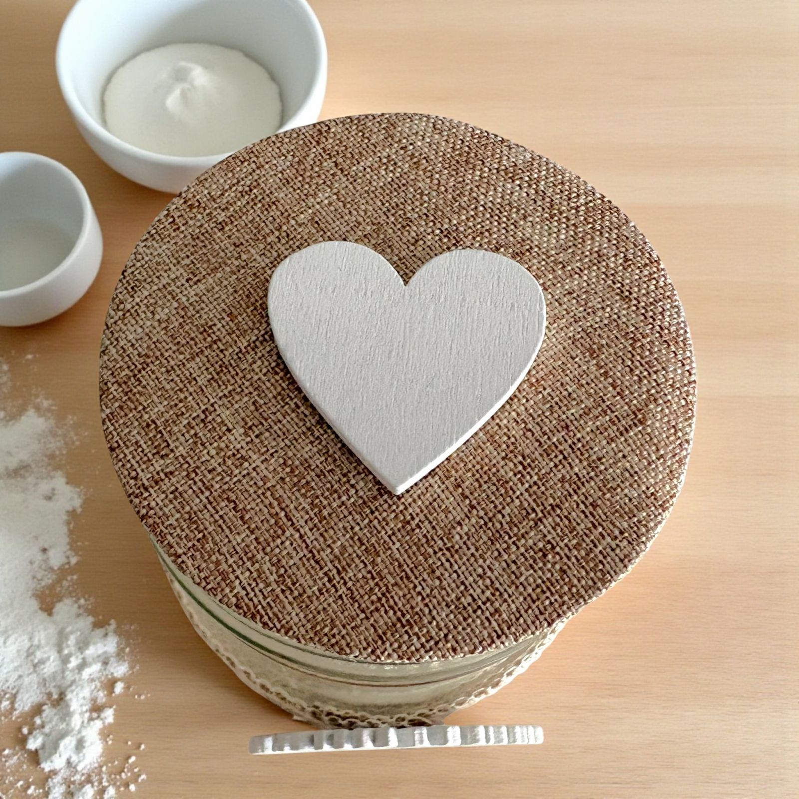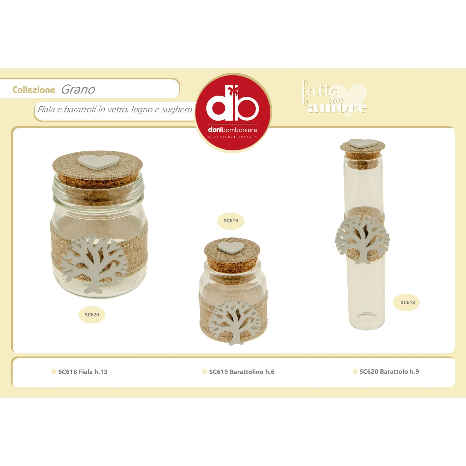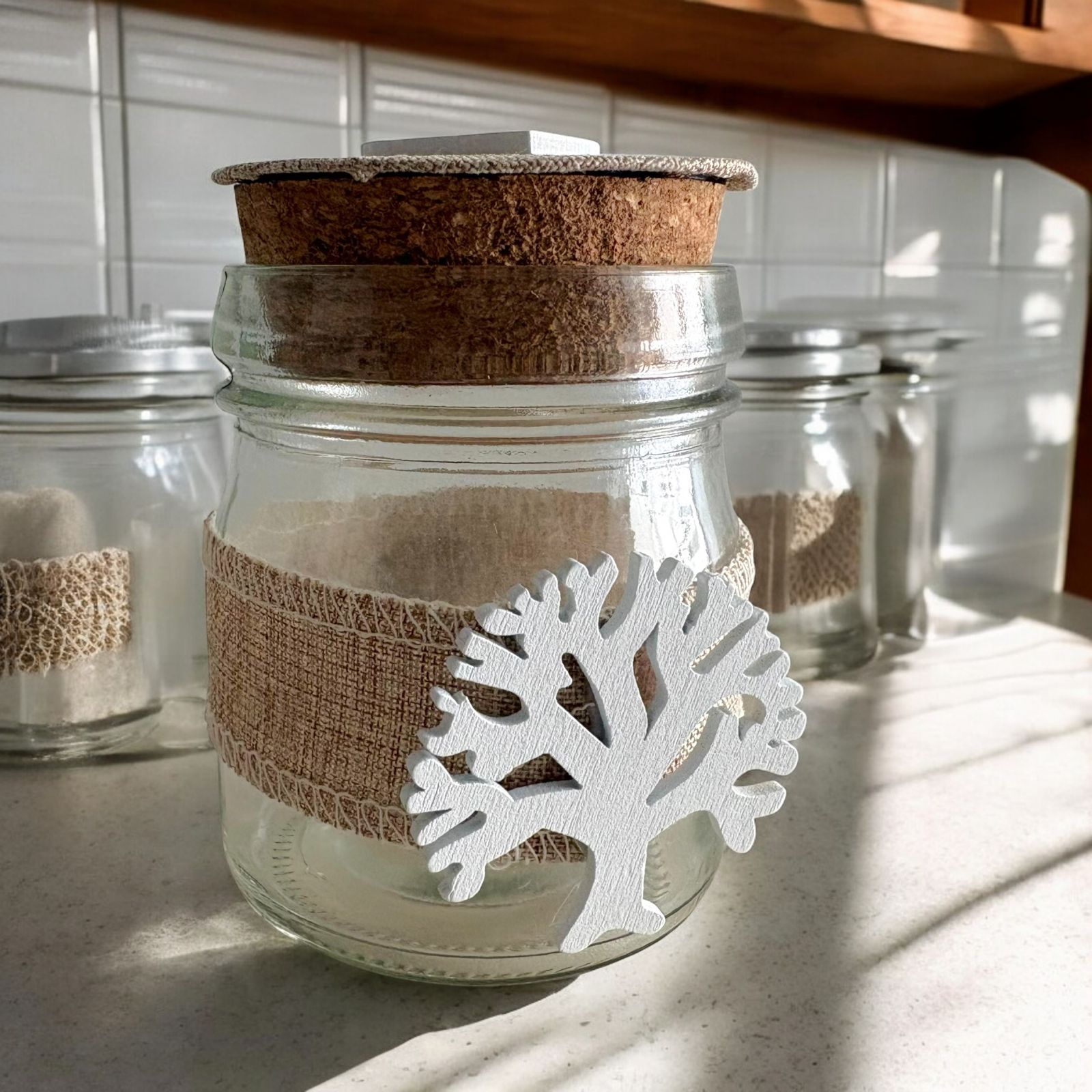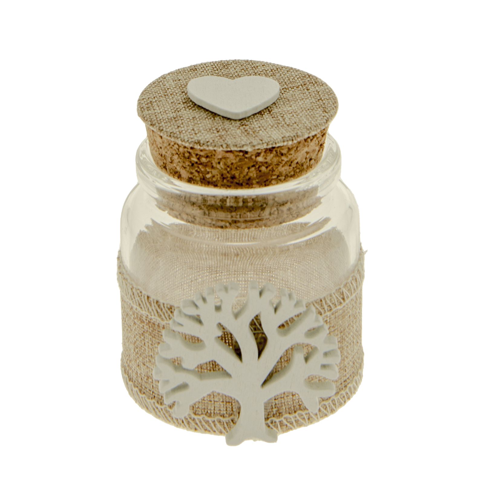 Disponibili per te questi barattoli portaconfetti in vetro con decorazione con nastro in iuta e albero della vita in legno bianco centrale. I vasetti portaconfetti presentano tappo in sughero rivestito di iuta con cuore bianco sulla parte superiore.