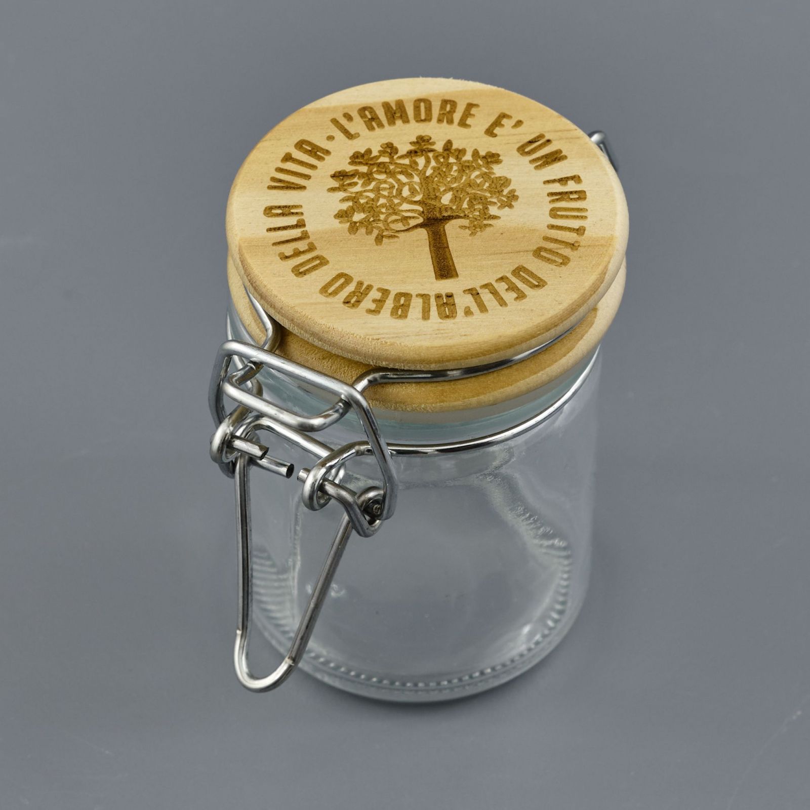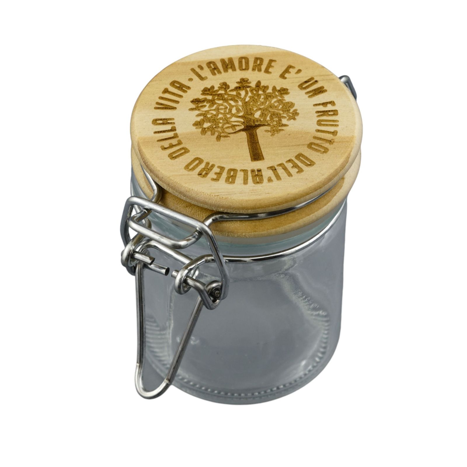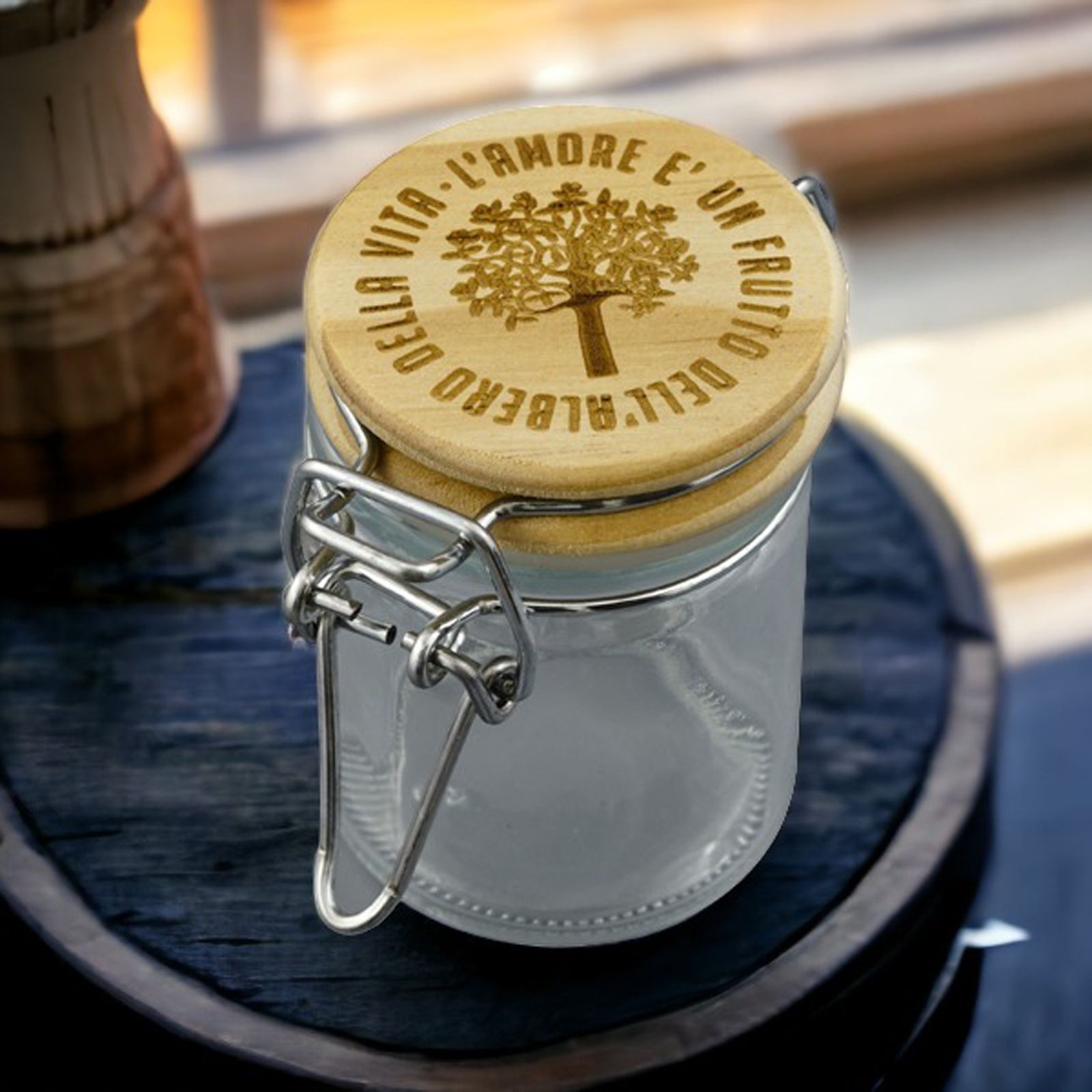 Regalare un barattolo con tappo in legno ermetico con incisione dell'albero della vita e frase "L'amore è un frutto dell'albero della vita" è un gesto ricco di significato. Questo porta spezie misura 4,5x4,7x7 ed è realizzato in vetro e legno, perfetto per contenere caramelle, confetti, marshmallow o altri dolci ideali per fare una confettata. Ideale per eventi come prima comunione, cresima, matrimonio, nozze e 18 anni, può essere decorato con un nastrino al collo per rendere l'idea regalo ancora più originale.