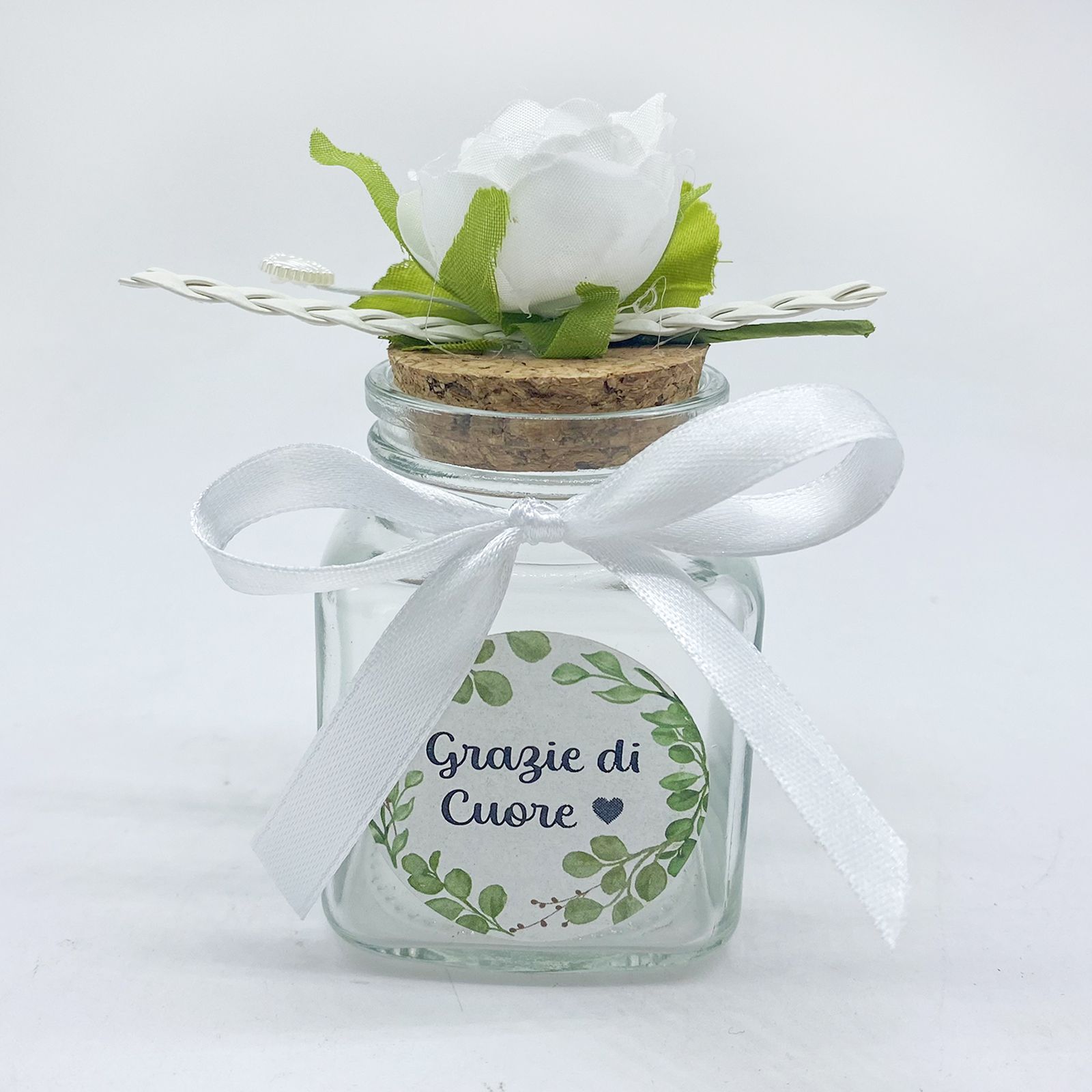 Scegli queste bomboniere per aggiungere un tocco di eleganza al tuo matrimonio, anniversario o promessa. La combinazione di vetro, sughero e TNT crea un equilibrio perfetto tra estetica e funzionalità, rendendo ogni barattolino un elemento distintivo e raffinato.