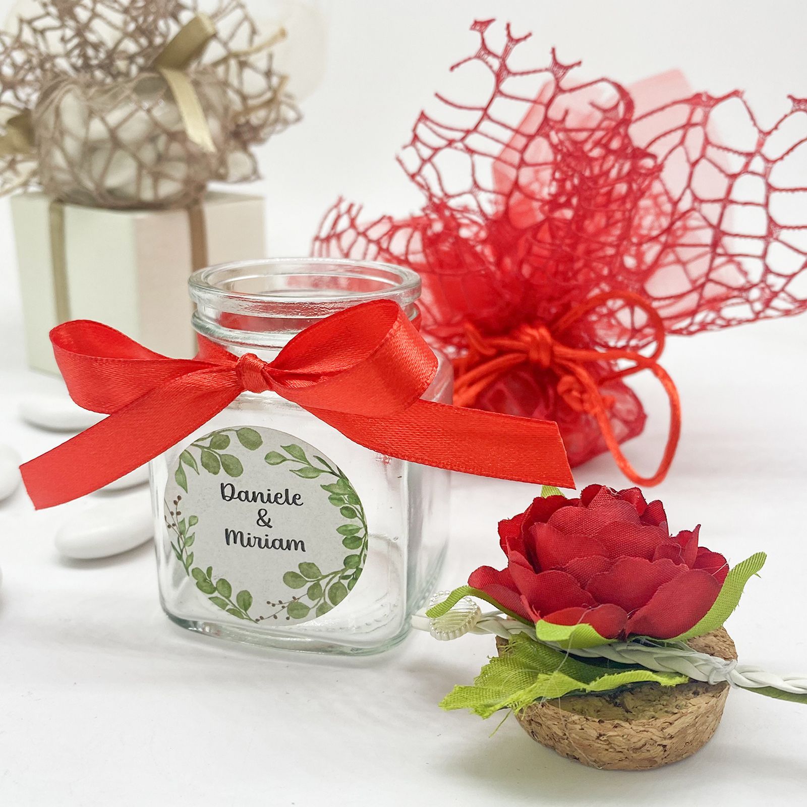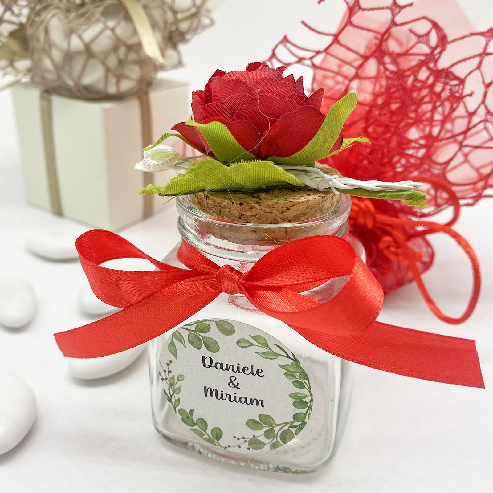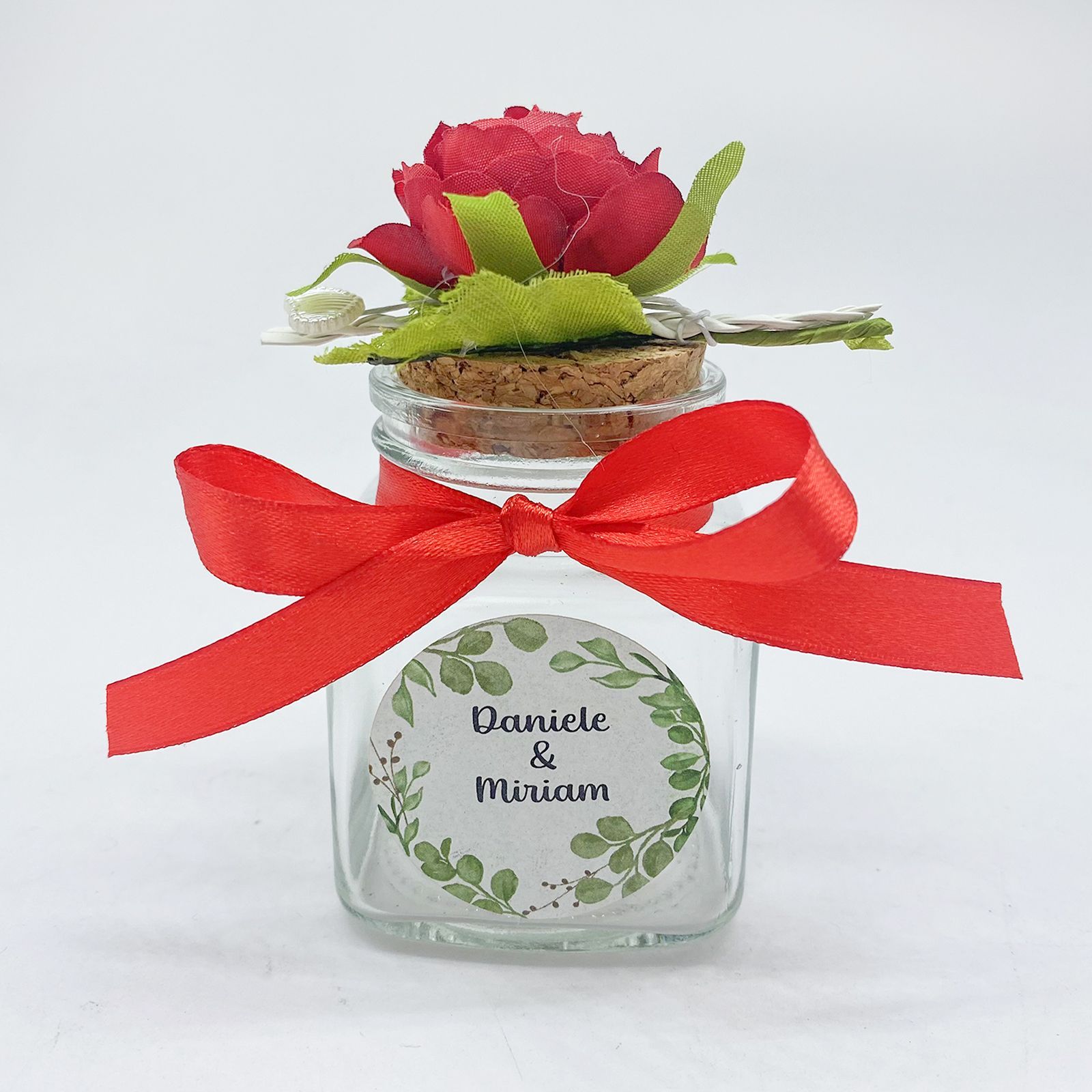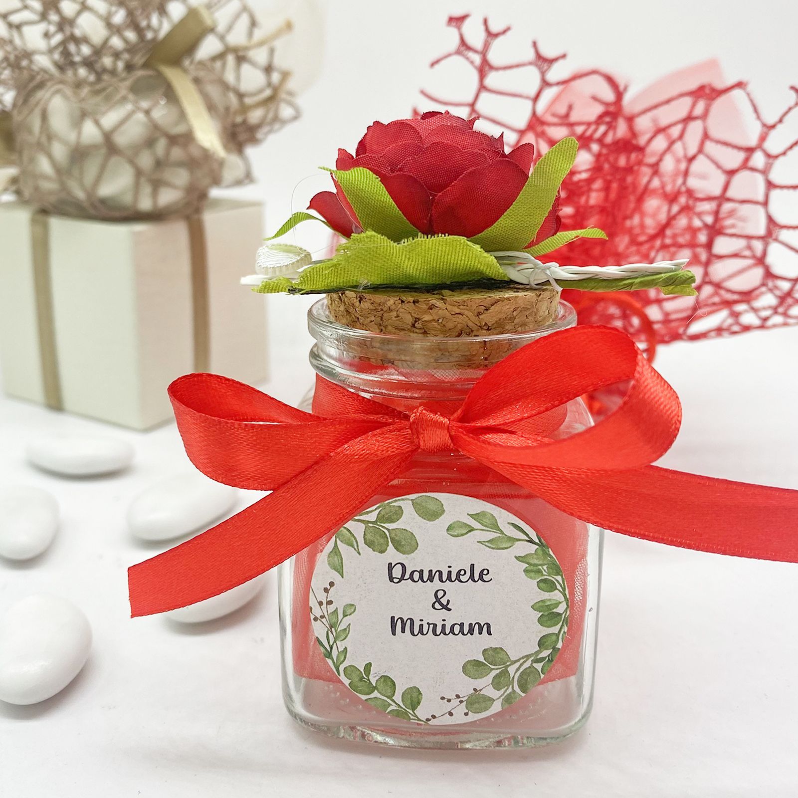 Celebra la laurea con un tocco di eleganza e originalità grazie al nostro barattolino portaconfetti con bocciolo rosso e foglie verdi. Con dimensioni di circa 7 cm x 5 cm, questo grazioso oggetto si distingue per la sua raffinatezza e cura dei dettagli.