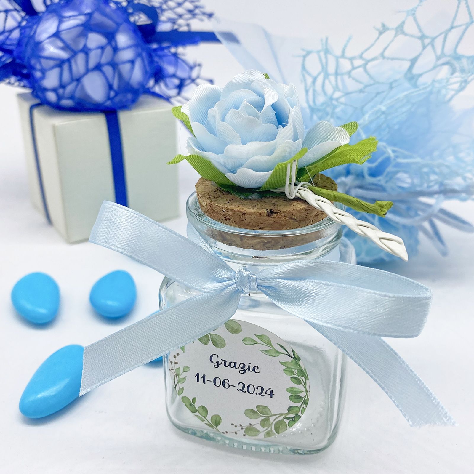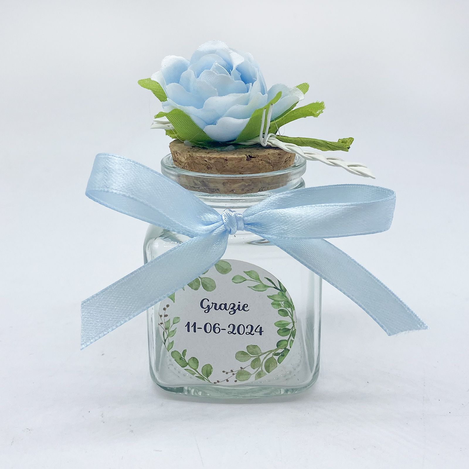 Scopri l'eleganza del nostro barattolino portaconfetti con fiore celeste, decorato con foglie verdi, cuoricino bianco e trecciolina. Questo raffinato barattolo è completato da un tappo in sughero e sul davanti è posto un elegante adesivo personalizzabile con il nome del festeggiato, rendendolo perfetto per ogni occasione speciale.