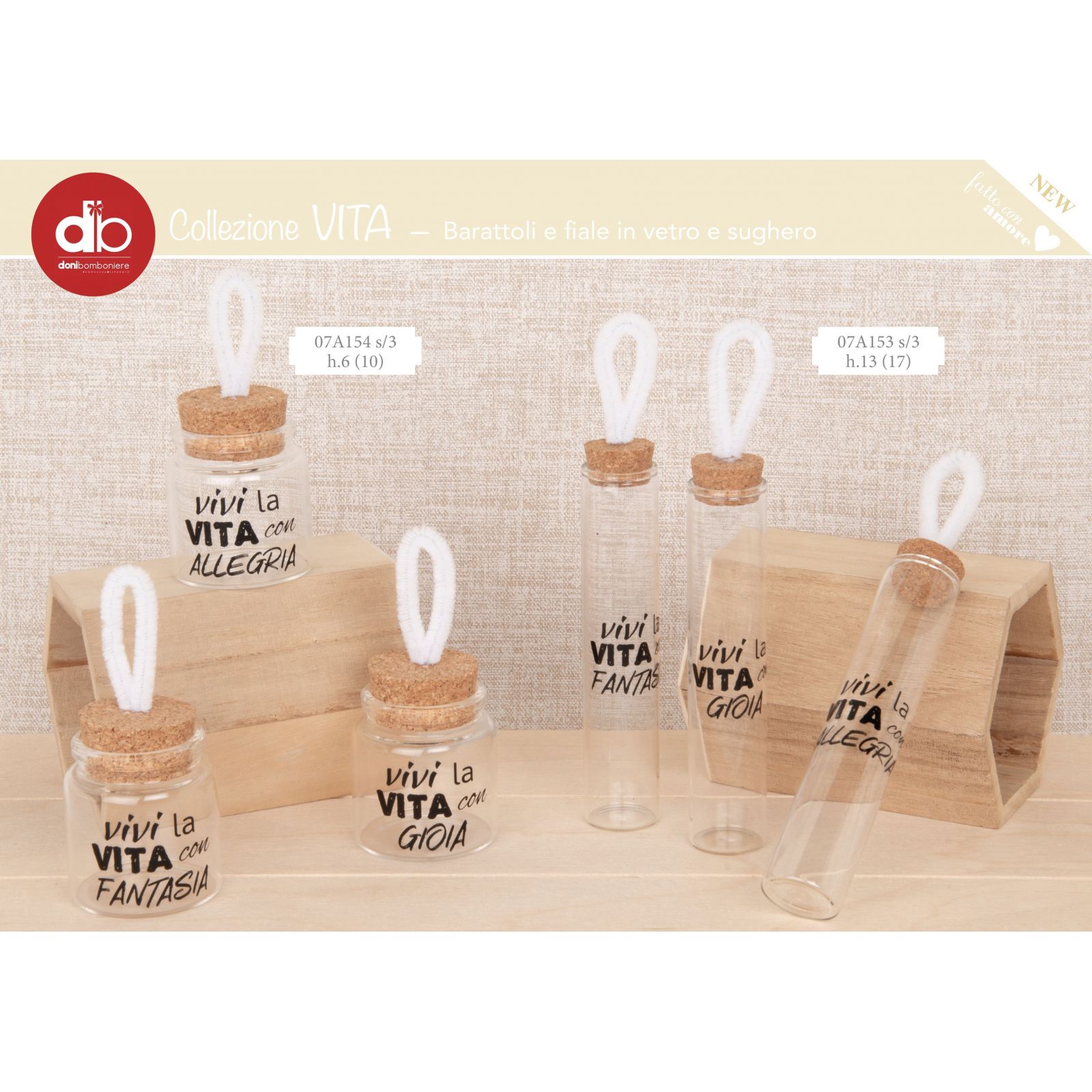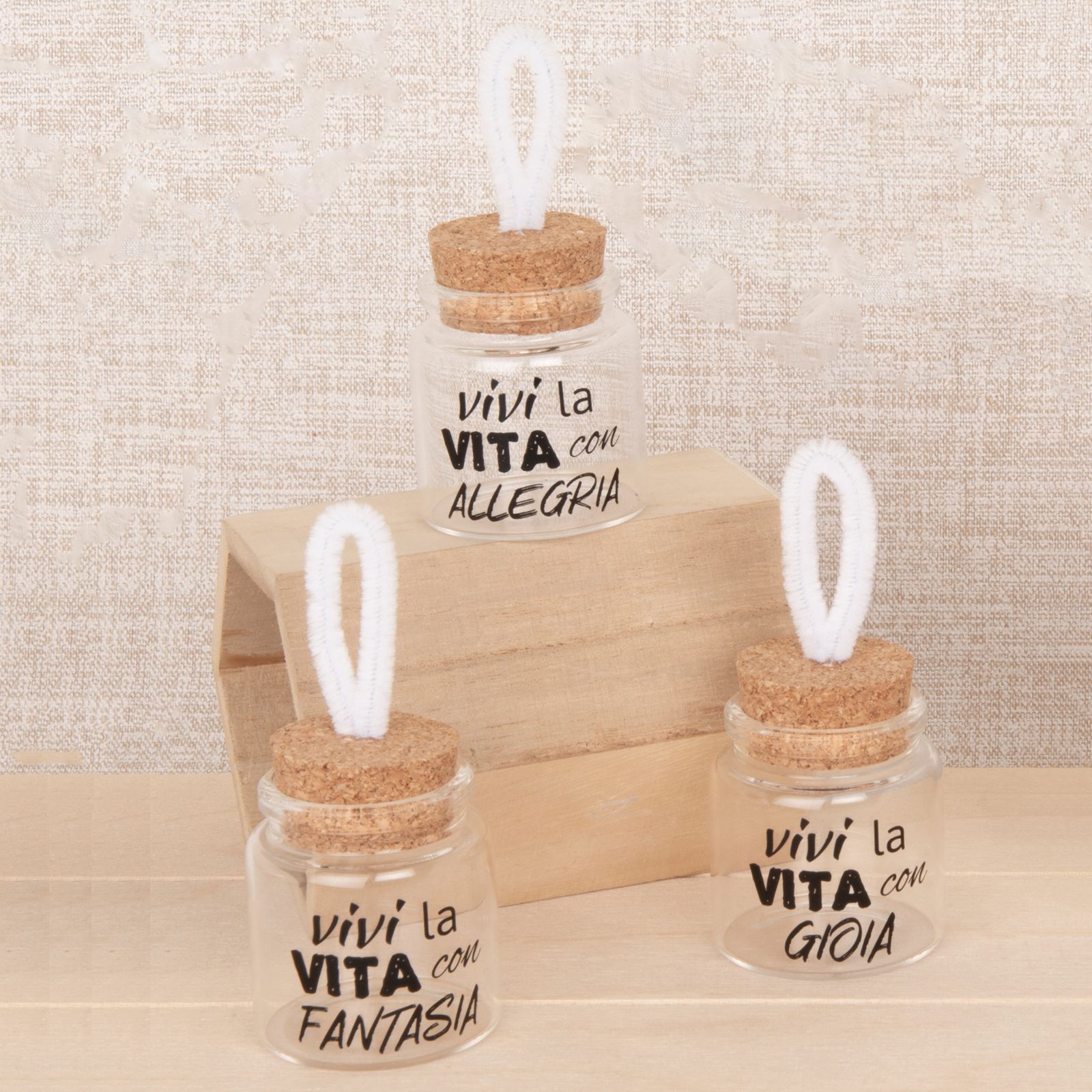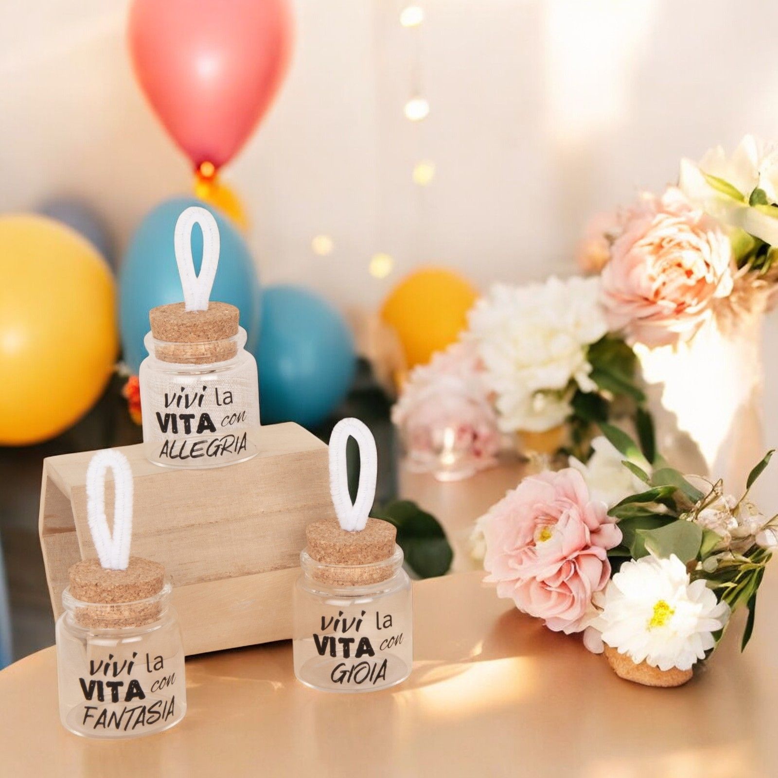 Per rendere davvero indimenticabile il tuo evento, scegli di regalare ai tuoi invitati il vasetto per confetti con tappo in sughero e appendino in corda. Ogni modello, "Vivi la vita con allegria", "Vivi la vita con fantasia" e "Vivi la vita con gioia", porta con sé un messaggio positivo e allegro che renderà speciale ogni momento.