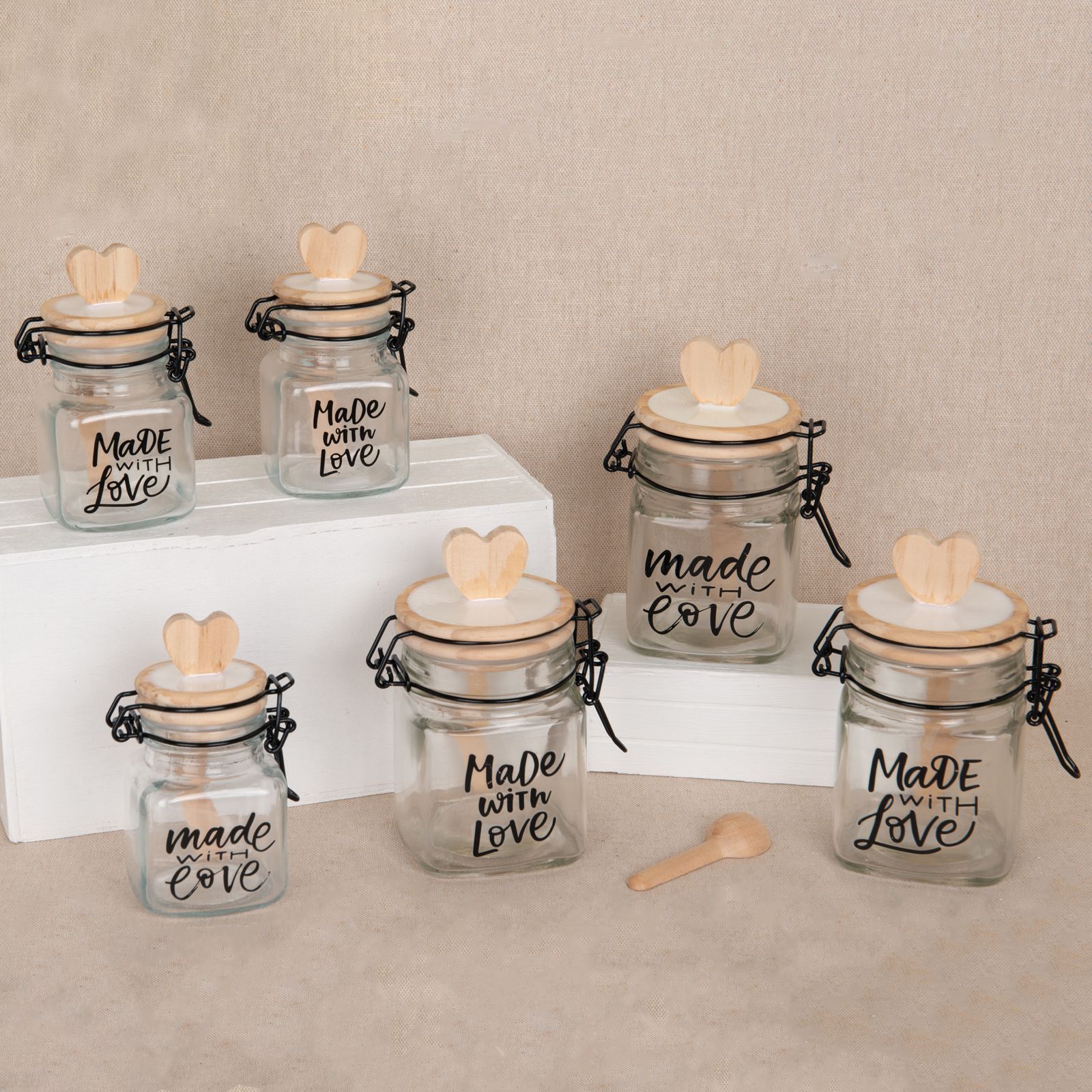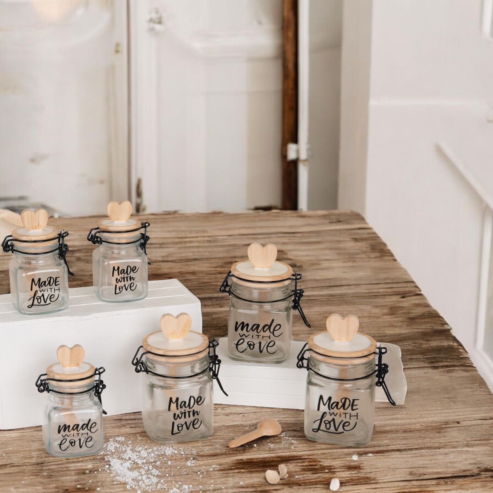 Questo elegante barattolo ermetico con tappo in legno a forma di cuore è perfetto come bomboniera per il tuo matrimonio, anniversario o promessa. Realizzato con materiali di alta qualità, questo prodotto è disponibile in due dimensioni: standard, con un'altezza di circa 10 cm, e grande, con un'altezza di circa 12,5 cm. Il colore nero della scritta "made with love" conferisce un tocco di eleganza e raffinatezza al regalo.