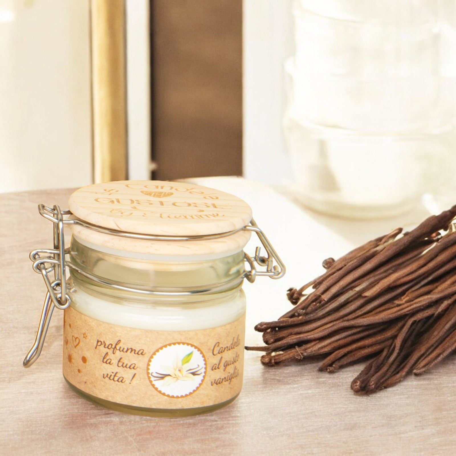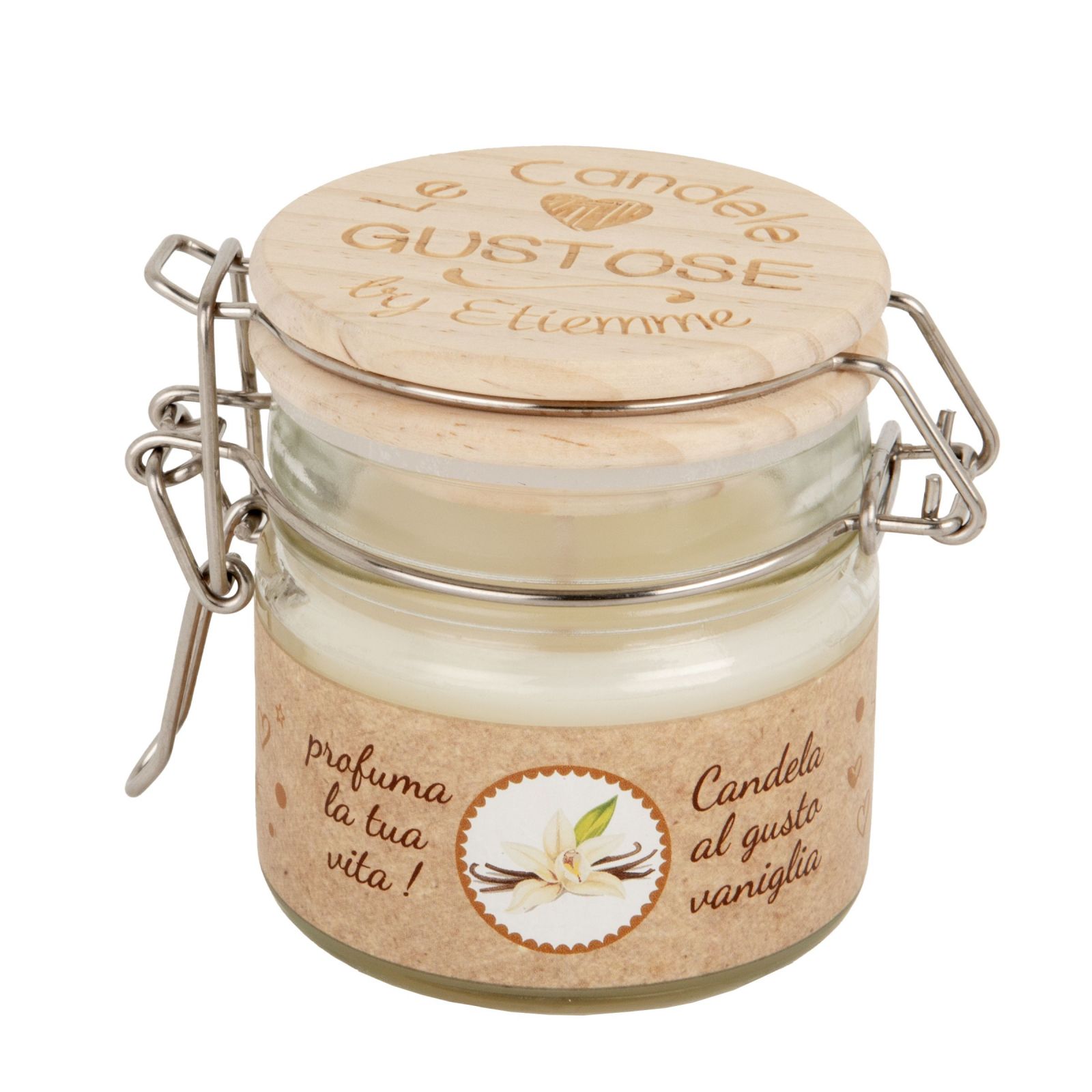 Barattolino con chiusura ermetica con scritta sul tappo Le candele Gustose, con all'interno candela al gusto vaniglia.