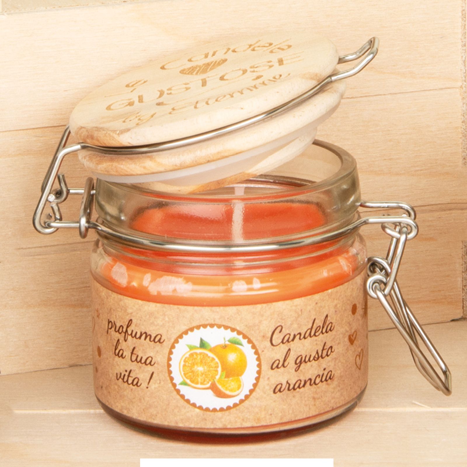 Il barattolino con chiusura ermetica con la scritta "Le candele Gustose" è un'idea originale e particolare per regalare agli invitati alla cerimonia. All'interno, troverai una candela al gusto arancia, che renderà l'ambiente profumato e accogliente.