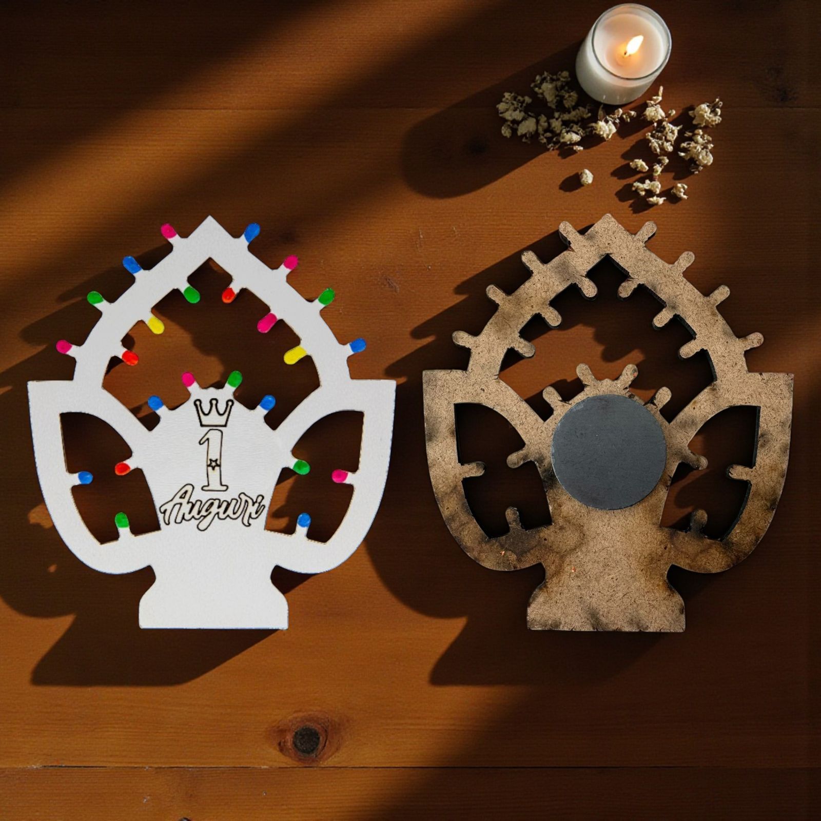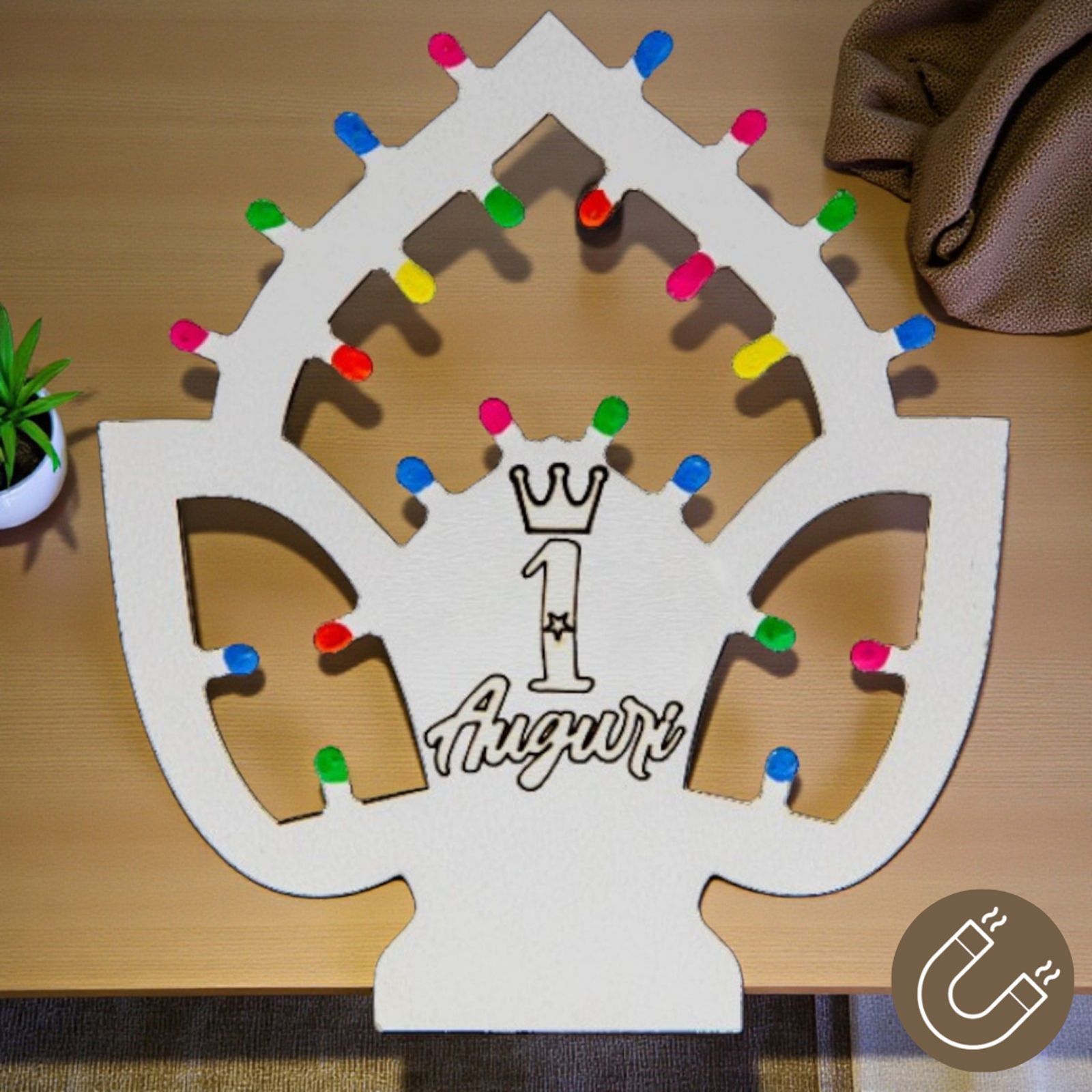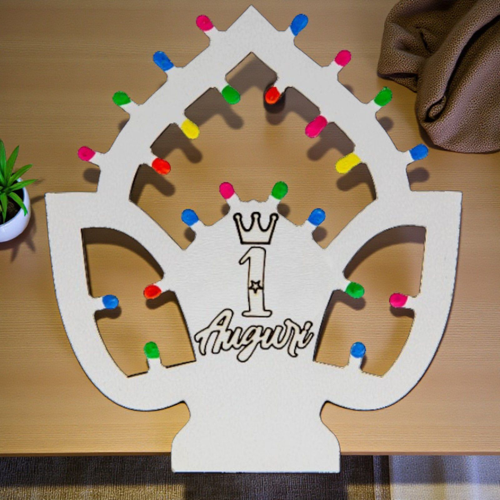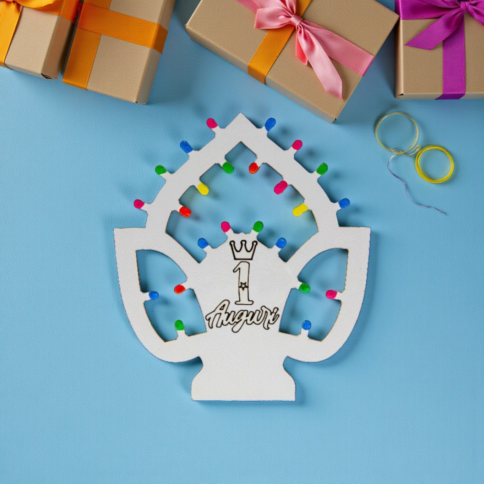 Queste deliziose bomboniere 1 anno non sono solo un segnaposto, ma un simbolo di un anno pieno di scoperte e sorrisi. Le luminarie pugliesi aggiungono un tocco di magia, grazie alle loro "lucine" disponibili nei colori multicolor, rosa o celeste. La scritta "1 Auguri" con corona, incisa con cura, renderà ogni occasione ancora più festosa e indimenticabile.