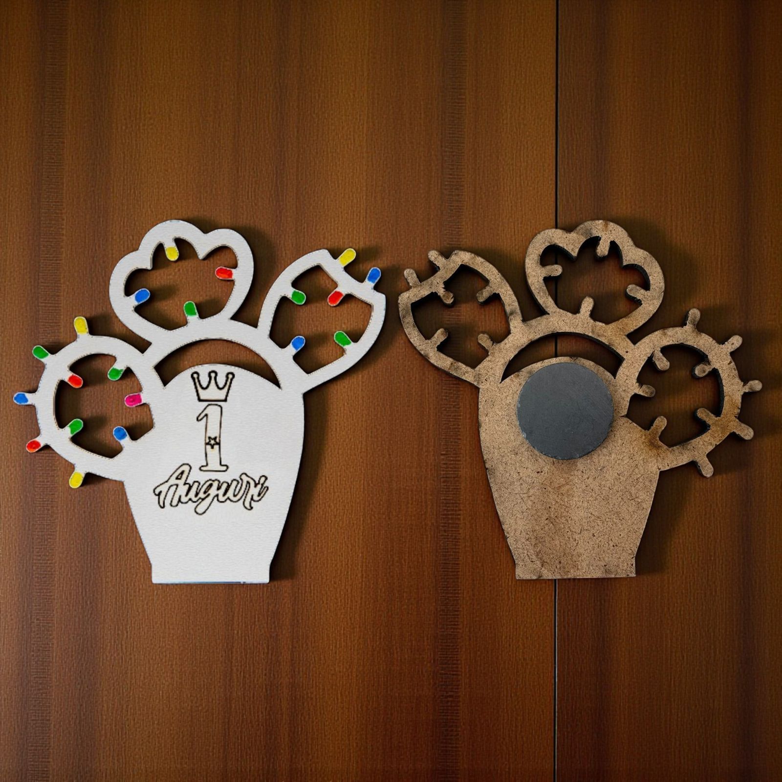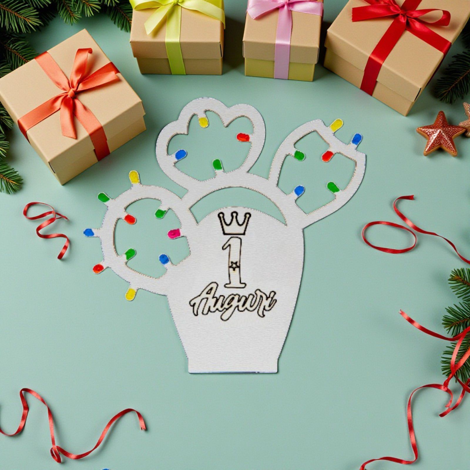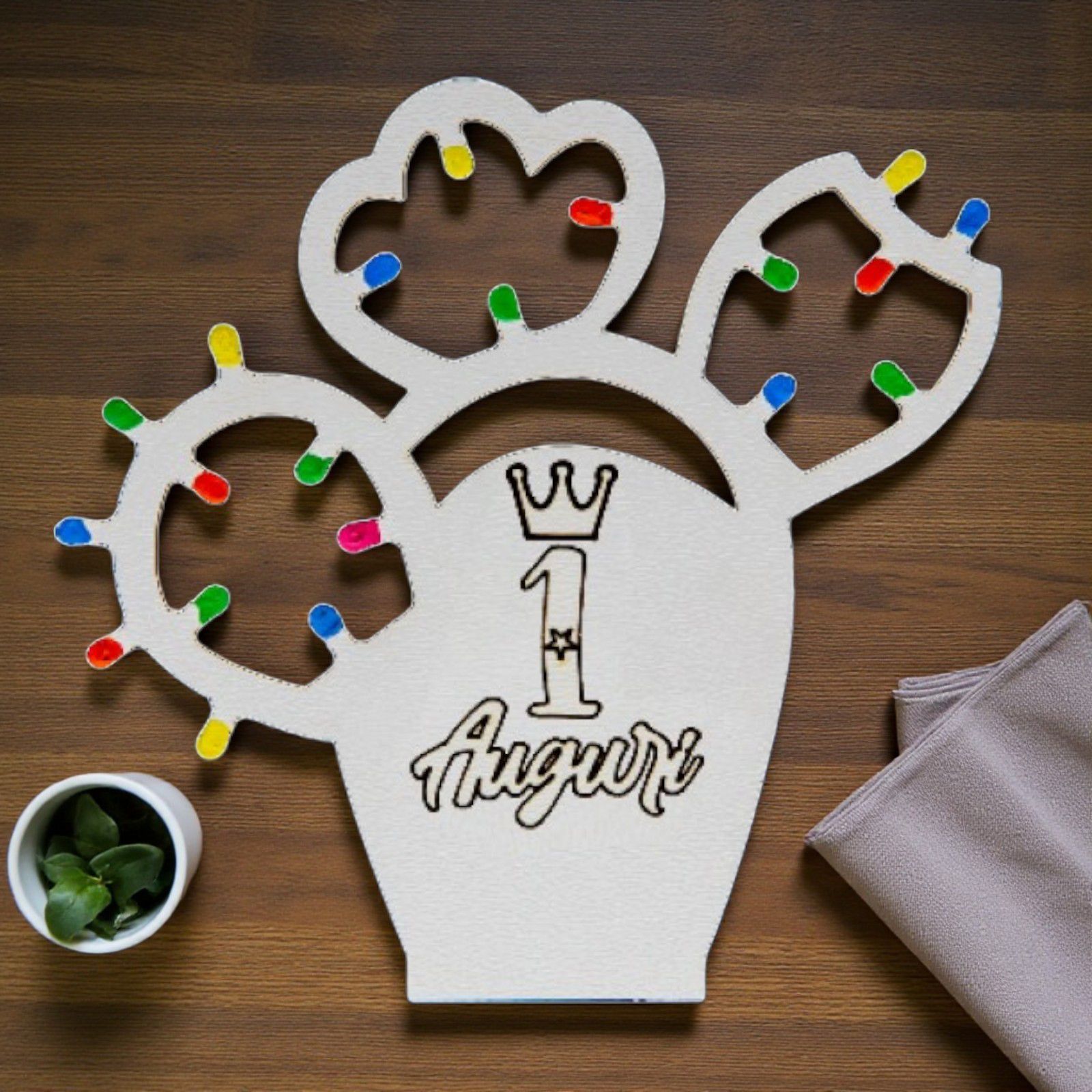 Realizzate in legno pregiato, queste bomboniere primo compleanno sono decorate con "lucine", che aggiungono un tocco di magia al tuo evento. Le "lucine" del cactus sono disponibili in tre varianti di colore: multicolor, rosa o celeste, per adattarsi perfettamente al tema della tua festa. Al centro, l’incisione “1 Auguri” con una corona, rende ogni pezzo unico e personalizzato, un ricordo indelebile di un momento felice.
