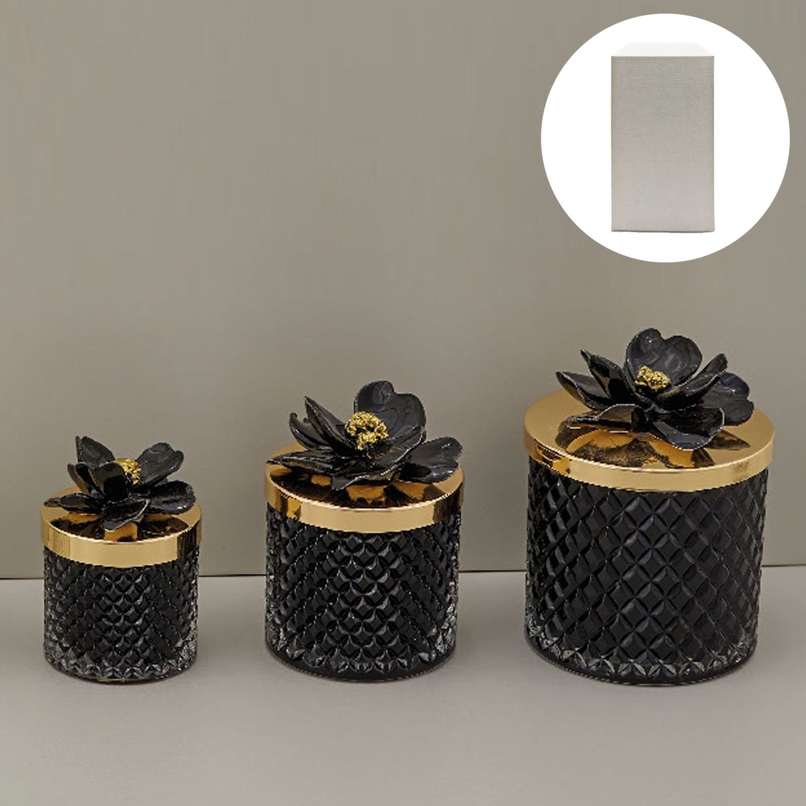 Celebra i momenti più importanti della tua vita con un dono raffinato e unico. La nostra candela in vetro effetto diamante, decorata con un esclusivo coperchio oro ornato da un delicato fiore nero, è il simbolo perfetto di eleganza e gratitudine verso i tuoi ospiti. Un regalo che lascia il segno e aggiunge un tocco di classe alla tua cerimonia.