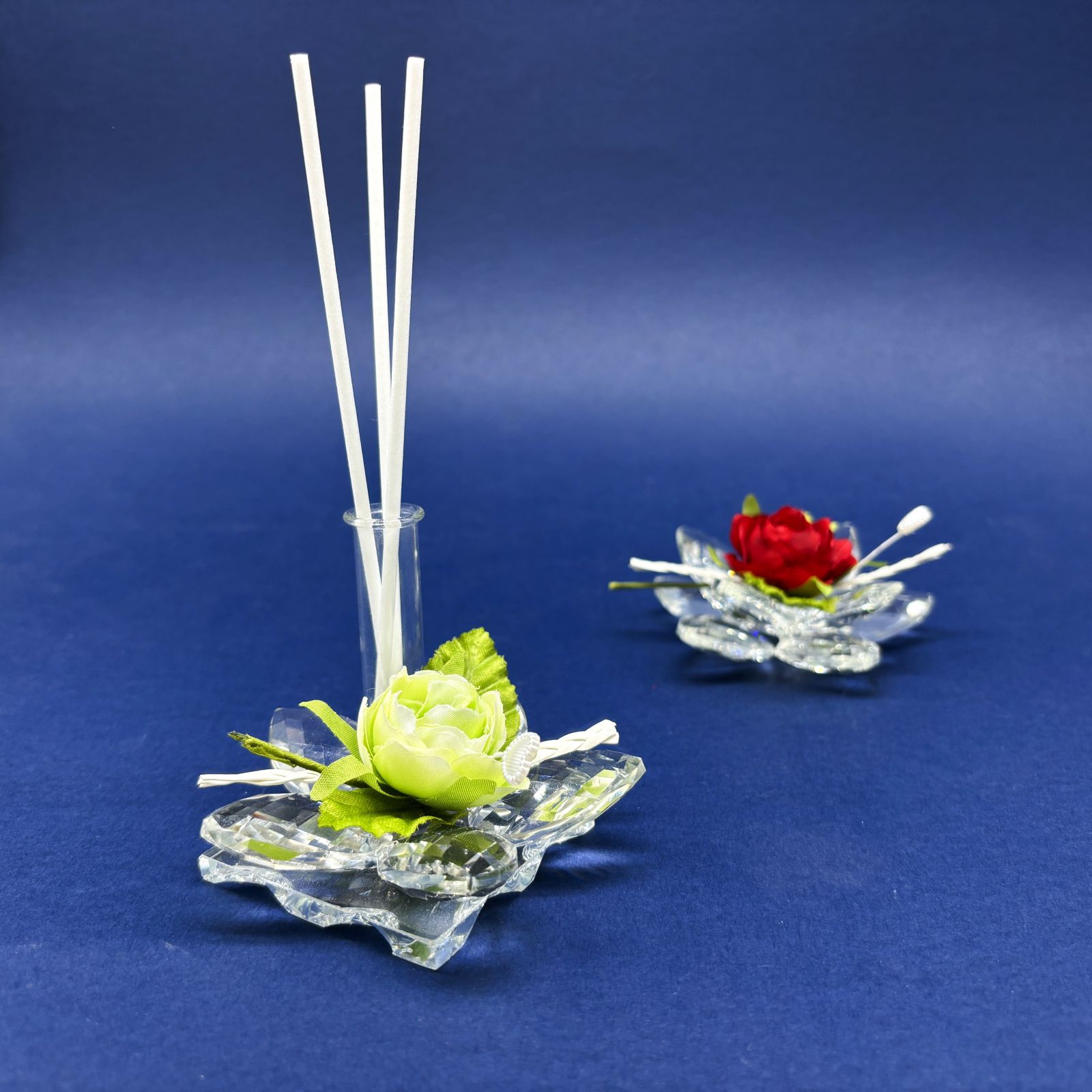 Il diffusore essenza con fiala portaprofumo e rosa è un regalo unico che lascerà un'impressione indelebile. La rosa con 9 petali e all'interno una rosellina finta con foglie, trecciolina e cuoricino aggiunge un tocco di eleganza e raffinatezza.