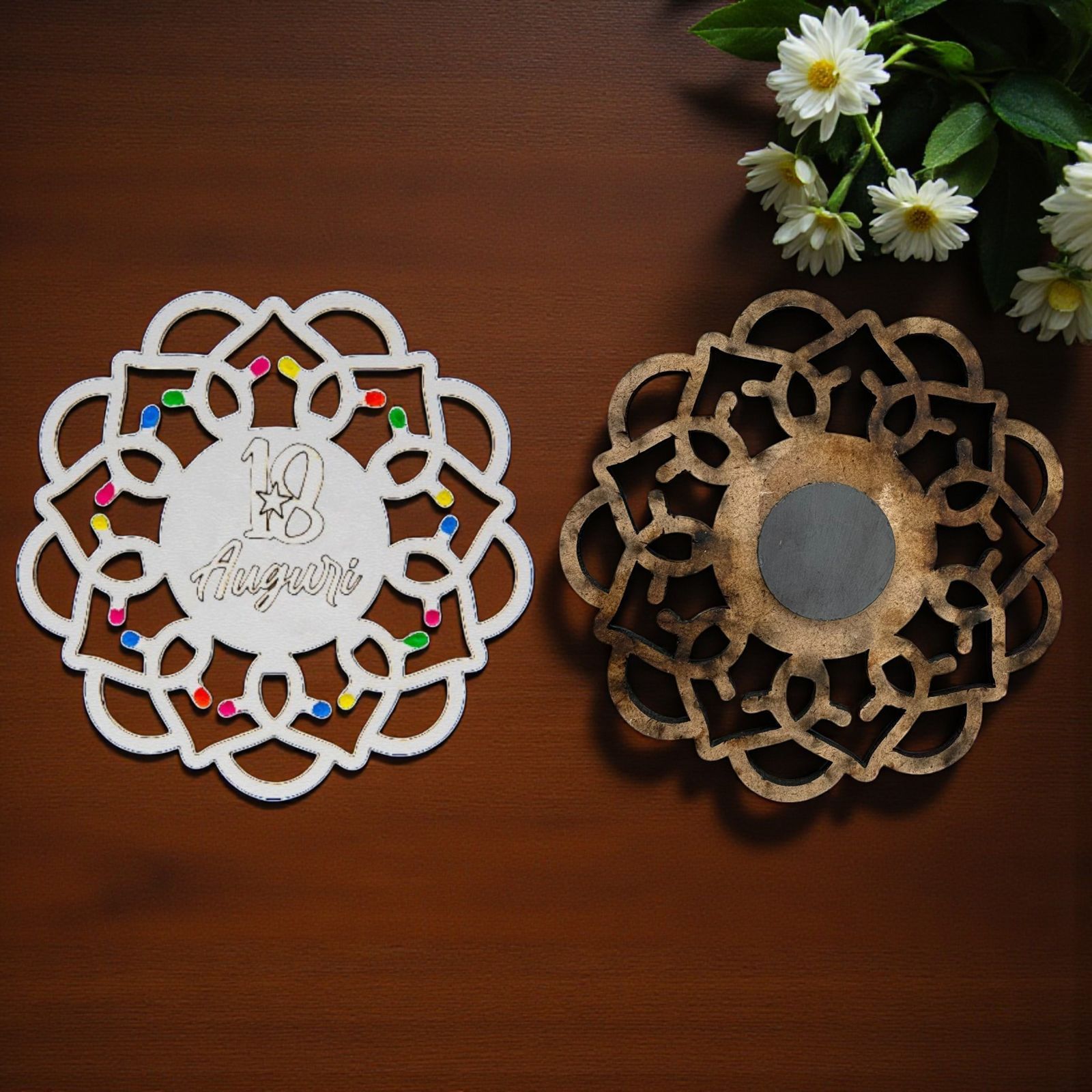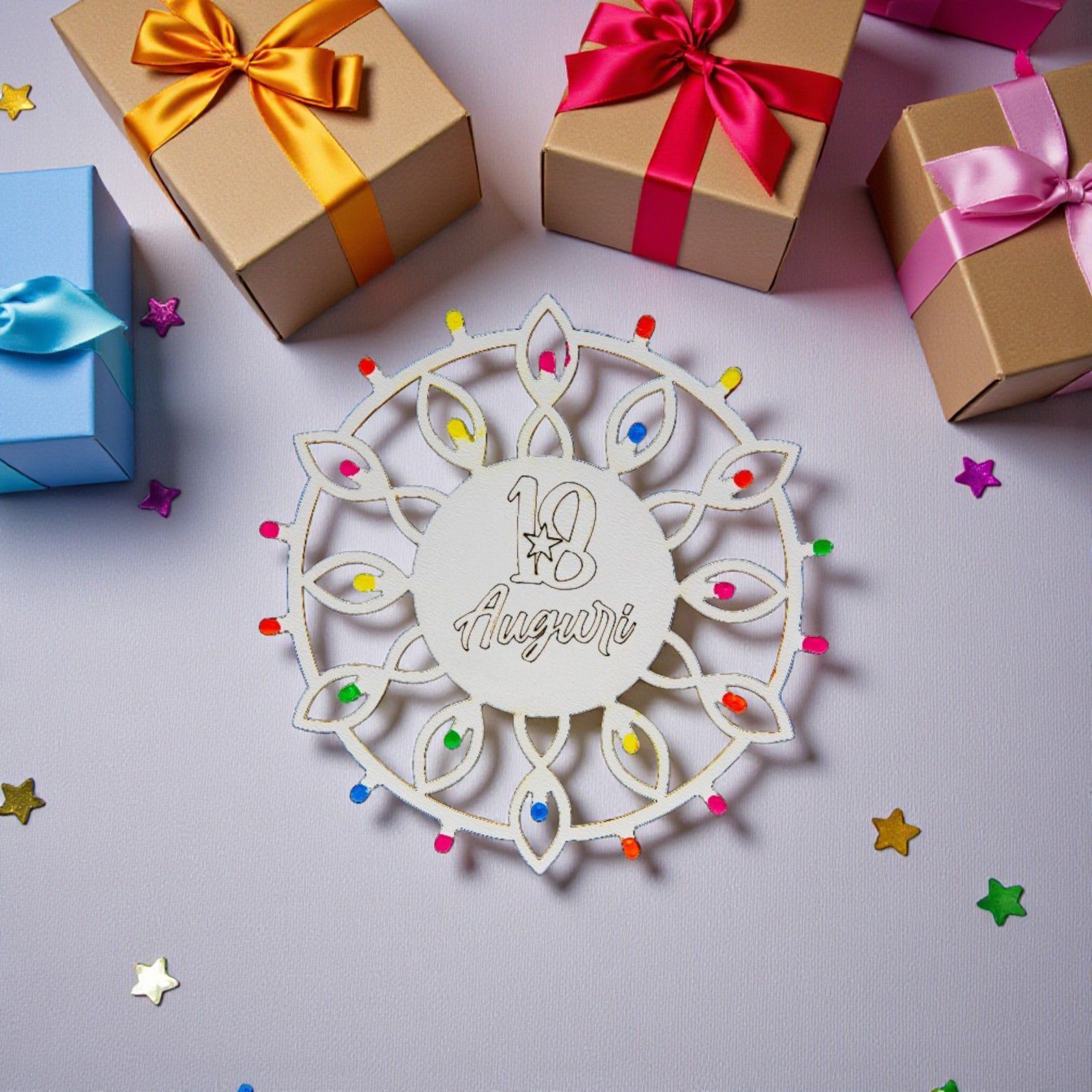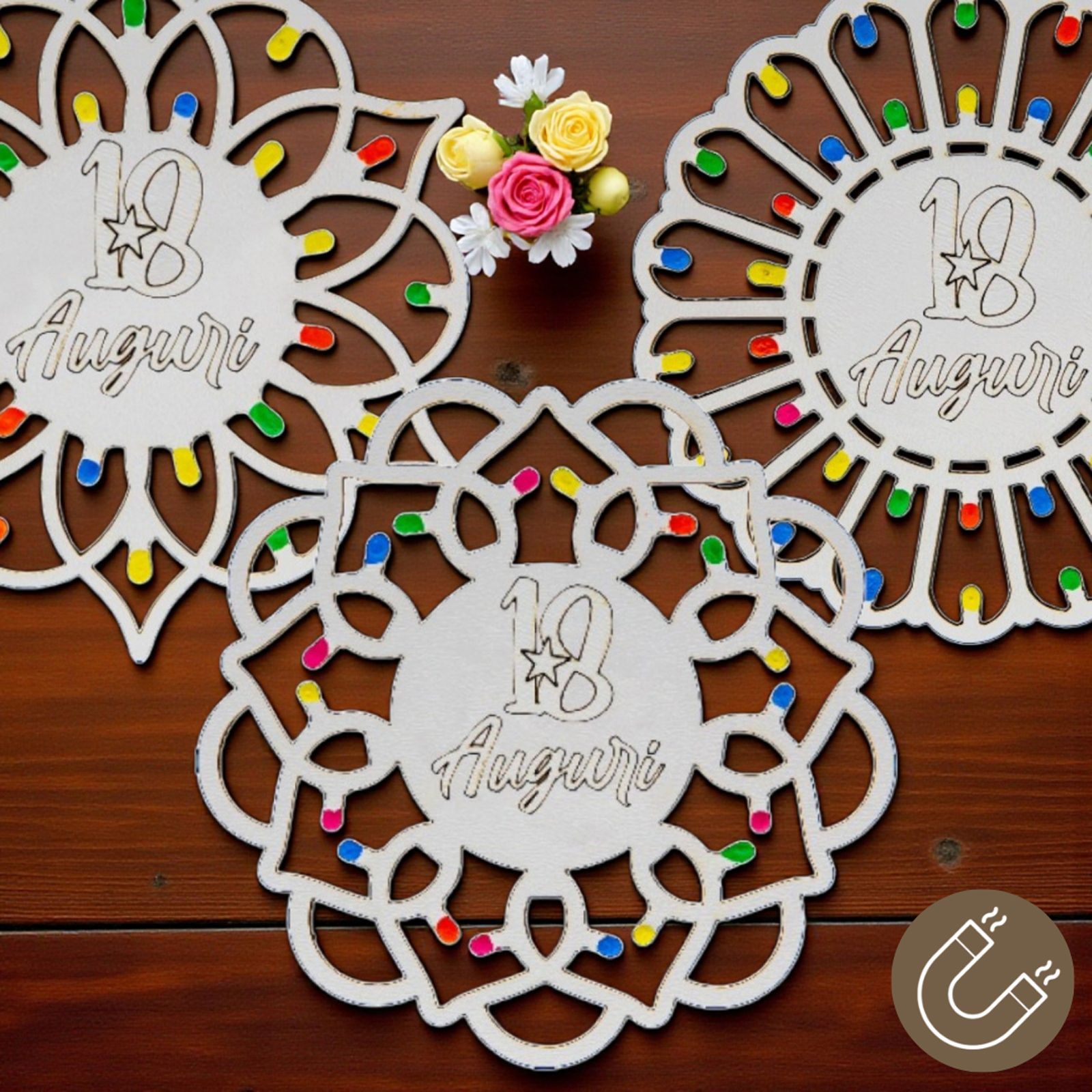 Rendi il tuo diciottesimo compleanno un evento indimenticabile con le nostre splendide bomboniere 18 anni! Questi magneti a forma di rosoni, ispirati alle tradizionali luminarie pugliesi, sono un omaggio perfetto per celebrare la tua entrata nell'età adulta. Ogni calamita è un simbolo di festa e gioia, un ricordo tangibile del tuo giorno speciale da donare agli amici e ai familiari.